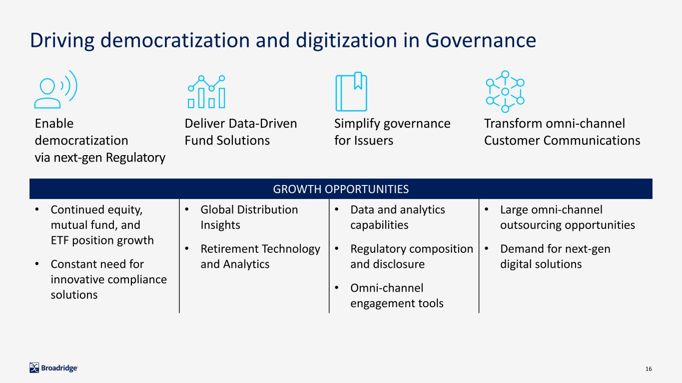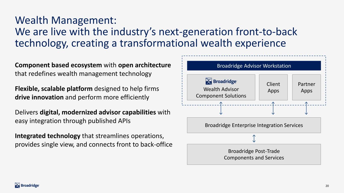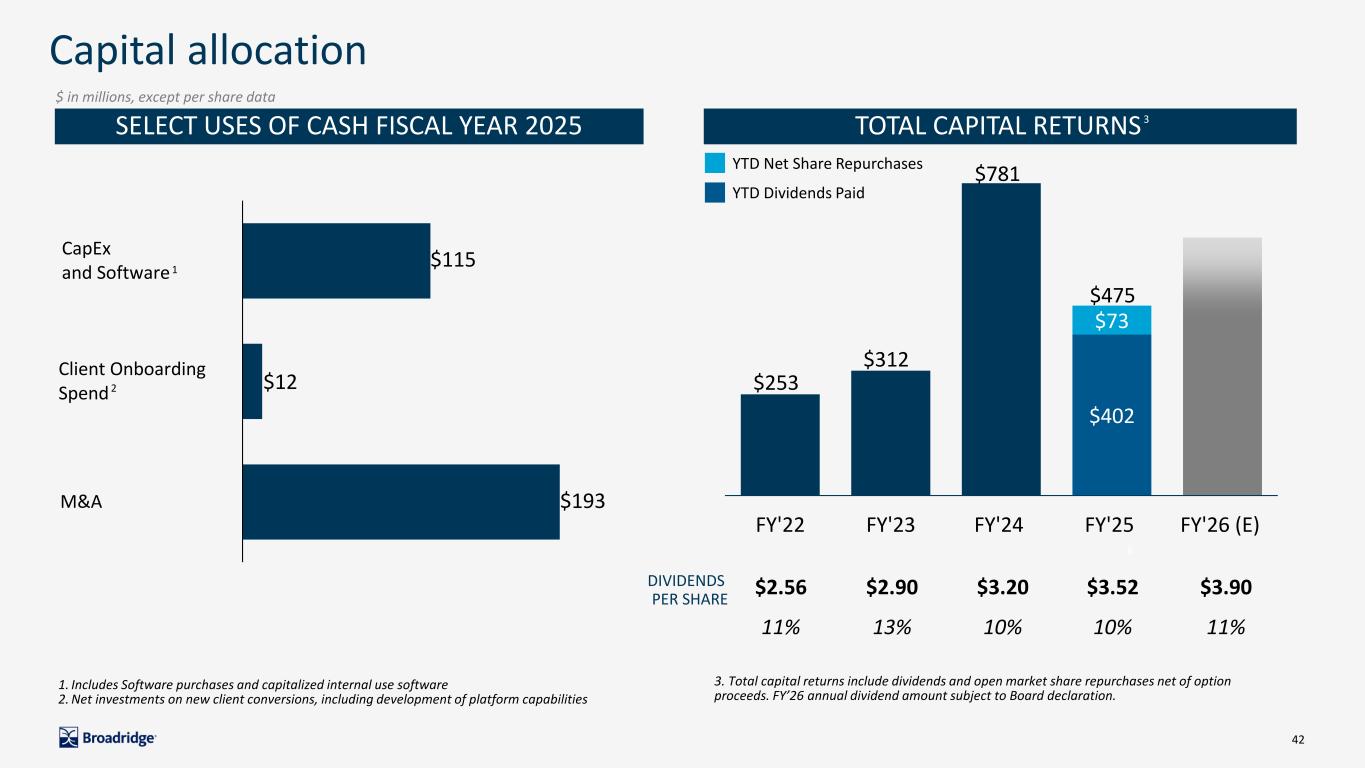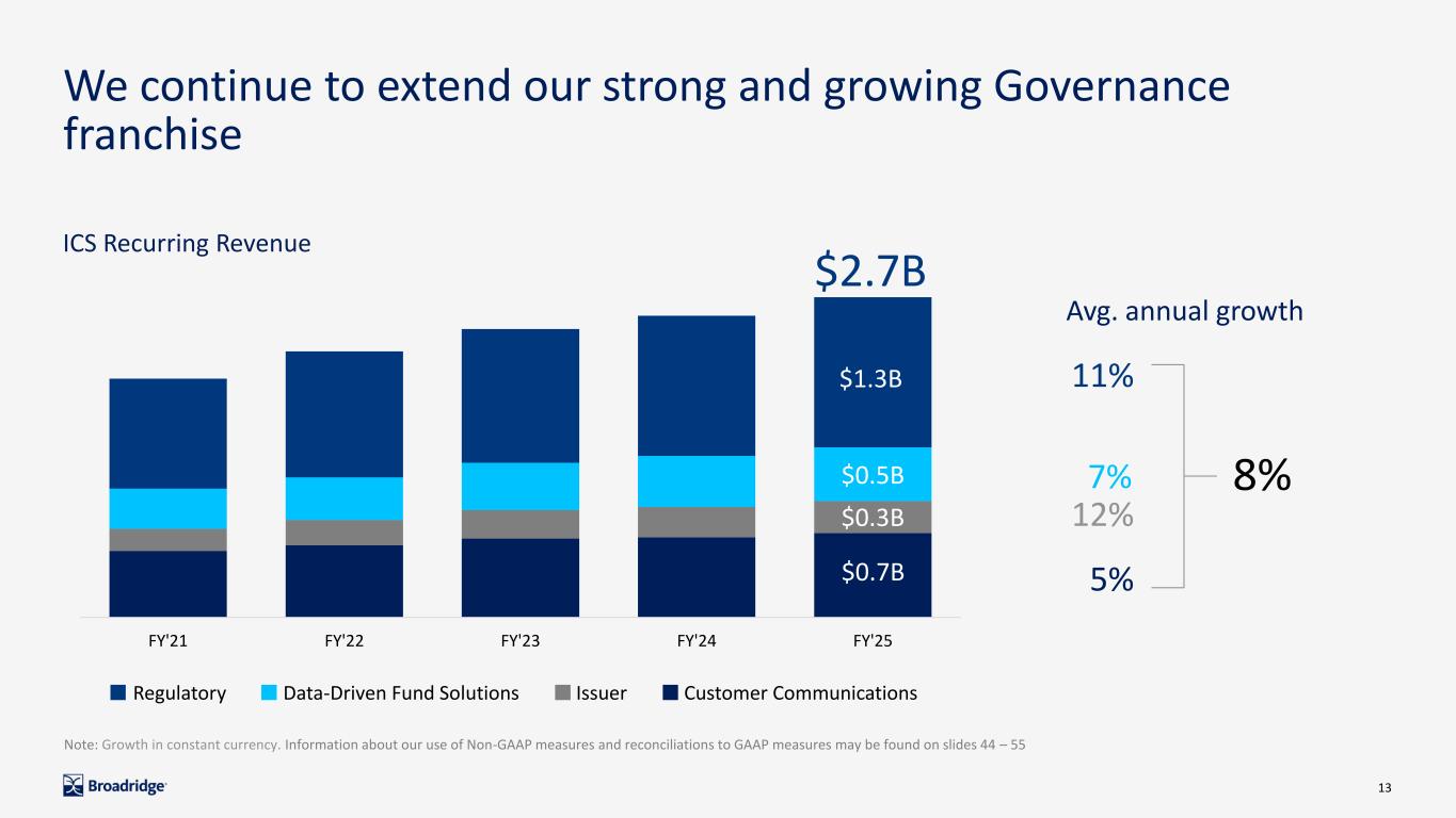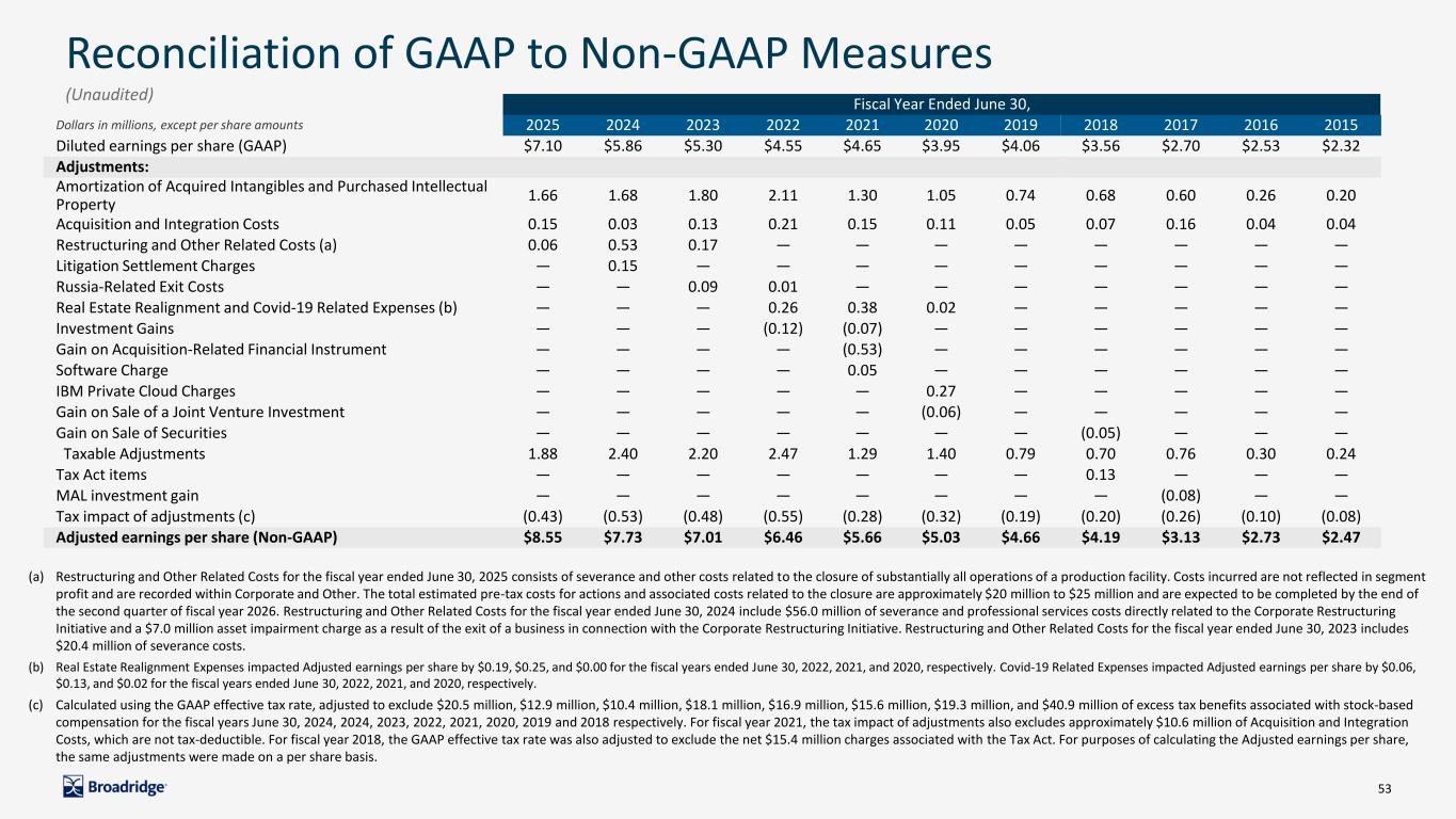 2 Forward-Looking Statements This presentation and other written or oral statements made from time to time by representatives of Broadridge Financial Solutions, Inc. ("Broadridge" or the "Company") contains “forward-looking statements” within the meaning of the Private Securities Litigation Reform Act of 1995. Statements that are not historical in nature, and which may be identified by the use of words such as “expects,” “assumes,” “projects,” “anticipates,” “estimates,” “we believe,” “could be,” “on track,” and other words of similar meaning are forward-looking statements. In particular, information appearing in the “Fiscal Year 2026 Guidance” section and statements about our three-year objectives are forward-looking statements. These statements are based on management’s expectations and assumptions and are subject to risks and uncertainties that may cause actual results to differ materially from those expressed. These risks and uncertainties include those risk factors described and discussed in Part I, “Item 1A. Risk Factors” of the Annual Report on Form 10-K for the year ended June 30, 2025 (the “2025 Annual Report”), as they may be updated in any future reports filed with the Securities and Exchange Commission. All forward-looking statements speak only as of the date of this presentation and are expressly qualified in their entirety by reference to the factors discussed in the 2025 Annual Report. These risks include: • Changes in laws and regulations affecting Broadridge’s clients or the services provided by Broadridge; • Broadridge’s reliance on a relatively small number of clients, the continued financial health of those clients, and the continued use by such clients of Broadridge’s services with favorable pricing terms; • A material security breach or cybersecurity attack affecting the information of Broadridge's clients; • Declines in participation and activity in the securities markets; • The failure of Broadridge's key service providers to provide the anticipated levels of service; • A disaster or other significant slowdown or failure of Broadridge’s systems or error in the performance of Broadridge’s services; • Overall market, economic and geopolitical conditions and their impact on the securities markets; • The success of Broadridge in retaining and selling additional services to its existing clients and in obtaining new clients; • Broadridge’s failure to keep pace with changes in technology and demands of its clients; • Competitive conditions; • Broadridge’s ability to attract and retain key personnel; and • The impact of new acquisitions and divestitures. There may be other factors that may cause our actual results to differ materially from the forward-looking statements. Our actual results, performance or achievements could differ materially from those expressed in, or implied by, the forward-looking statements. We can give no assurances that any of the events anticipated by the forward-looking statements will occur or, if any of them do, what impact they will have on our results of operations and financial condition. Broadridge disclaims any obligation to update or revise forward-looking statements that may be made to reflect events or circumstances that arise after the date made or to reflect the occurrence of unanticipated events, other than as required by law.