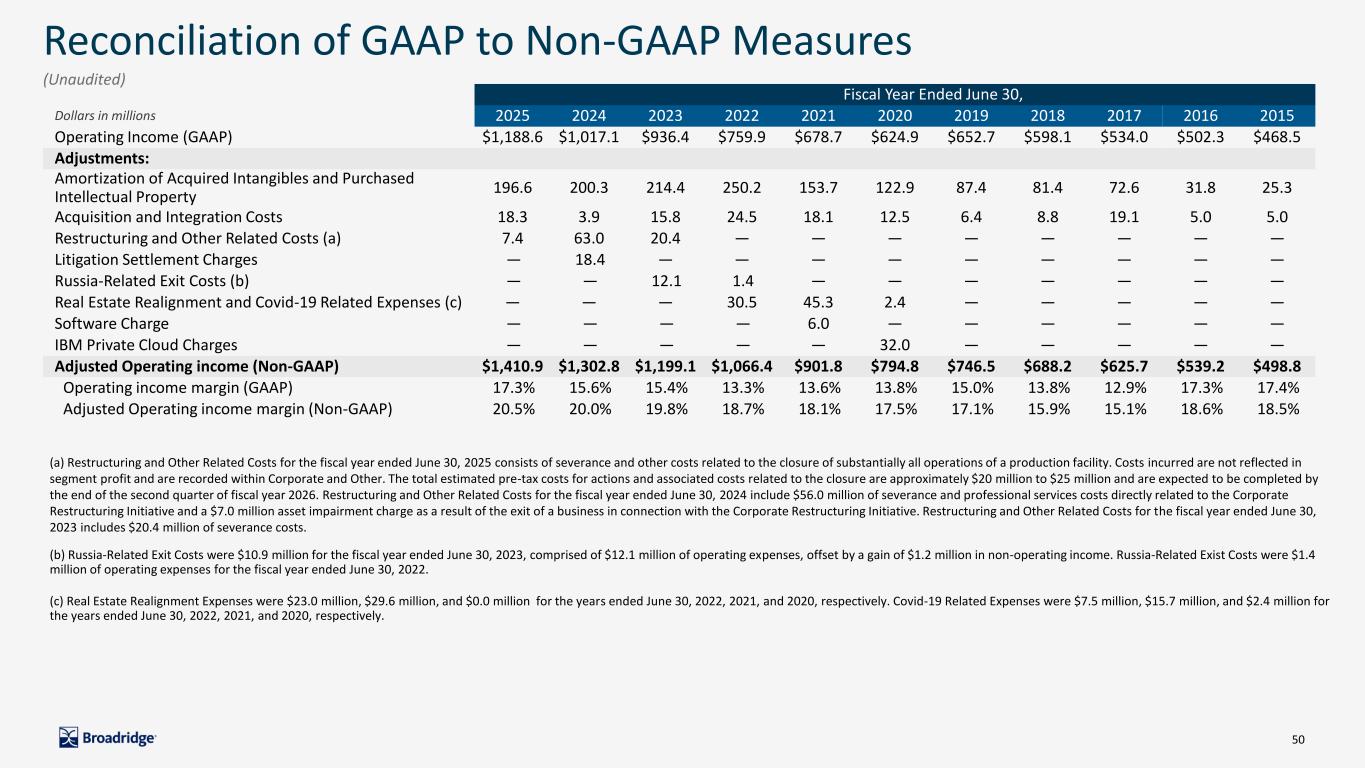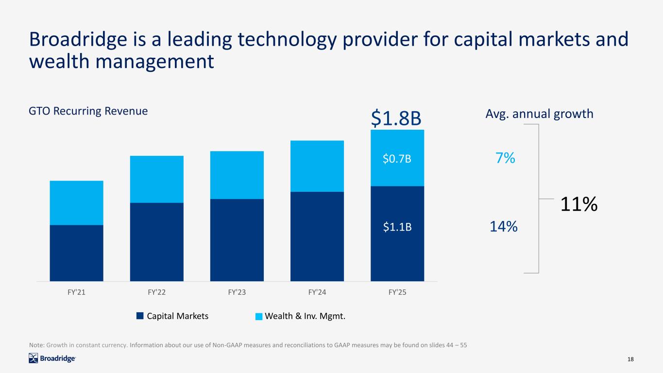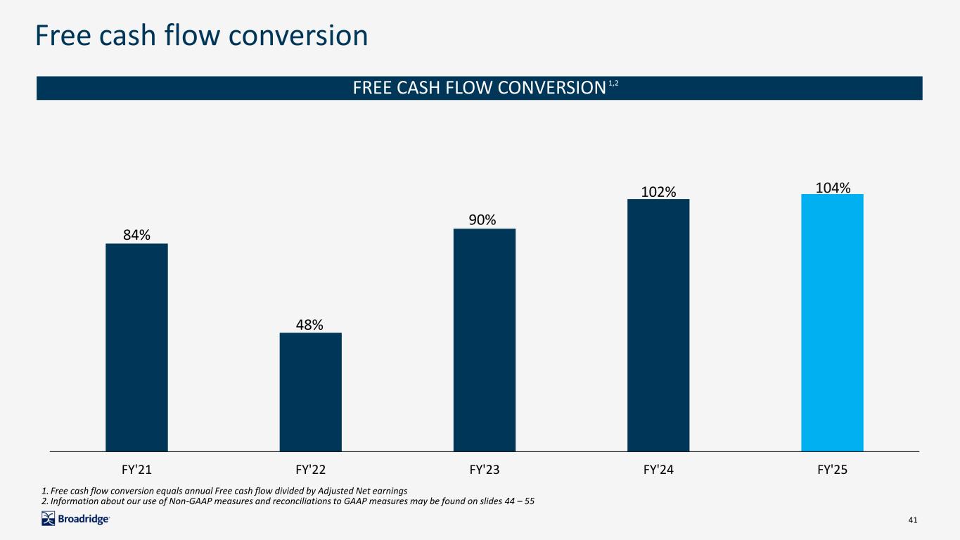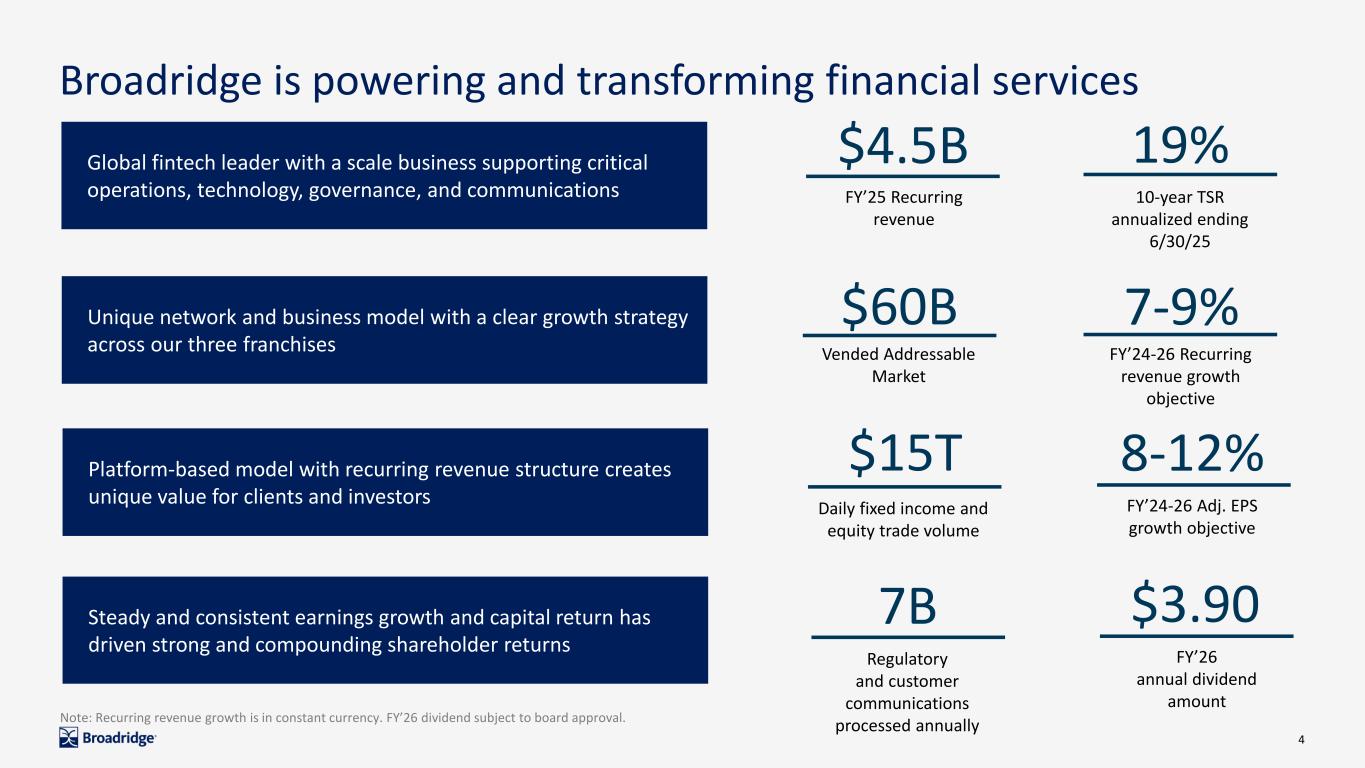 3 Use of Non-GAAP financial Measures, KPIs and foreign exchange rates Use of Non-GAAP Financial Measures This presentation includes certain Non-GAAP financial measures including Adjusted Operating income, Adjusted Operating income margin, Adjusted Net earnings, Adjusted earnings per share (“EPS”), Free cash flow, Free cash flow conversion, and Recurring revenue growth constant currency. Please see the “Explanation of Non-GAAP Measures and Reconciliation of GAAP to Non-GAAP Measures” section of this presentation for more information on Broadridge’s use of Non-GAAP measures and reconciliations to GAAP measures. Key Performance Indicators Management focuses on a variety of key indicators to plan, measure and evaluate the Company’s business and financial performance. These performance indicators include Revenues and Recurring revenue, as well as Non-GAAP measures of Adjusted Operating income, Adjusted Net earnings, Adjusted EPS, Free cash flow, Free cash flow conversion, Recurring revenue growth constant currency, and Closed sales. In addition, management focuses on select operating metrics specific to Broadridge of Position Growth, which is comprised of equity position growth and mutual fund/ETF position growth, and Internal Trade Growth. Beginning in the fourth quarter of fiscal year 2025, the Company began presenting information on “equity revenue position growth”. Equity revenue position growth excludes small or fractional equity positions for which the Company does not recognize revenue (“non-revenue positions”). Prior-year period comparative information for this metric is not available. Please refer to Item 2. Management’s Discussion and Analysis of Financial Condition of the 2025 Annual Report for a discussion of Revenues, Recurring revenue, Position Growth and Internal Trade Growth in the “Key Performance Indicators” section and the “Results of Operations” section for a description of Closed sales. Foreign Exchange Rates Beginning with the first quarter of fiscal year 2023, the Company changed reporting for segment revenues, segment earnings (loss) before income taxes, segment amortization of acquired intangibles and purchased intellectual property, and Closed sales to reflect the impact of actual foreign exchange rates applicable to the individual periods presented. The presentation of these metrics for the prior periods has been changed to conform to the current period presentation. Total consolidated revenues and earnings before income taxes were not impacted. Notes on Presentation Amounts presented in this presentation may not sum due to rounding. All FY’25 Recurring revenue dollar amounts shown in this presentation are GAAP. Recurring revenue growth percentages for FY’23, FY’24, FY’25 and FY’26 Guidance are shown as constant currency (Non- GAAP). Recurring revenue growth percentages for FY’16 through FY’22 are calculated based on constant foreign currency exchange rates used for internal management reporting as described in the Company’s segment footnote within its Form 10-K for each respective year. Use of Material Contained Herein The information contained in this presentation is being provided for your convenience and information only. This information is accurate as of the date of its initial presentation. If you plan to use this information for any purpose, verification of its continued accuracy is your responsibility. Broadridge assumes no duty to update or revise the information contained in this presentation.