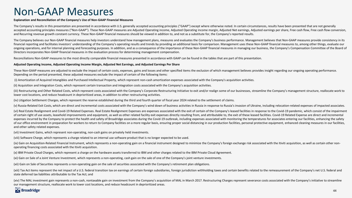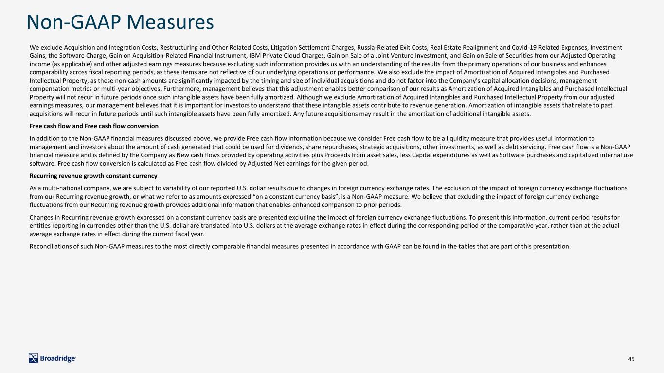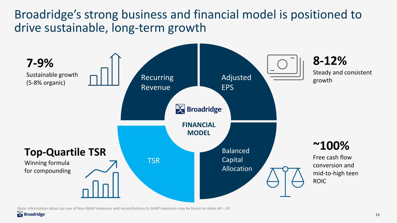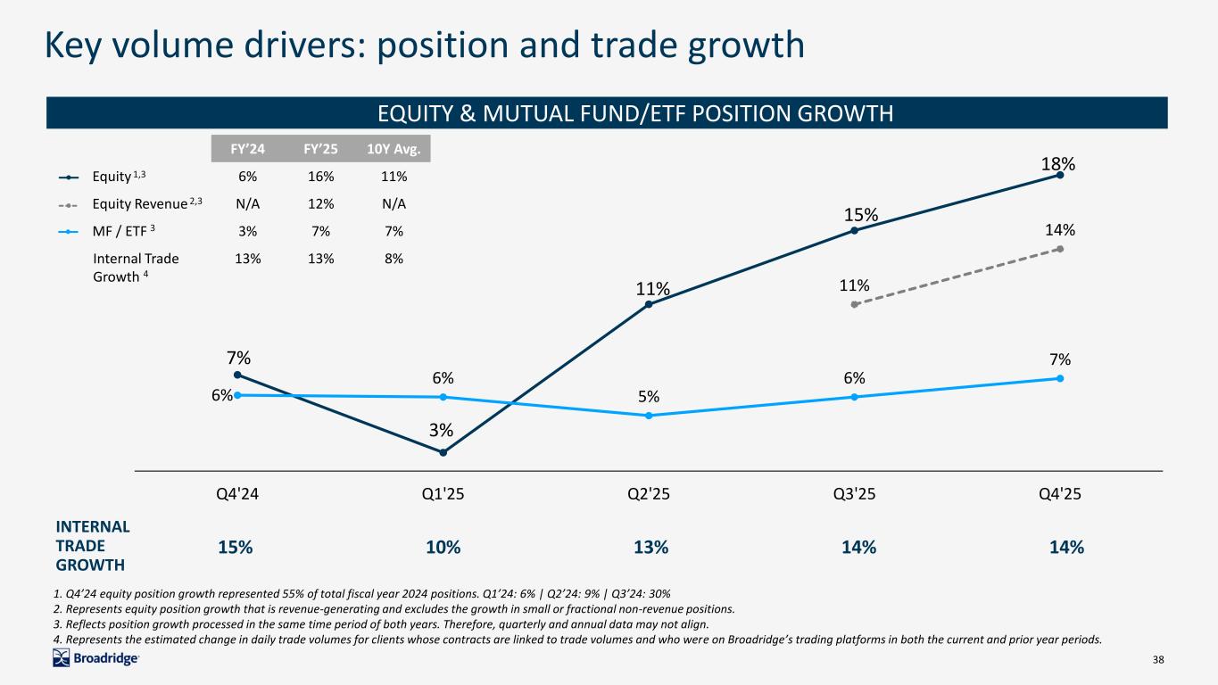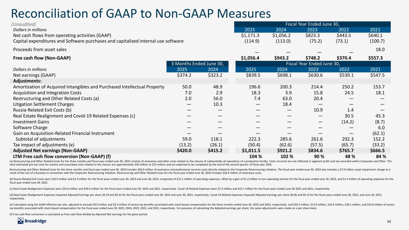 3 Use of Non-GAAP financial Measures, KPIs and foreign exchange rates Use of Non-GAAP Financial Measures This presentation includes certain Non-GAAP financial measures including Adjusted Operating income, Adjusted Operating income margin, Adjusted Net earnings, Adjusted earnings per share (“EPS”), Free cash flow, Free cash flow conversion, and Recurring revenue growth constant currency. Please see the “Explanation of Non-GAAP Measures and Reconciliation of GAAP to Non-GAAP Measures” section of this presentation for more information on Broadridge’s use of Non-GAAP measures and reconciliations to GAAP measures. Key Performance Indicators Management focuses on a variety of key indicators to plan, measure and evaluate the Company’s business and financial performance. These performance indicators include Revenues and Recurring revenue, as well as Non-GAAP measures of Adjusted Operating income, Adjusted Net earnings, Adjusted EPS, Free cash flow, Free cash flow conversion, Recurring revenue growth constant currency, and Closed sales. In addition, management focuses on select operating metrics specific to Broadridge of Position Growth, which is comprised of equity position growth and mutual fund/ETF position growth, and Internal Trade Growth. Beginning in the fourth quarter of fiscal year 2025, the Company began presenting information on “equity revenue position growth”. Equity revenue position growth excludes small or fractional equity positions for which the Company does not recognize revenue (“non-revenue positions”). Prior-year period comparative information for this metric is not available. Please refer to Item 2. Management’s Discussion and Analysis of Financial Condition of the 2025 Annual Report for a discussion of Revenues, Recurring revenue, Position Growth and Internal Trade Growth in the “Key Performance Indicators” section and the “Results of Operations” section for a description of Closed sales. Foreign Exchange Rates Beginning with the first quarter of fiscal year 2023, the Company changed reporting for segment revenues, segment earnings (loss) before income taxes, segment amortization of acquired intangibles and purchased intellectual property, and Closed sales to reflect the impact of actual foreign exchange rates applicable to the individual periods presented. The presentation of these metrics for the prior periods has been changed to conform to the current period presentation. Total consolidated revenues and earnings before income taxes were not impacted. Notes on Presentation Amounts presented in this presentation may not sum due to rounding. All FY’25 Recurring revenue dollar amounts shown in this presentation are GAAP. Recurring revenue growth percentages for FY’23, FY’24, FY’25 and FY’26 Guidance are shown as constant currency (Non- GAAP). Recurring revenue growth percentages for FY’16 through FY’22 are calculated based on constant foreign currency exchange rates used for internal management reporting as described in the Company’s segment footnote within its Form 10-K for each respective year. Use of Material Contained Herein The information contained in this presentation is being provided for your convenience and information only. This information is accurate as of the date of its initial presentation. If you plan to use this information for any purpose, verification of its continued accuracy is your responsibility. Broadridge assumes no duty to update or revise the information contained in this presentation.
