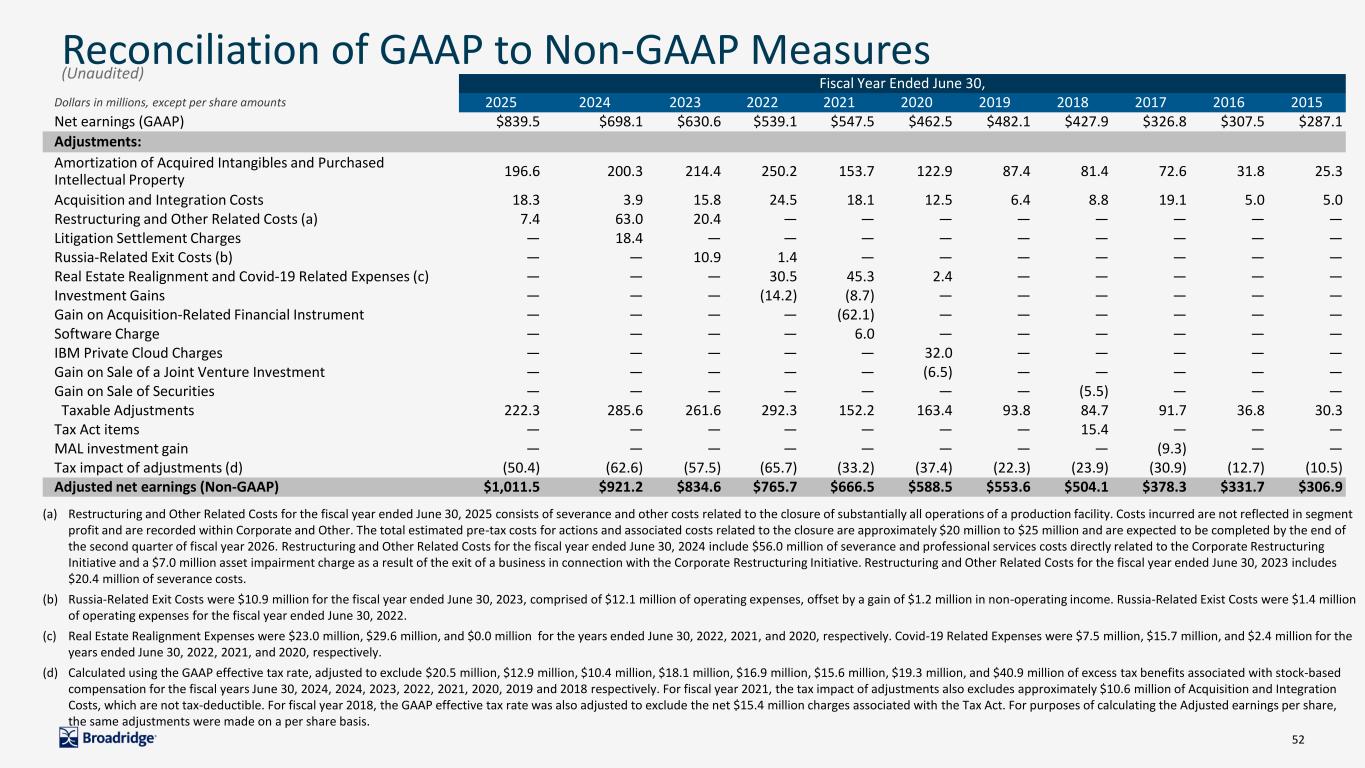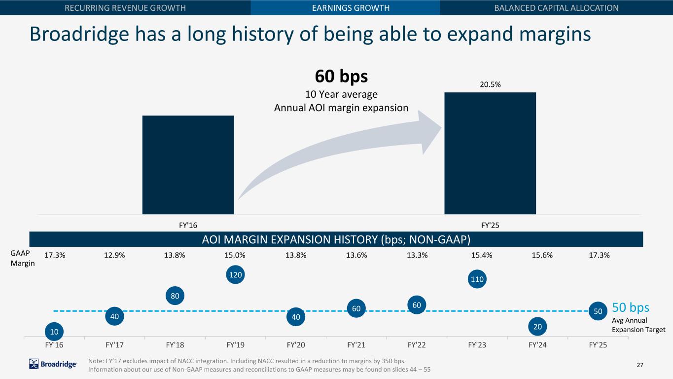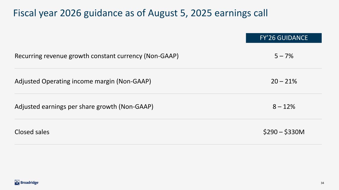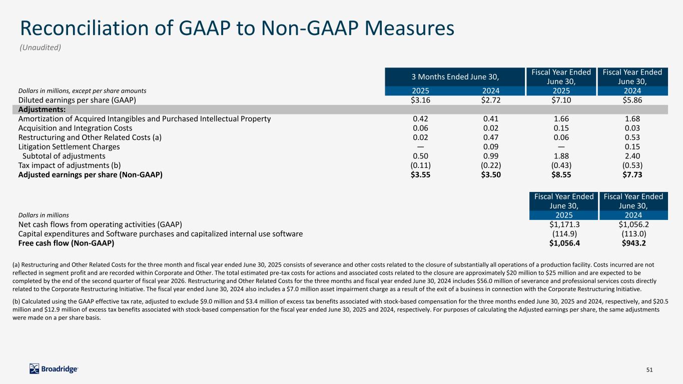 3 Use of Non-GAAP financial Measures, KPIs and foreign exchange rates Use of Non-GAAP Financial Measures This presentation includes certain Non-GAAP financial measures including Adjusted Operating income, Adjusted Operating income margin, Adjusted Net earnings, Adjusted earnings per share (“EPS”), Free cash flow, Free cash flow conversion, and Recurring revenue growth constant currency. Please see the “Explanation of Non-GAAP Measures and Reconciliation of GAAP to Non-GAAP Measures” section of this presentation for more information on Broadridge’s use of Non-GAAP measures and reconciliations to GAAP measures. Key Performance Indicators Management focuses on a variety of key indicators to plan, measure and evaluate the Company’s business and financial performance. These performance indicators include Revenues and Recurring revenue, as well as Non-GAAP measures of Adjusted Operating income, Adjusted Net earnings, Adjusted EPS, Free cash flow, Free cash flow conversion, Recurring revenue growth constant currency, and Closed sales. In addition, management focuses on select operating metrics specific to Broadridge of Position Growth, which is comprised of equity position growth and mutual fund/ETF position growth, and Internal Trade Growth. Beginning in the fourth quarter of fiscal year 2025, the Company began presenting information on “equity revenue position growth”. Equity revenue position growth excludes small or fractional equity positions for which the Company does not recognize revenue (“non-revenue positions”). Prior-year period comparative information for this metric is not available. Please refer to Item 2. Management’s Discussion and Analysis of Financial Condition of the 2025 Annual Report for a discussion of Revenues, Recurring revenue, Position Growth and Internal Trade Growth in the “Key Performance Indicators” section and the “Results of Operations” section for a description of Closed sales. Foreign Exchange Rates Beginning with the first quarter of fiscal year 2023, the Company changed reporting for segment revenues, segment earnings (loss) before income taxes, segment amortization of acquired intangibles and purchased intellectual property, and Closed sales to reflect the impact of actual foreign exchange rates applicable to the individual periods presented. The presentation of these metrics for the prior periods has been changed to conform to the current period presentation. Total consolidated revenues and earnings before income taxes were not impacted. Notes on Presentation Amounts presented in this presentation may not sum due to rounding. All FY’25 Recurring revenue dollar amounts shown in this presentation are GAAP. Recurring revenue growth percentages for FY’23, FY’24, FY’25 and FY’26 Guidance are shown as constant currency (Non- GAAP). Recurring revenue growth percentages for FY’16 through FY’22 are calculated based on constant foreign currency exchange rates used for internal management reporting as described in the Company’s segment footnote within its Form 10-K for each respective year. Use of Material Contained Herein The information contained in this presentation is being provided for your convenience and information only. This information is accurate as of the date of its initial presentation. If you plan to use this information for any purpose, verification of its continued accuracy is your responsibility. Broadridge assumes no duty to update or revise the information contained in this presentation.