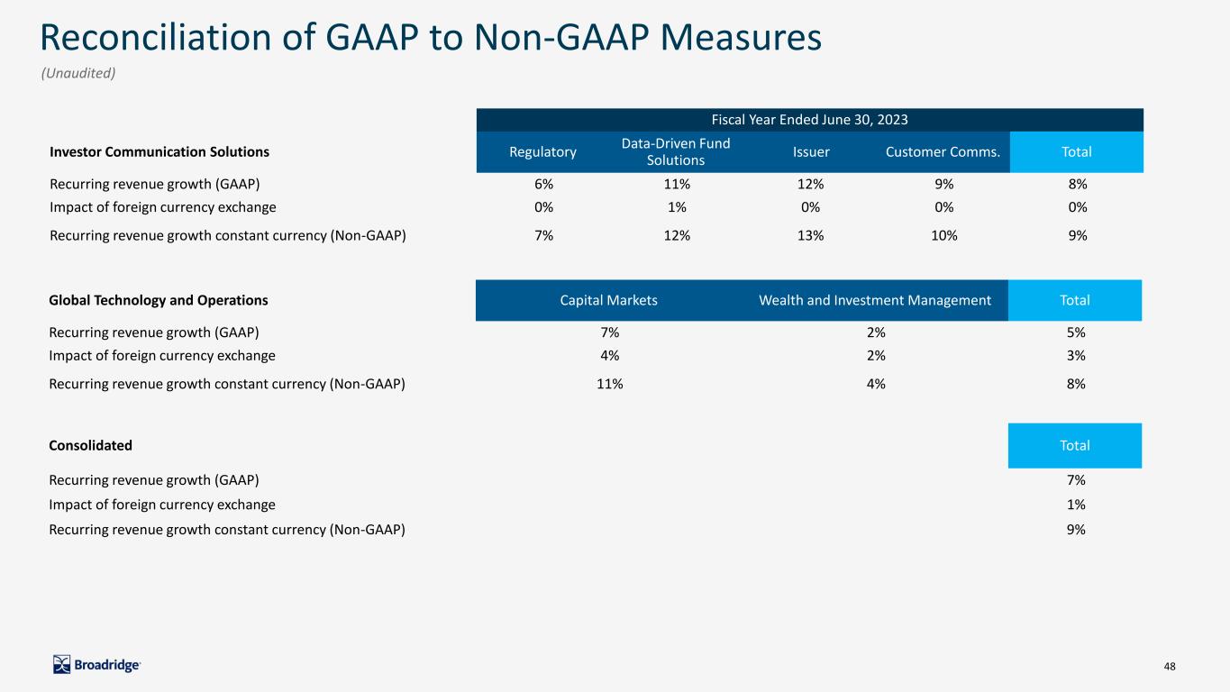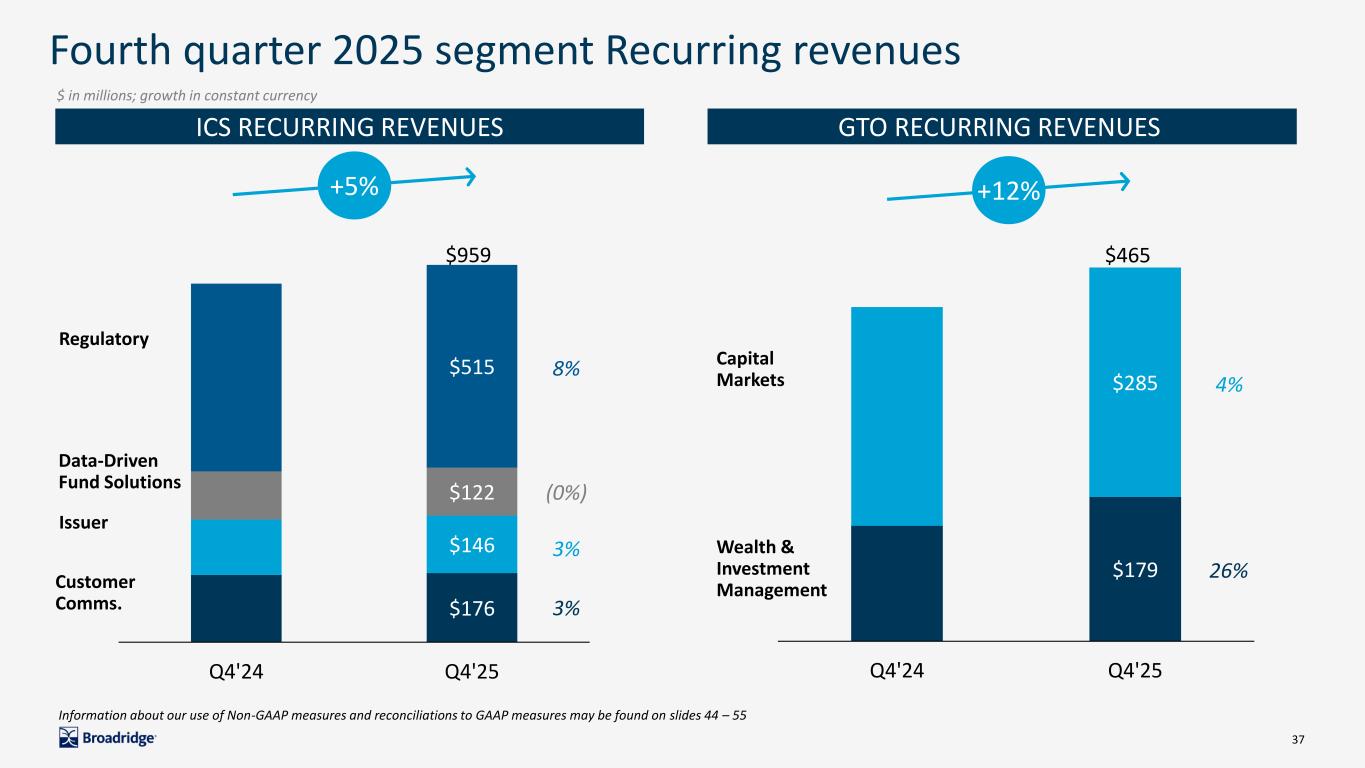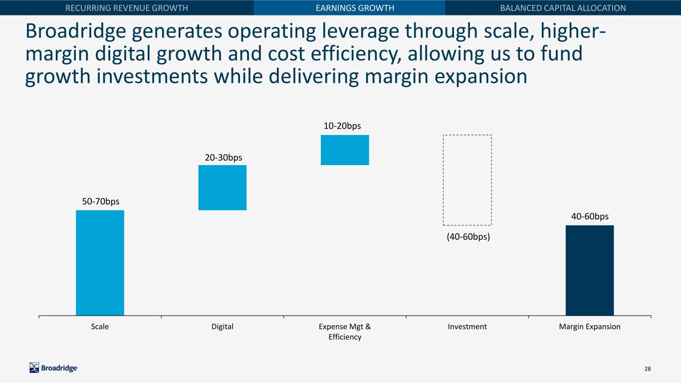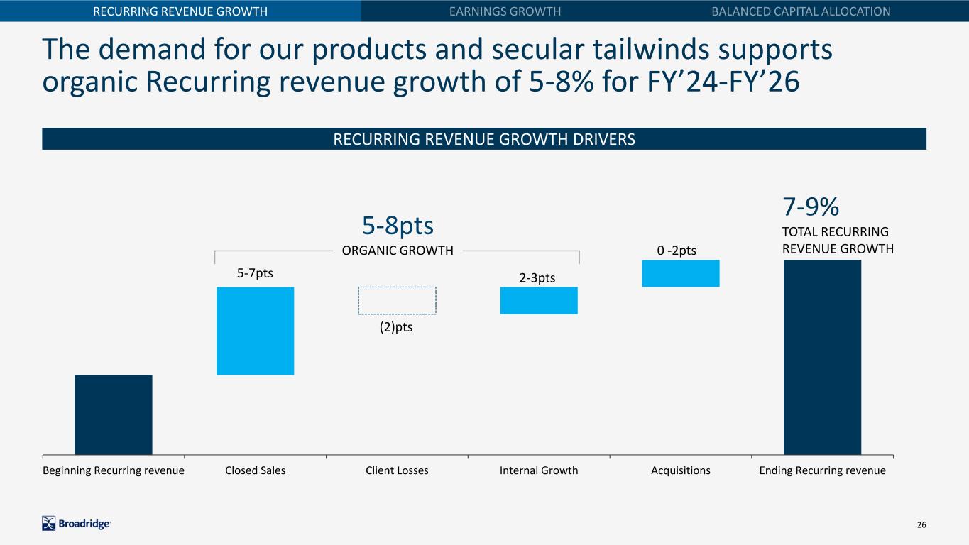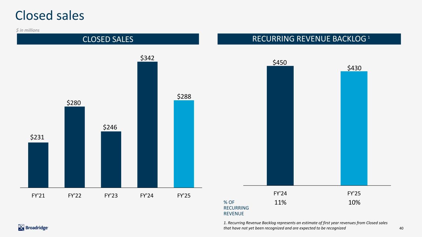 3 Use of Non-GAAP financial Measures, KPIs and foreign exchange rates Use of Non-GAAP Financial Measures This presentation includes certain Non-GAAP financial measures including Adjusted Operating income, Adjusted Operating income margin, Adjusted Net earnings, Adjusted earnings per share (“EPS”), Free cash flow, Free cash flow conversion, and Recurring revenue growth constant currency. Please see the “Explanation of Non-GAAP Measures and Reconciliation of GAAP to Non-GAAP Measures” section of this presentation for more information on Broadridge’s use of Non-GAAP measures and reconciliations to GAAP measures. Key Performance Indicators Management focuses on a variety of key indicators to plan, measure and evaluate the Company’s business and financial performance. These performance indicators include Revenues and Recurring revenue, as well as Non-GAAP measures of Adjusted Operating income, Adjusted Net earnings, Adjusted EPS, Free cash flow, Free cash flow conversion, Recurring revenue growth constant currency, and Closed sales. In addition, management focuses on select operating metrics specific to Broadridge of Position Growth, which is comprised of equity position growth and mutual fund/ETF position growth, and Internal Trade Growth. Beginning in the fourth quarter of fiscal year 2025, the Company began presenting information on “equity revenue position growth”. Equity revenue position growth excludes small or fractional equity positions for which the Company does not recognize revenue (“non-revenue positions”). Prior-year period comparative information for this metric is not available. Please refer to Item 2. Management’s Discussion and Analysis of Financial Condition of the 2025 Annual Report for a discussion of Revenues, Recurring revenue, Position Growth and Internal Trade Growth in the “Key Performance Indicators” section and the “Results of Operations” section for a description of Closed sales. Foreign Exchange Rates Beginning with the first quarter of fiscal year 2023, the Company changed reporting for segment revenues, segment earnings (loss) before income taxes, segment amortization of acquired intangibles and purchased intellectual property, and Closed sales to reflect the impact of actual foreign exchange rates applicable to the individual periods presented. The presentation of these metrics for the prior periods has been changed to conform to the current period presentation. Total consolidated revenues and earnings before income taxes were not impacted. Notes on Presentation Amounts presented in this presentation may not sum due to rounding. All FY’25 Recurring revenue dollar amounts shown in this presentation are GAAP. Recurring revenue growth percentages for FY’23, FY’24, FY’25 and FY’26 Guidance are shown as constant currency (Non- GAAP). Recurring revenue growth percentages for FY’16 through FY’22 are calculated based on constant foreign currency exchange rates used for internal management reporting as described in the Company’s segment footnote within its Form 10-K for each respective year. Use of Material Contained Herein The information contained in this presentation is being provided for your convenience and information only. This information is accurate as of the date of its initial presentation. If you plan to use this information for any purpose, verification of its continued accuracy is your responsibility. Broadridge assumes no duty to update or revise the information contained in this presentation.