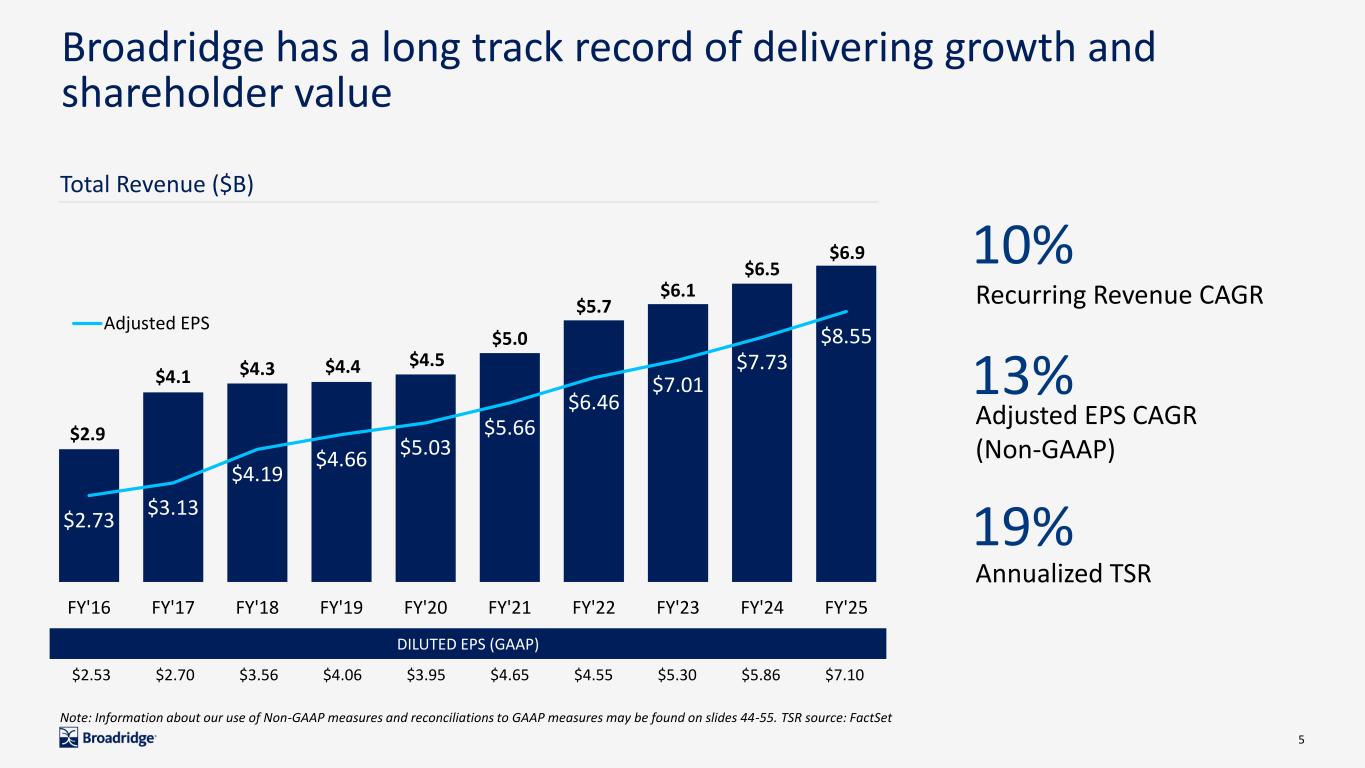 4 Broadridge is powering and transforming financial services Unique network and business model with a clear growth strategy across our three franchises Platform-based model with recurring revenue structure creates unique value for clients and investors Steady and consistent earnings growth and capital return has driven strong and compounding shareholder returns $4.5B FY’25 Recurring revenue 7-9% FY’24-26 Recurring revenue growth objective $60B Vended Addressable Market Global fintech leader with a scale business supporting critical operations, technology, governance, and communications $15T Daily fixed income and equity trade volume 8-12% FY’24-26 Adj. EPS growth objective 19% 10-year TSR annualized ending 6/30/25 $3.90 FY’26 annual dividend amount 7B Regulatory and customer communications processed annuallyNote: Recurring revenue growth is in constant currency. FY’26 dividend subject to board approval.