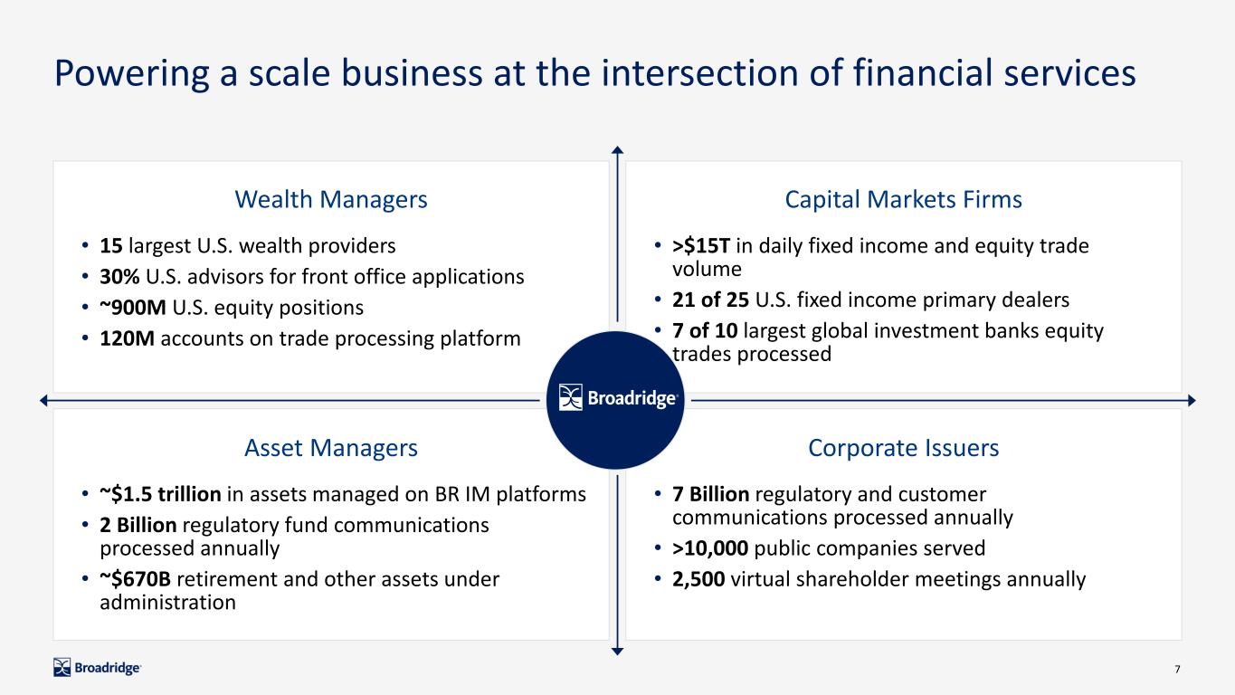 6 We have a unique network and business model Regulatory Bodies & Trade Associations Broker-dealers & Wealth Managers Investors Public Companies & Funds 10,000+ Corporate issuers 1,000+ Banks and broker-dealers 30,000+ Mutual funds and ETFs 200,000+ Financial advisors 150,000+ Institutional shareholders 200M+ Retail shareholder accounts