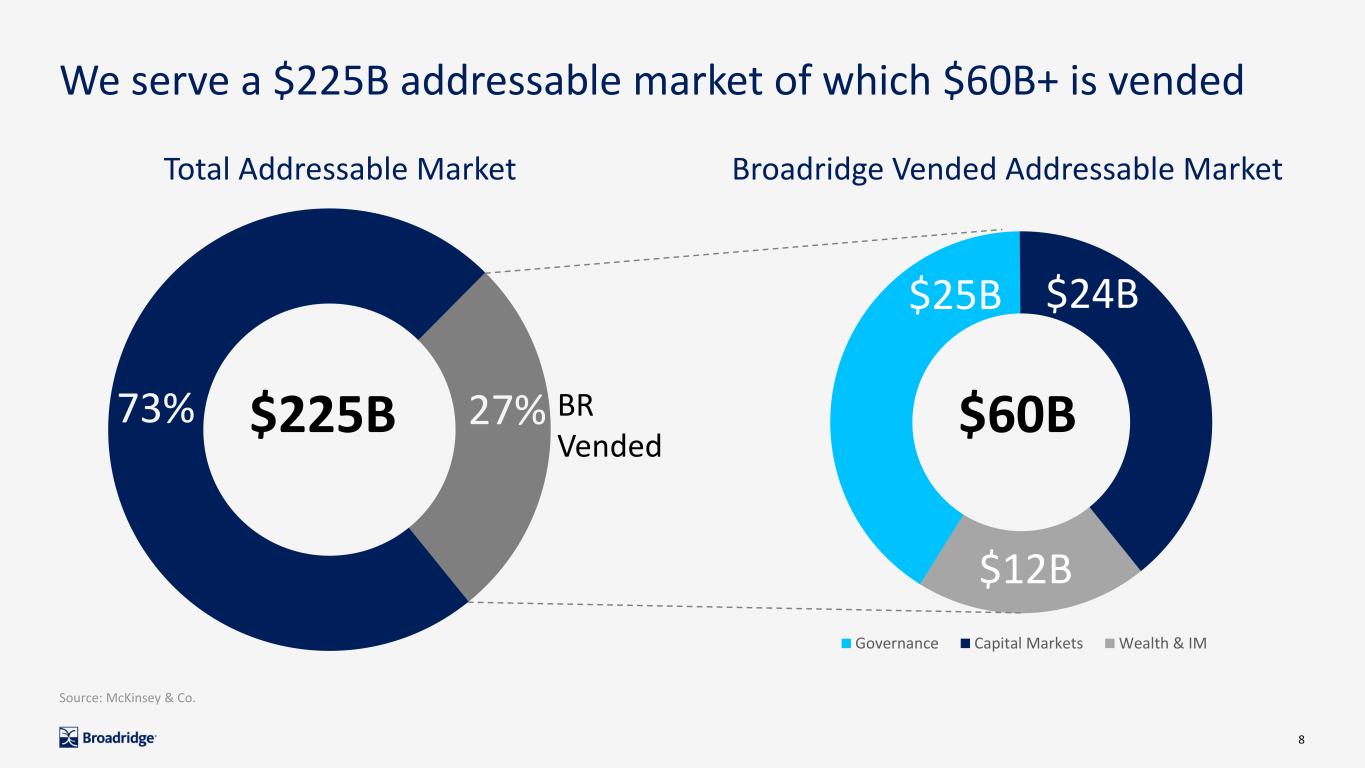 8 We serve a $225B addressable market of which $60B+ is vended Source: McKinsey & Co. Governance Capital Markets Wealth & IM $25B $24B Broadridge Vended Addressable Market 27%73% Total Addressable Market $12B $225B $60BBR Vended
