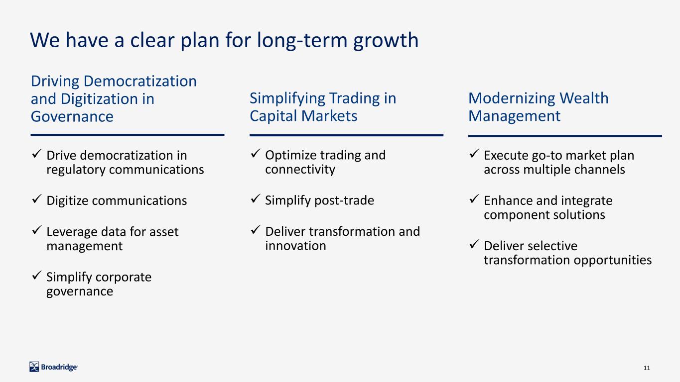 10 We have aligned our business around these long-term drivers Extend Governance ▪ Scaled to enable doubling of equity and fund positions ▪ Crossed $100M threshold in digital revenues ▪ Expanded data & analytics with European fund data, board reporting ▪ Extended our capabilities across the entire trade lifecycle with BTCS ▪ Grew post-trade platforms globally ▪ Innovated to create leading position in Distributed Ledger Repo ▪ Delivered on next-gen wealth management platform ▪ Strengthened our capabilities serving Canadian wealth managers ▪ Added front-office capabilities with targeted tuck-in M&A ▪ Grew international revenues 5X to $518M from FY2015-25 ▪ Strengthened international footprint with acquisition of BTCS ▪ Grew European governance capabilities with Shareholder Rights Directive II Grow Capital Markets Build Wealth Expand International