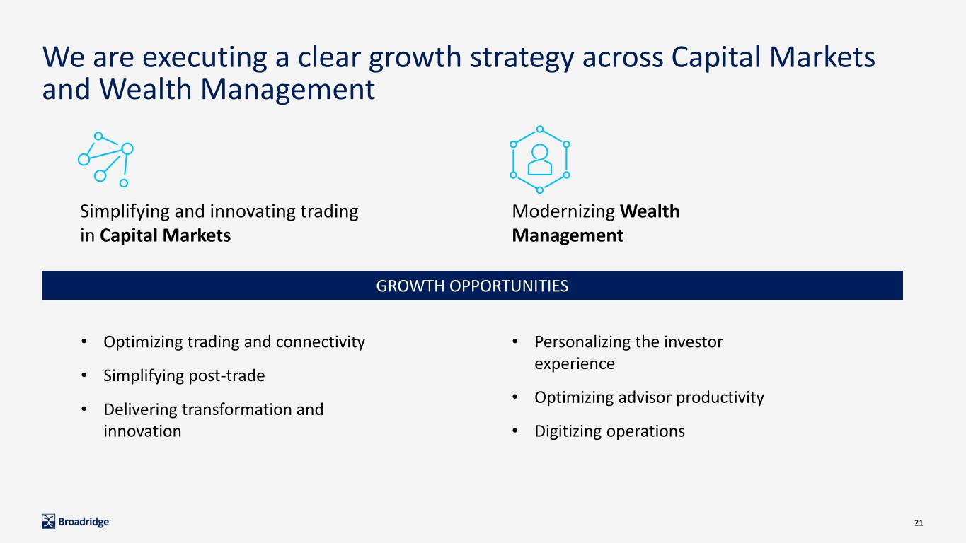 7 Powering a scale business at the intersection of financial services Wealth Managers 30,000+ Mutual funds and ETFs 120,000+ Institutional shareholders 170M+ Retail shareholder accounts Capital Markets Firms Asset Managers Corporate Issuers • 15 largest U.S. wealth providers • 30% U.S. advisors for front office applications • ~900M U.S. equity positions • 120M accounts on trade processing platform • >$15T in daily fixed income and equity trade volume • 21 of 25 U.S. fixed income primary dealers • 7 of 10 largest global investment banks equity trades processed • ~$1.5 trillion in assets managed on BR IM platforms • 2 Billion regulatory fund communications processed annually • ~$670B retirement and other assets under administration • 7 Billion regulatory and customer communications processed annually • >10,000 public companies served • 2,500 virtual shareholder meetings annually