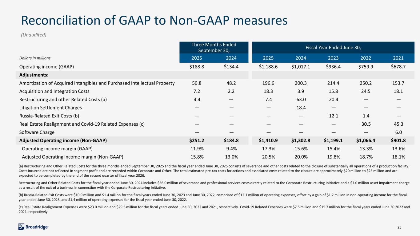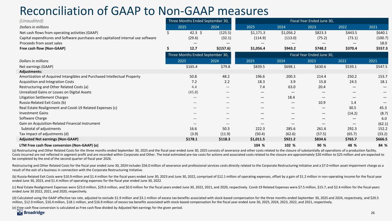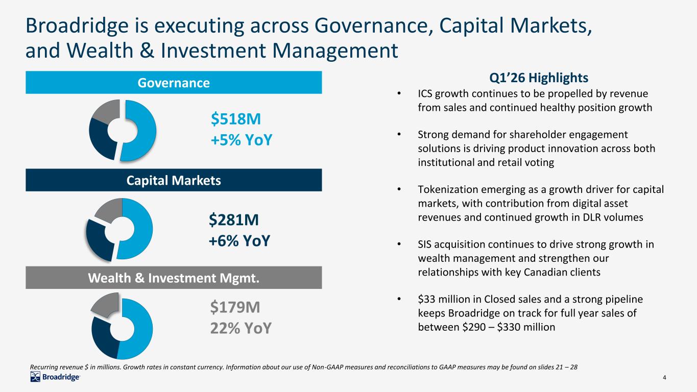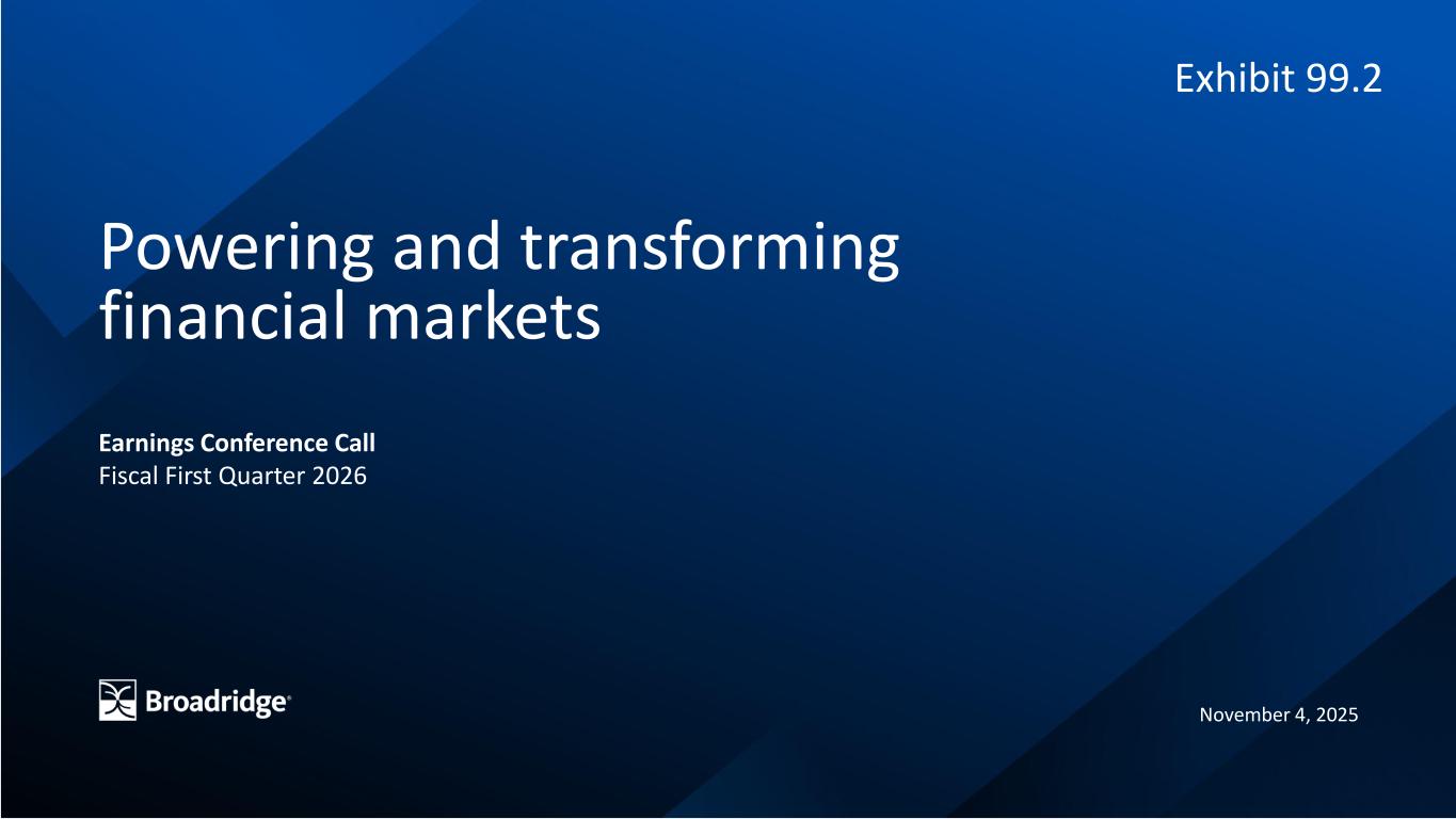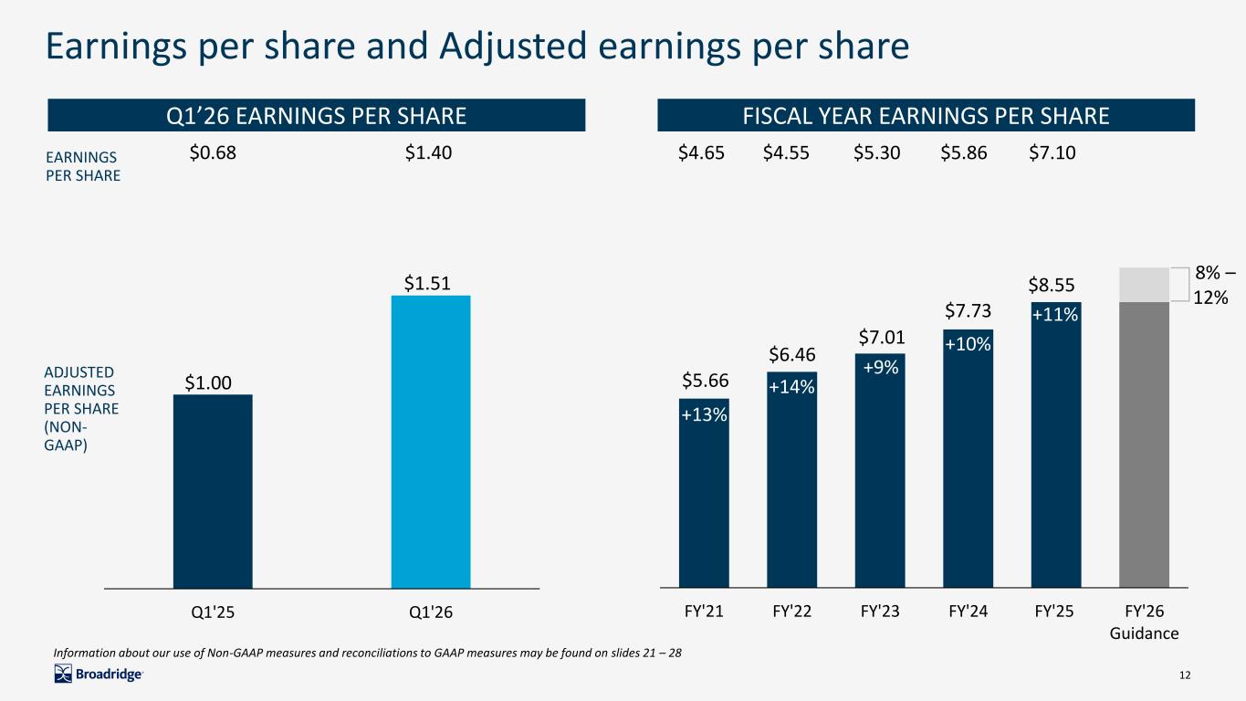 ニューヨーク、2025年11月4日 - ブロードリッジ・ファイナンシャル・ソリューションズ・インク(NYSE:BR)は本日、2026会計年度第1四半期(2025年9月30日に終了)の業績を発表しました。前年同期と比較した業績は以下のとおりです:
