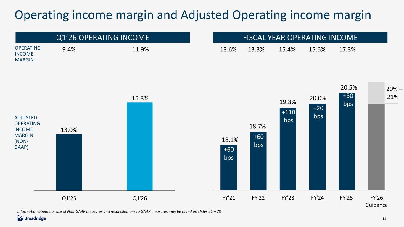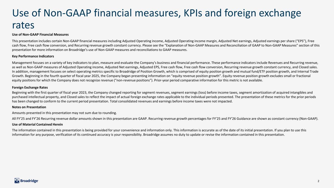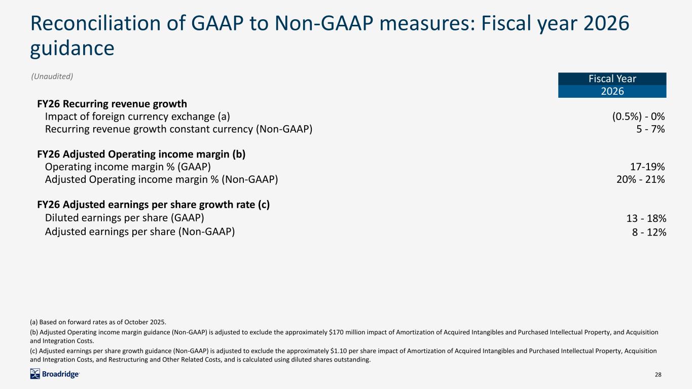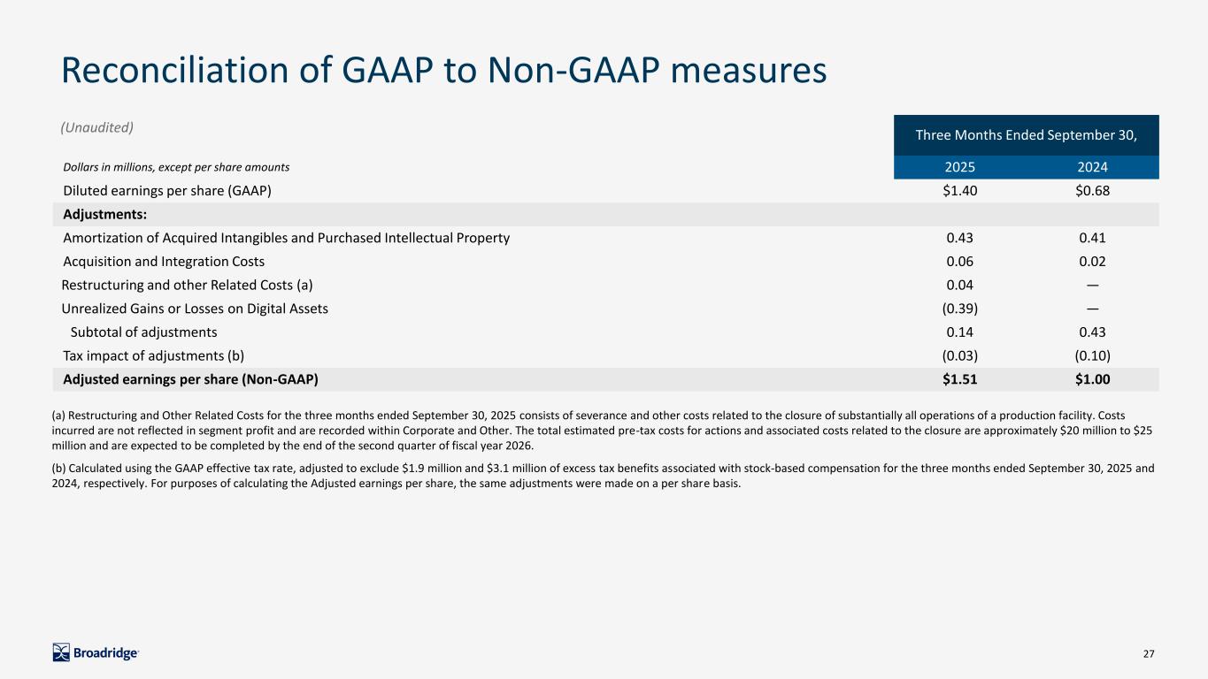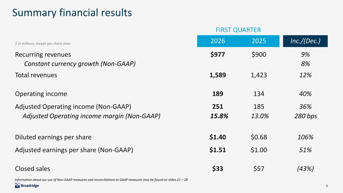 ニューヨーク、2025年11月4日 - ブロードリッジ・ファイナンシャル・ソリューションズ・インク(NYSE:BR)は本日、2026会計年度第1四半期(2025年9月30日に終了)の業績を発表しました。前年同期と比較した業績は以下のとおりです: