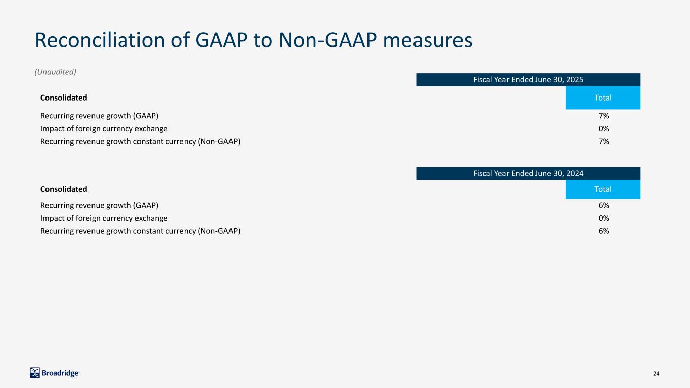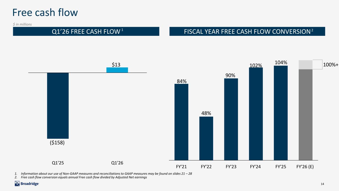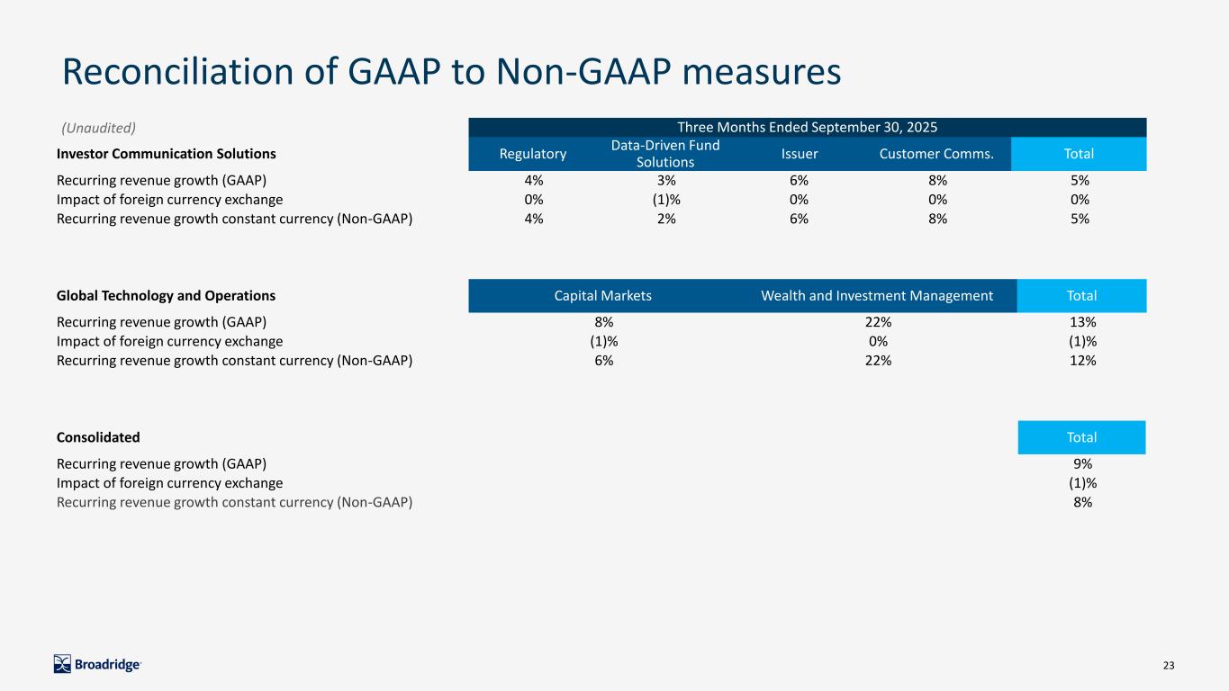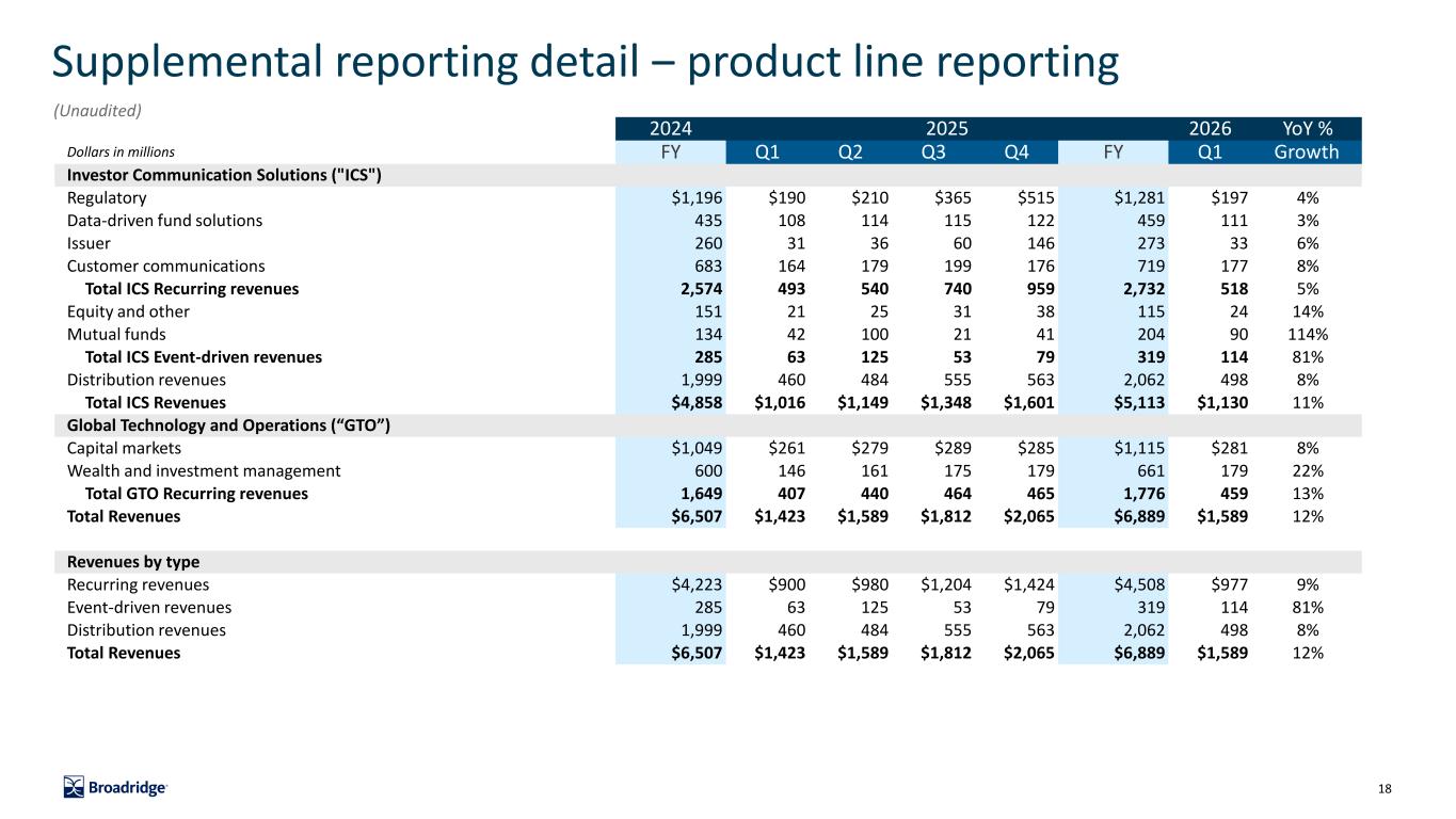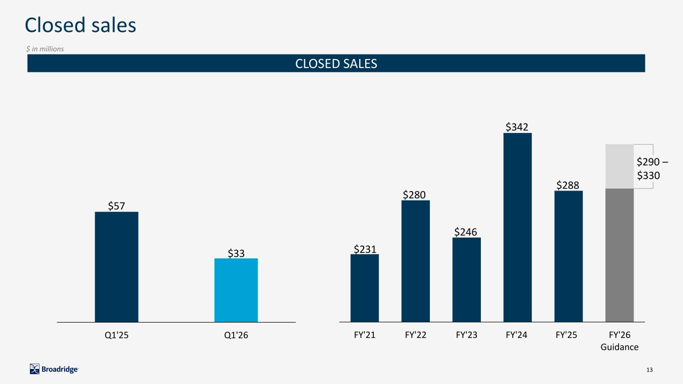 ニューヨーク、2025年11月4日 - ブロードリッジ・ファイナンシャル・ソリューションズ・インク(NYSE:BR)は本日、2026会計年度第1四半期(2025年9月30日に終了)の業績を発表しました。前年同期と比較した業績は以下のとおりです:
