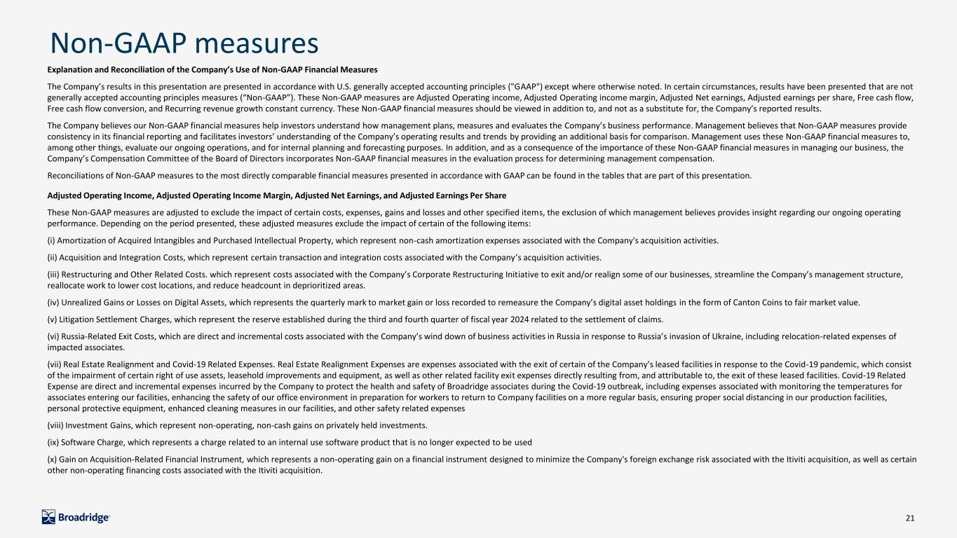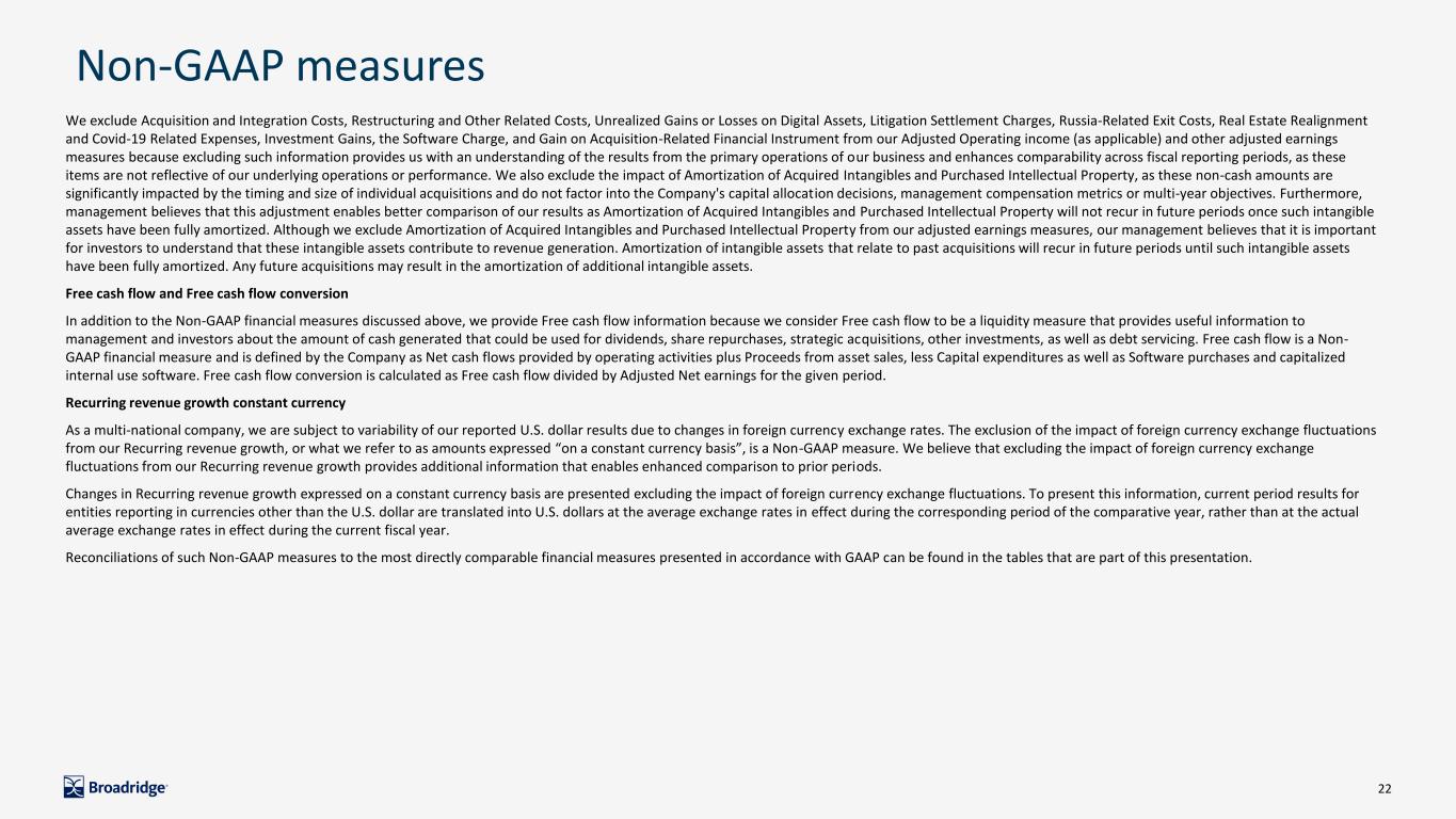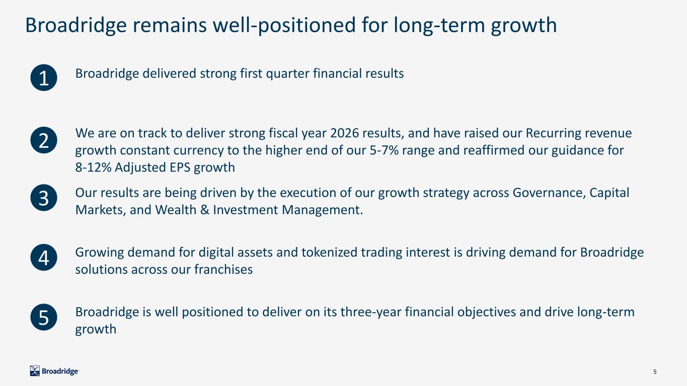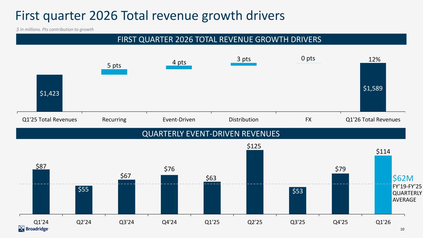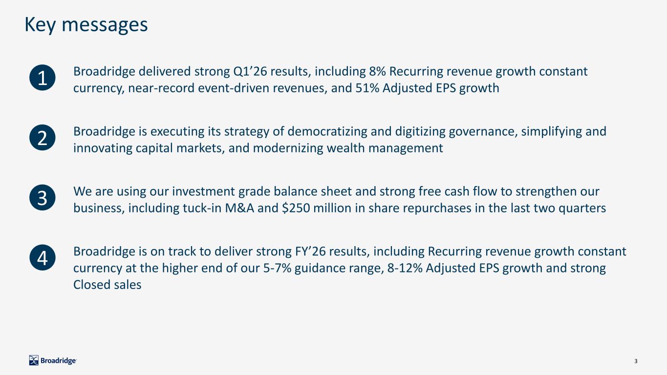 「ブロードリッジのティム・ゴーキー最高経営責任者(CEO)は次のように述べています。「ブロードリッジは第1四半期に、恒常為替レートベースで経常収益が8%増加し、イベント・ドリブン収益がほぼ記録的な伸びを示し、調整後EPSが51%増加するなど、好調な業績を達成しました。「当社は引き続き、ガバナンスの民主化とデジタル化、資本市場の簡素化と革新、ウェルス・マネジメントの近代化という戦略を実行していきます。