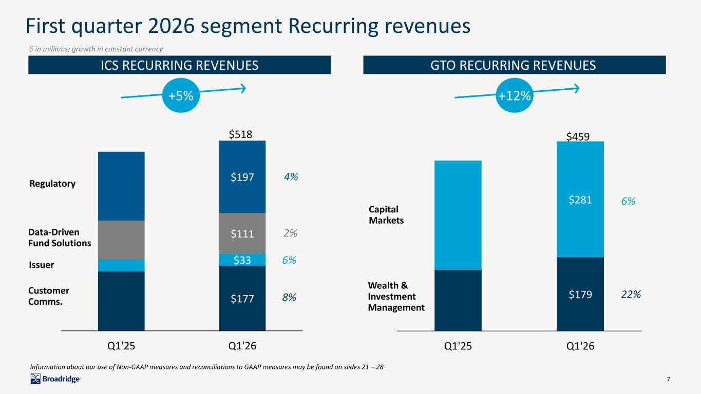 経常収益は7,700万ドル(9%)増の9億7,700万ドル。為替変動の影響を除いた経常収益の伸び(Non-GAAP)は8%で、これは有機的成長とICSおよびGTOの買収によるものである。