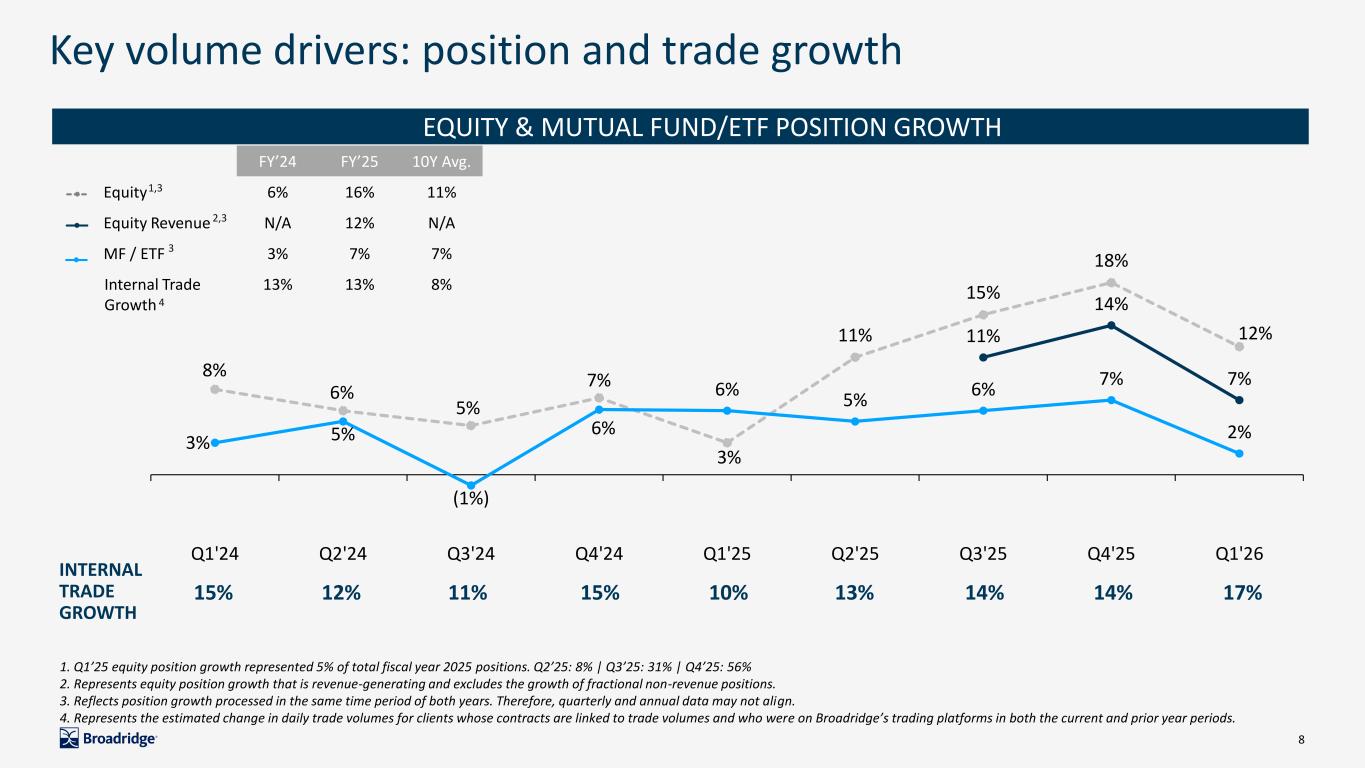 キャピタルマーケッツはそれぞれ8%増、6%増となったが、これは主に新規販売による収入5ptsと内部成長による収入3ptsによるものである。内部成長にはデジタル資産収入による1pt(400万ドル)が含まれる。