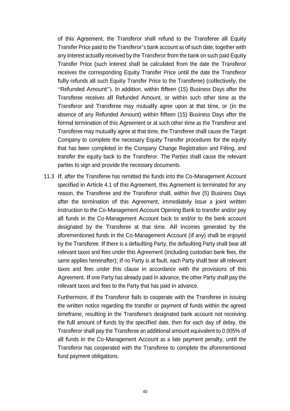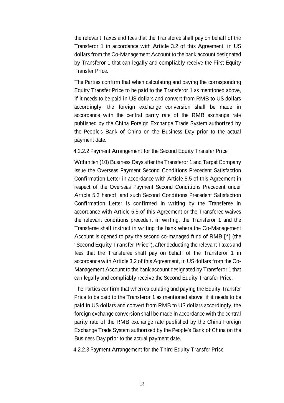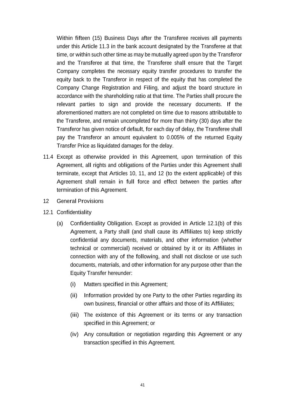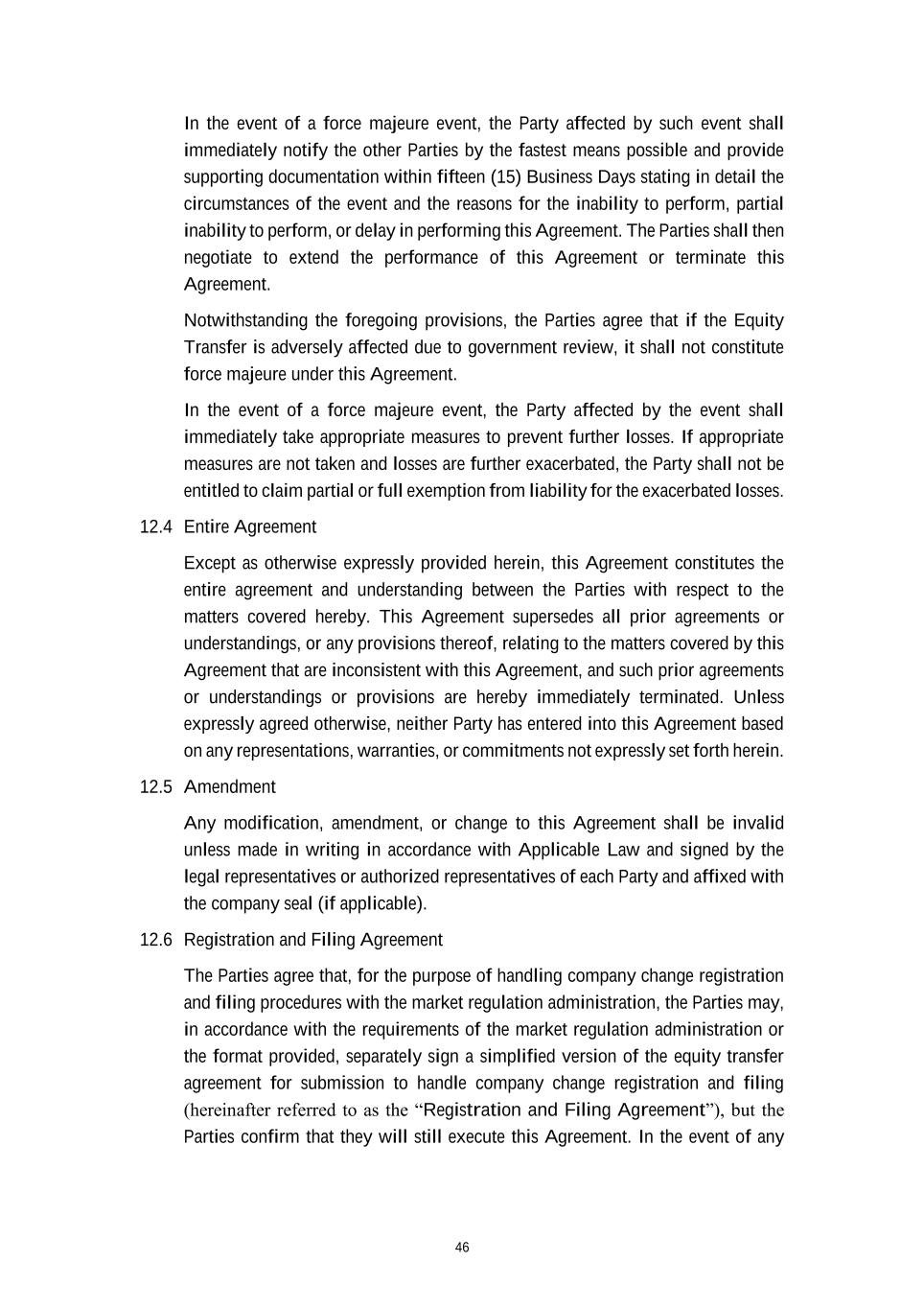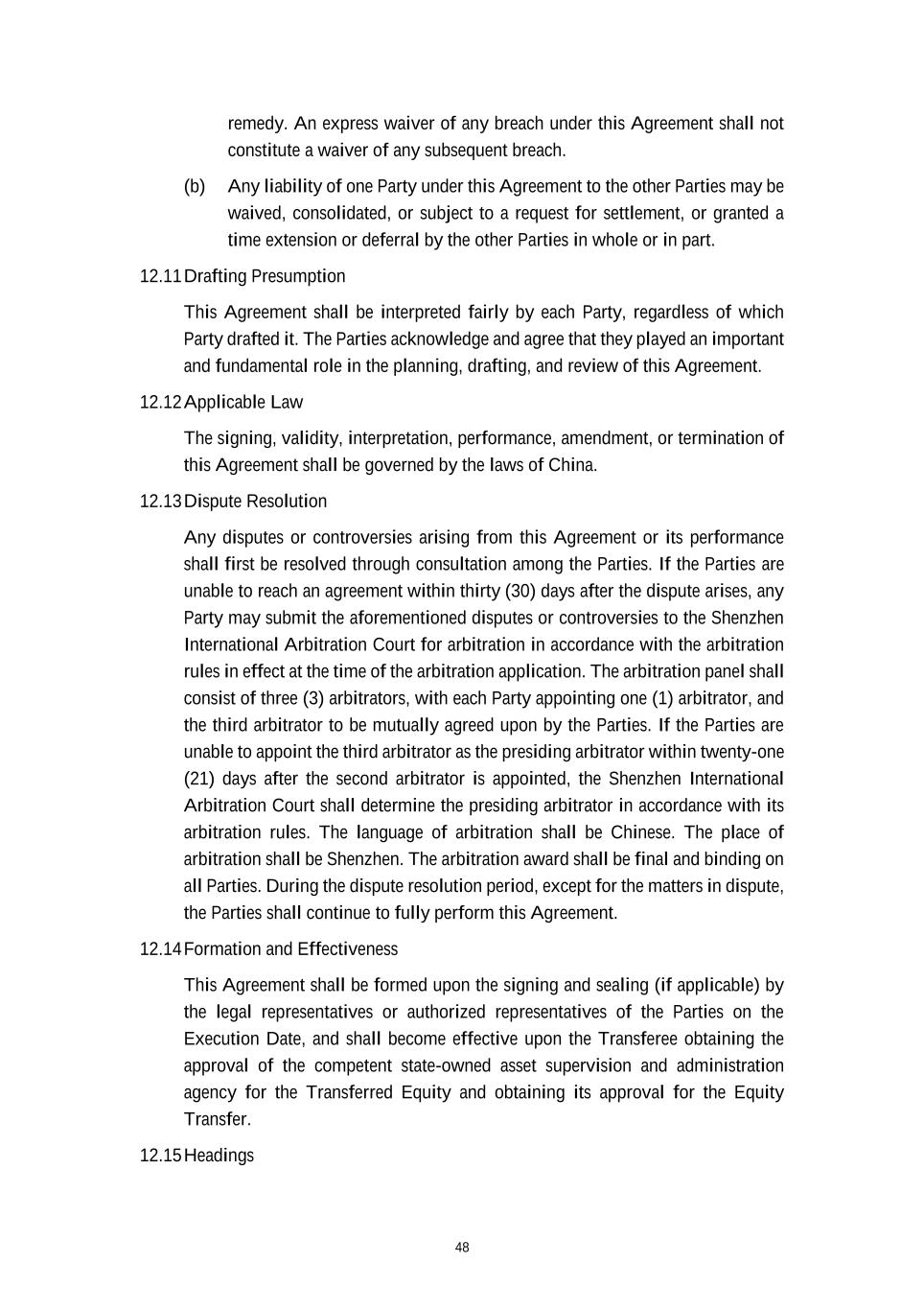 48 remedy. An express waiver of any breach under this Agreement shall not constitute a waiver of any subsequent breach. (b) Any liability of one Party under this Agreement to the other Parties may be waived, consolidated, or subject to a request for settlement, or granted a time extension or deferral by the other Parties in whole or in part. 12.11 Drafting Presumption This Agreement shall be interpreted fairly by each Party, regardless of which Party drafted it. The Parties acknowledge and agree that they played an important and fundamental role in the planning, drafting, and review of this Agreement. 12.12 Applicable Law The signing, validity, interpretation, performance, amendment, or termination of this Agreement shall be governed by the laws of China. 12.13 Dispute Resolution Any disputes or controversies arising from this Agreement or its performance shall first be resolved through consultation among the Parties. If the Parties are unable to reach an agreement within thirty (30) days after the dispute arises, any Party may submit the aforementioned disputes or controversies to the Shenzhen International Arbitration Court for arbitration in accordance with the arbitration rules in effect at the time of the arbitration application. The arbitration panel shall consist of three (3) arbitrators, with each Party appointing one (1) arbitrator, and the third arbitrator to be mutually agreed upon by the Parties. If the Parties are unable to appoint the third arbitrator as the presiding arbitrator within twenty-one (21) days after the second arbitrator is appointed, the Shenzhen International Arbitration Court shall determine the presiding arbitrator in accordance with its arbitration rules. The language of arbitration shall be Chinese. The place of arbitration shall be Shenzhen. The arbitration award shall be final and binding on all Parties. During the dispute resolution period, except for the matters in dispute, the Parties shall continue to fully perform this Agreement. 12.14 Formation and Effectiveness This Agreement shall be formed upon the signing and sealing (if applicable) by the legal representatives or authorized representatives of the Parties on the Execution Date, and shall become effective upon the Transferee obtaining the approval of the competent state-owned asset supervision and administration agency for the Transferred Equity and obtaining its approval for the Equity Transfer. 12.15 Headings