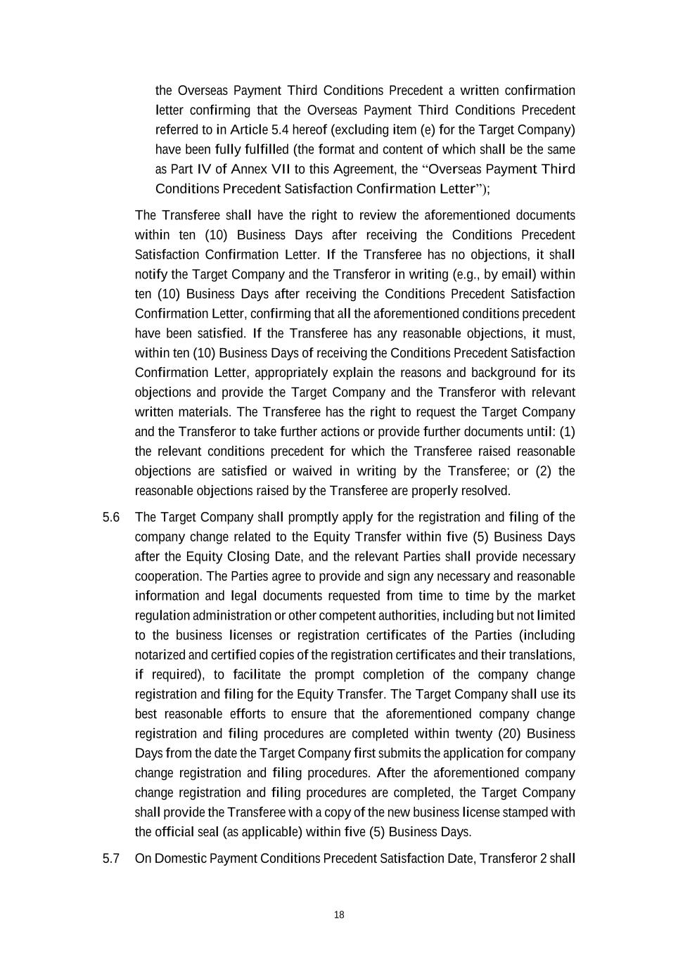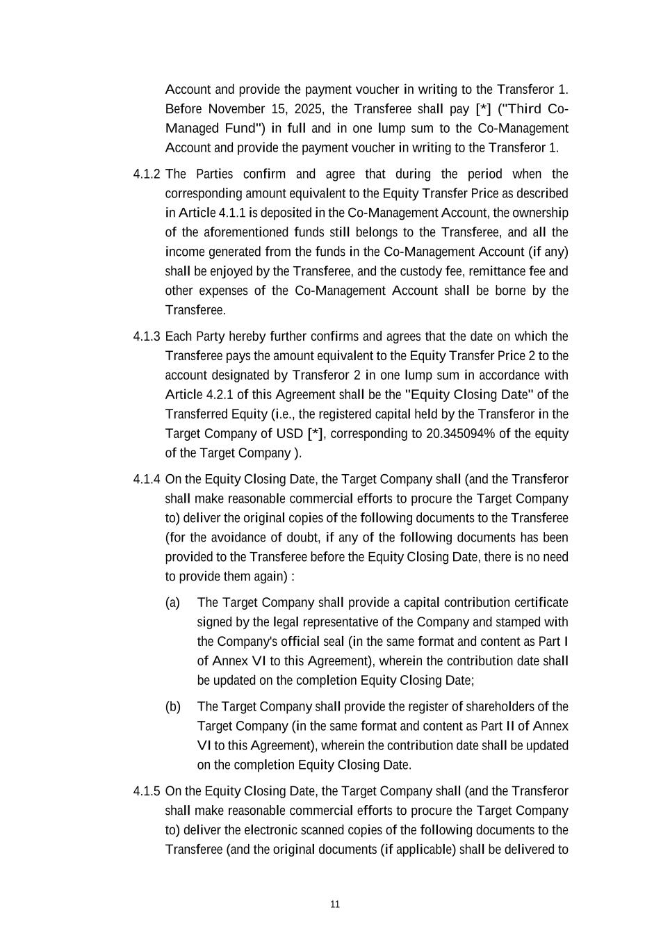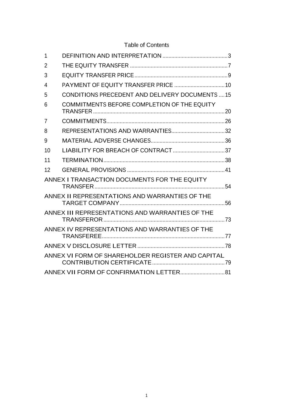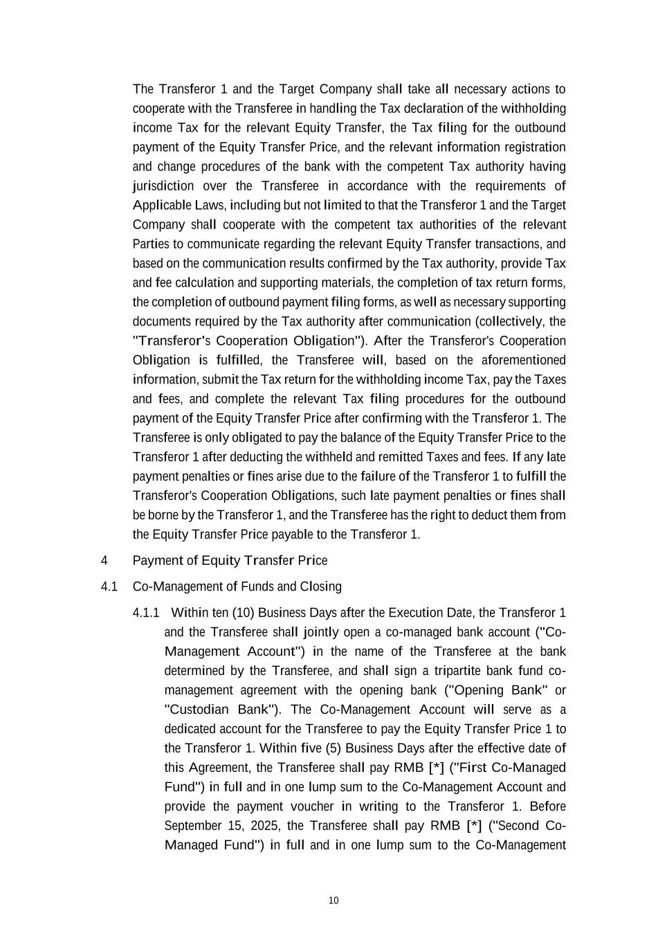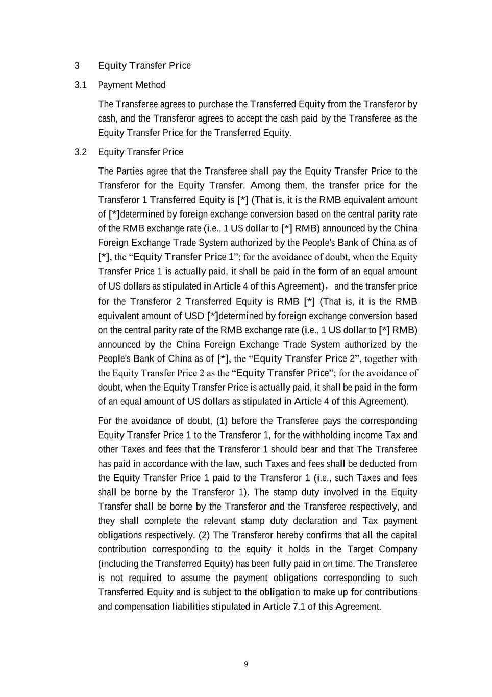 48 remedy. An express waiver of any breach under this Agreement shall not constitute a waiver of any subsequent breach. (b) Any liability of one Party under this Agreement to the other Parties may be waived, consolidated, or subject to a request for settlement, or granted a time extension or deferral by the other Parties in whole or in part. 12.11 Drafting Presumption This Agreement shall be interpreted fairly by each Party, regardless of which Party drafted it. The Parties acknowledge and agree that they played an important and fundamental role in the planning, drafting, and review of this Agreement. 12.12 Applicable Law The signing, validity, interpretation, performance, amendment, or termination of this Agreement shall be governed by the laws of China. 12.13 Dispute Resolution Any disputes or controversies arising from this Agreement or its performance shall first be resolved through consultation among the Parties. If the Parties are unable to reach an agreement within thirty (30) days after the dispute arises, any Party may submit the aforementioned disputes or controversies to the Shenzhen International Arbitration Court for arbitration in accordance with the arbitration rules in effect at the time of the arbitration application. The arbitration panel shall consist of three (3) arbitrators, with each Party appointing one (1) arbitrator, and the third arbitrator to be mutually agreed upon by the Parties. If the Parties are unable to appoint the third arbitrator as the presiding arbitrator within twenty-one (21) days after the second arbitrator is appointed, the Shenzhen International Arbitration Court shall determine the presiding arbitrator in accordance with its arbitration rules. The language of arbitration shall be Chinese. The place of arbitration shall be Shenzhen. The arbitration award shall be final and binding on all Parties. During the dispute resolution period, except for the matters in dispute, the Parties shall continue to fully perform this Agreement. 12.14 Formation and Effectiveness This Agreement shall be formed upon the signing and sealing (if applicable) by the legal representatives or authorized representatives of the Parties on the Execution Date, and shall become effective upon the Transferee obtaining the approval of the competent state-owned asset supervision and administration agency for the Transferred Equity and obtaining its approval for the Equity Transfer. 12.15 Headings