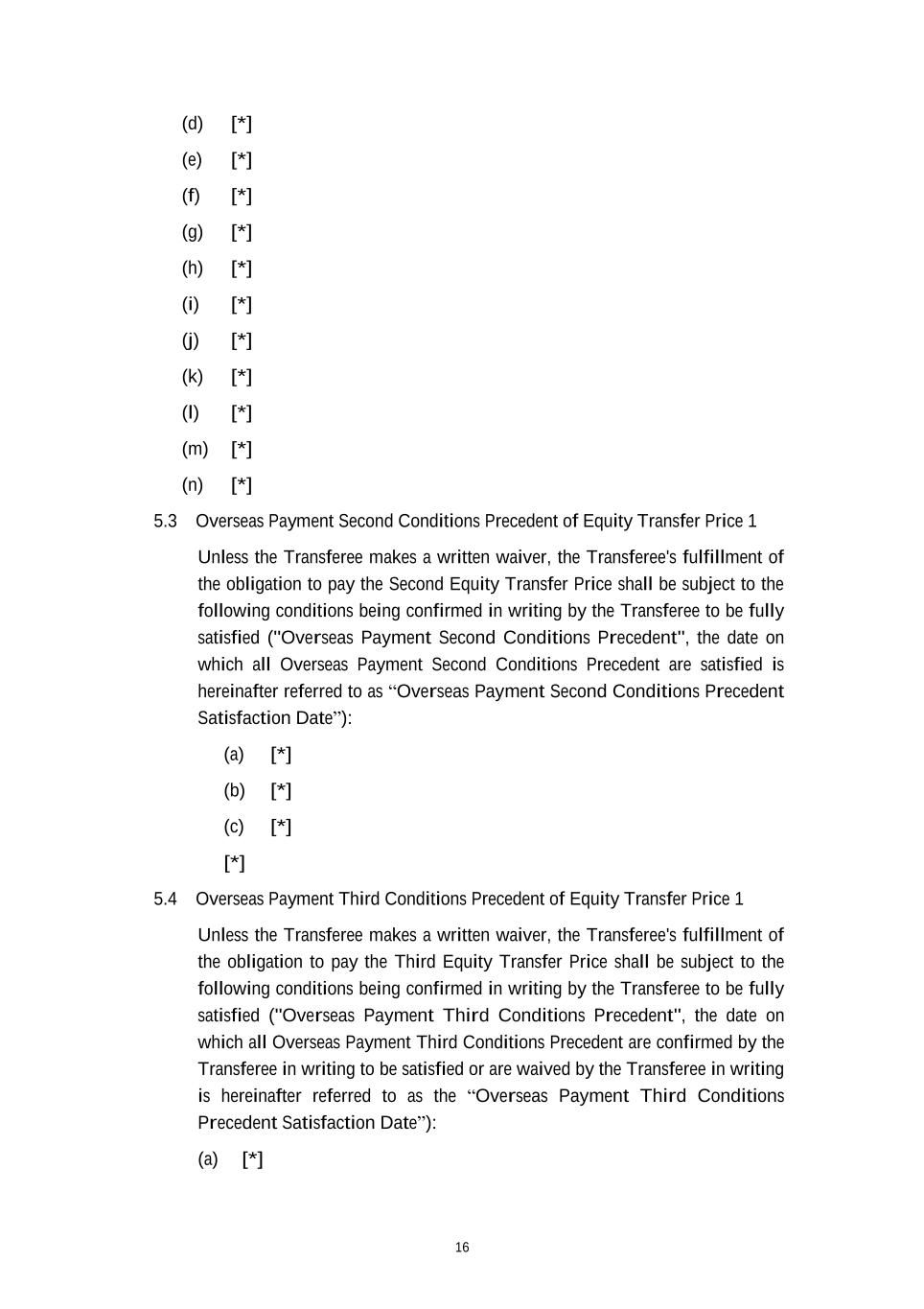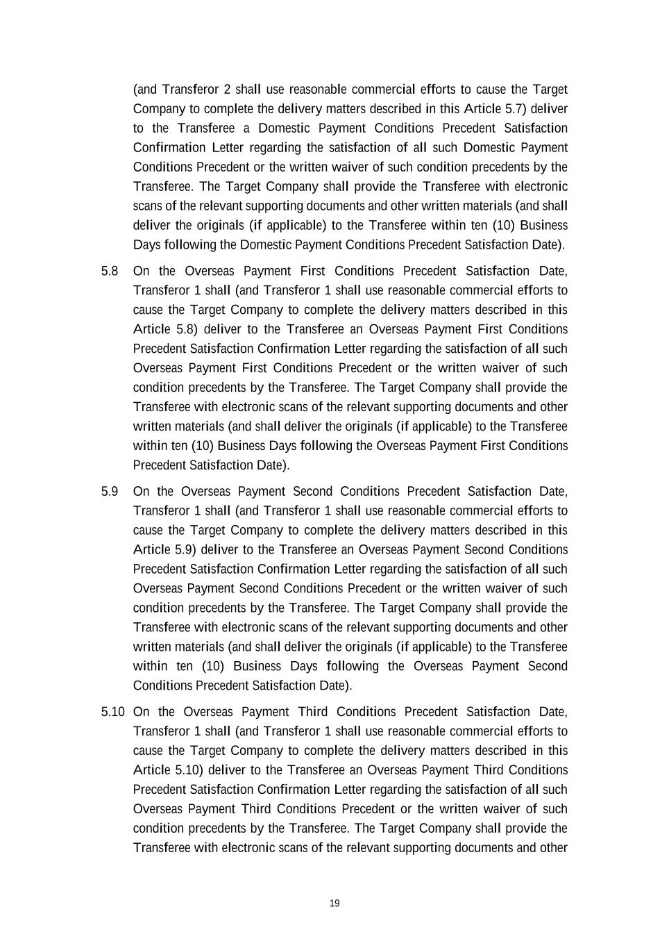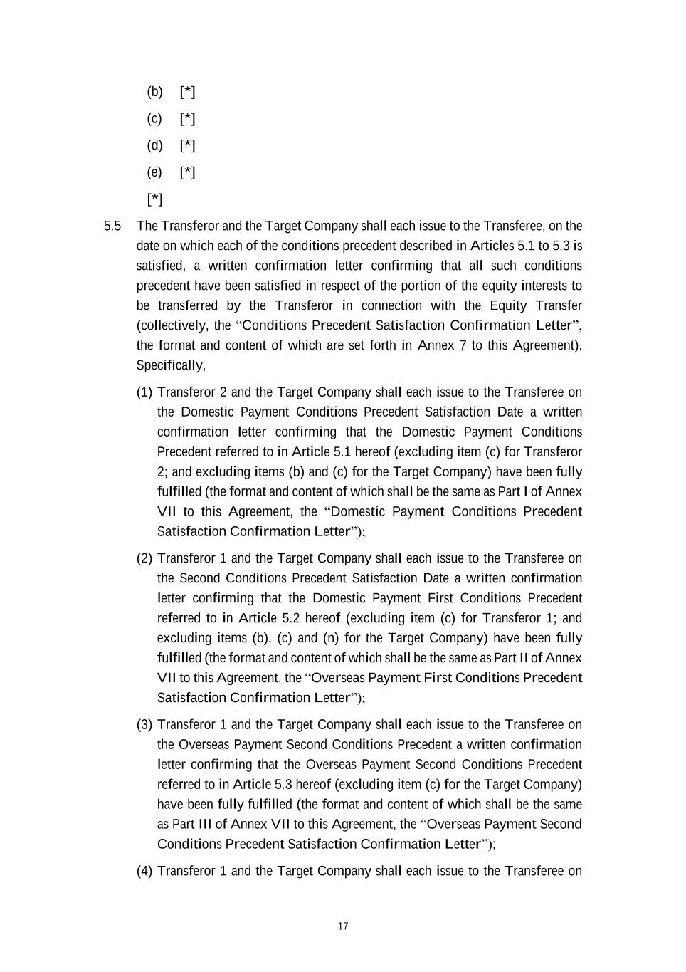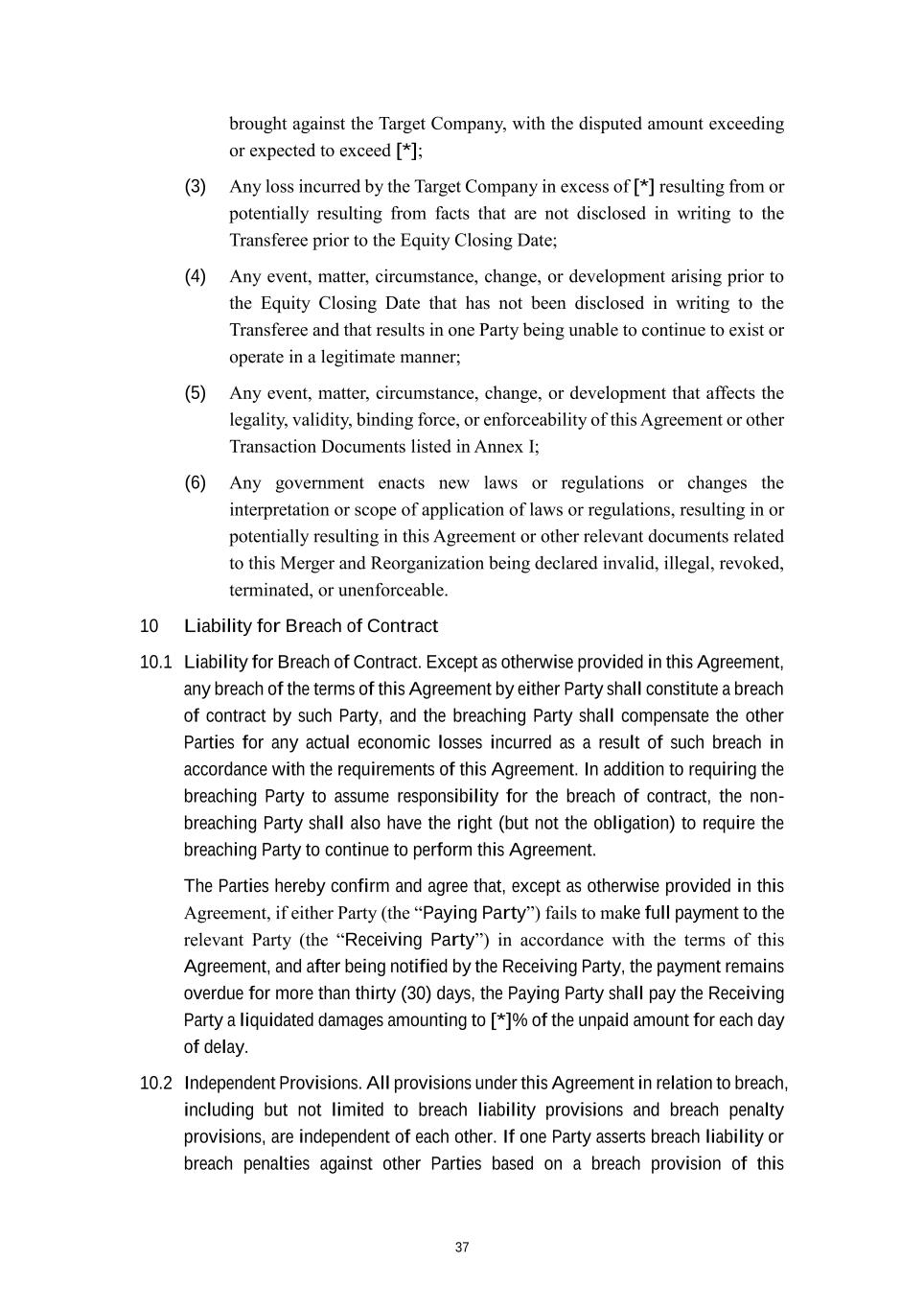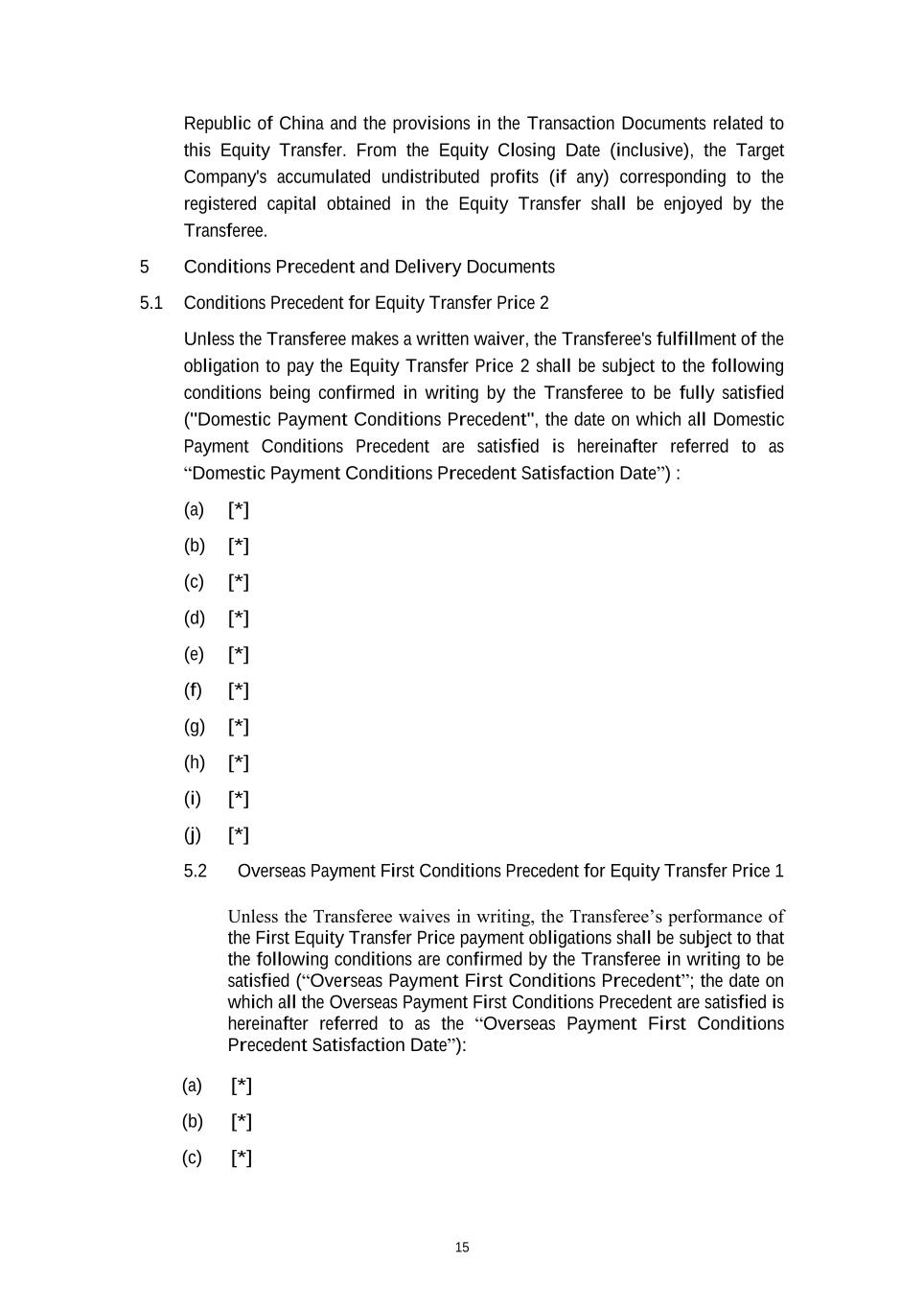 48 remedy. An express waiver of any breach under this Agreement shall not constitute a waiver of any subsequent breach. (b) Any liability of one Party under this Agreement to the other Parties may be waived, consolidated, or subject to a request for settlement, or granted a time extension or deferral by the other Parties in whole or in part. 12.11 Drafting Presumption This Agreement shall be interpreted fairly by each Party, regardless of which Party drafted it. The Parties acknowledge and agree that they played an important and fundamental role in the planning, drafting, and review of this Agreement. 12.12 Applicable Law The signing, validity, interpretation, performance, amendment, or termination of this Agreement shall be governed by the laws of China. 12.13 Dispute Resolution Any disputes or controversies arising from this Agreement or its performance shall first be resolved through consultation among the Parties. If the Parties are unable to reach an agreement within thirty (30) days after the dispute arises, any Party may submit the aforementioned disputes or controversies to the Shenzhen International Arbitration Court for arbitration in accordance with the arbitration rules in effect at the time of the arbitration application. The arbitration panel shall consist of three (3) arbitrators, with each Party appointing one (1) arbitrator, and the third arbitrator to be mutually agreed upon by the Parties. If the Parties are unable to appoint the third arbitrator as the presiding arbitrator within twenty-one (21) days after the second arbitrator is appointed, the Shenzhen International Arbitration Court shall determine the presiding arbitrator in accordance with its arbitration rules. The language of arbitration shall be Chinese. The place of arbitration shall be Shenzhen. The arbitration award shall be final and binding on all Parties. During the dispute resolution period, except for the matters in dispute, the Parties shall continue to fully perform this Agreement. 12.14 Formation and Effectiveness This Agreement shall be formed upon the signing and sealing (if applicable) by the legal representatives or authorized representatives of the Parties on the Execution Date, and shall become effective upon the Transferee obtaining the approval of the competent state-owned asset supervision and administration agency for the Transferred Equity and obtaining its approval for the Equity Transfer. 12.15 Headings
