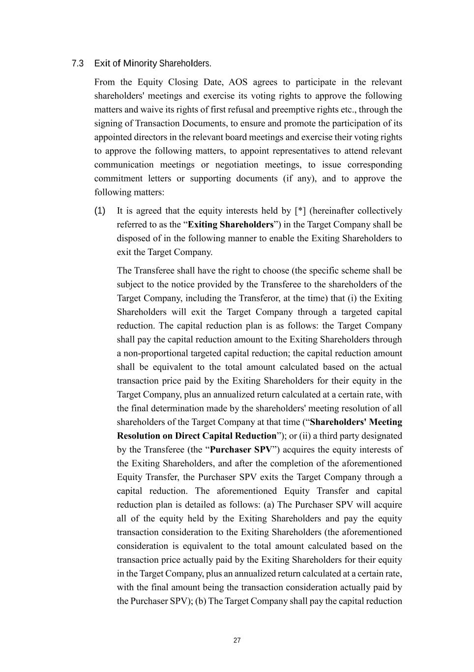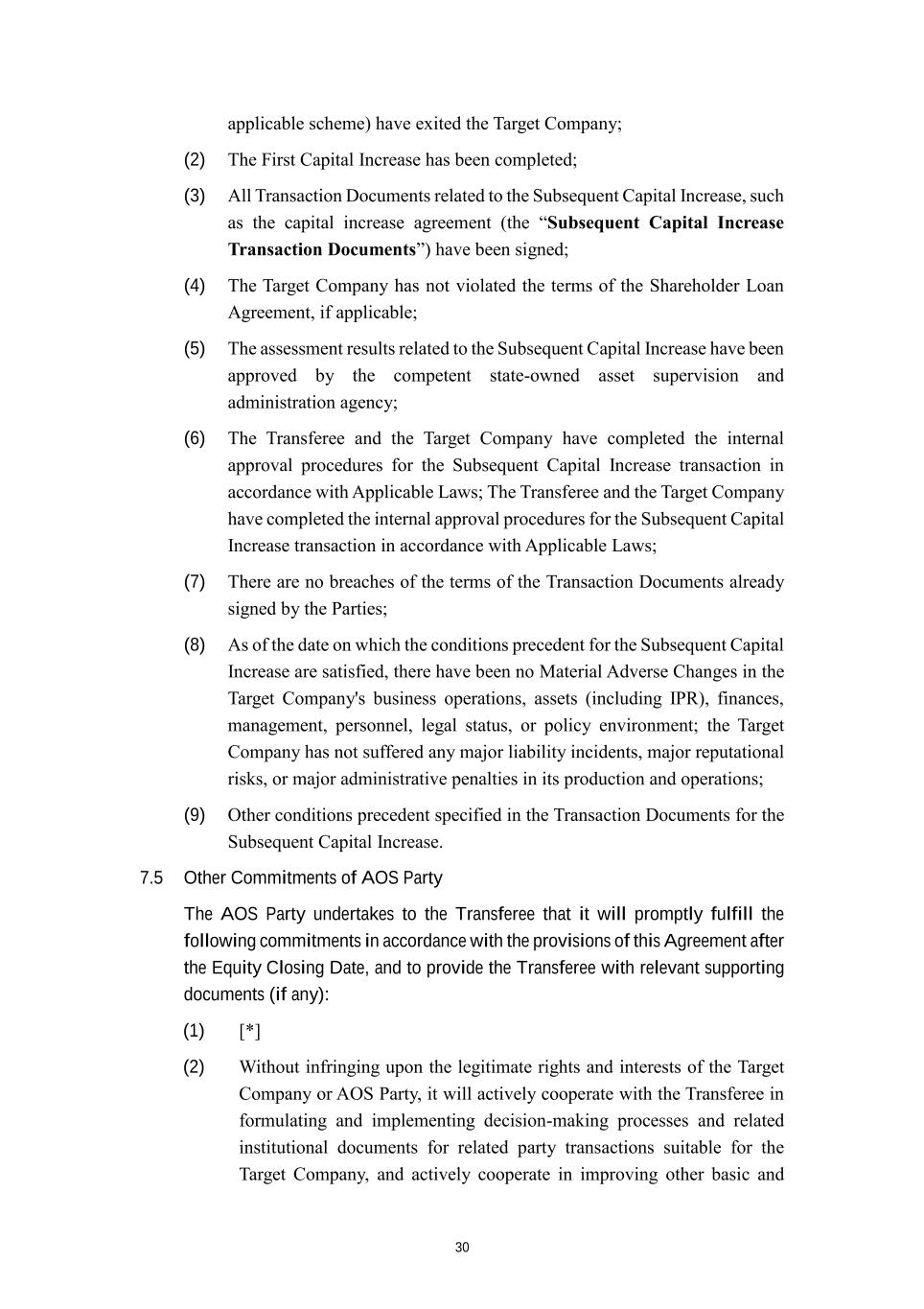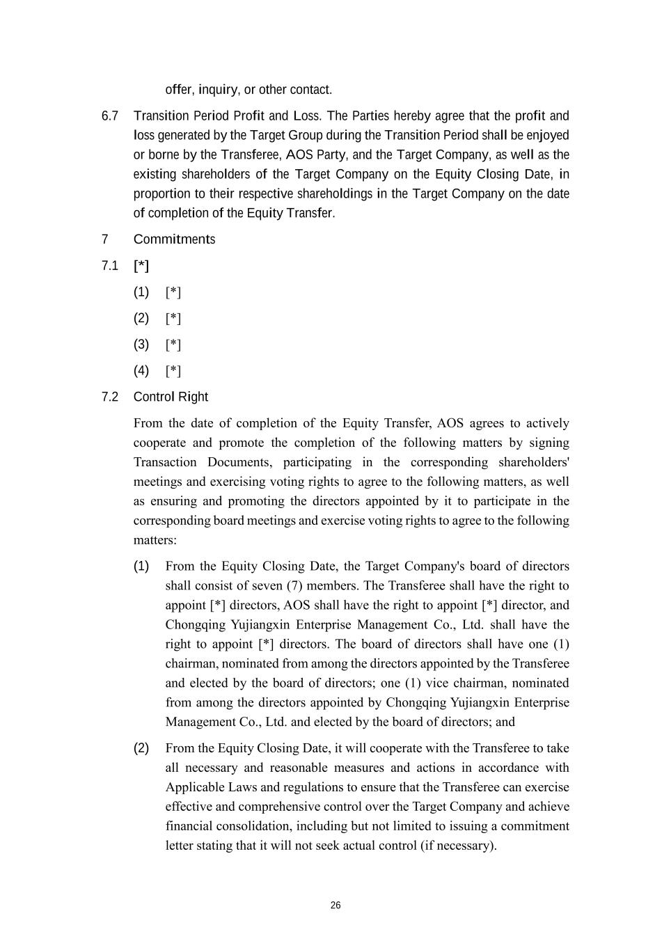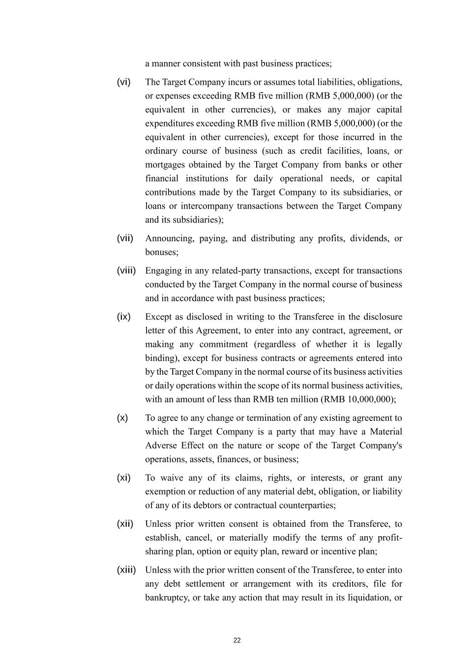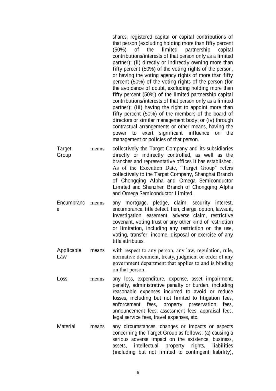 Annexes of the Equity Transfer Agreement of Chongqing Alpha and Omega Semiconductor Limited binding documents. The term “material contract” as referred to herein means any contract, agreement, or other form of document or arrangement that meets any of the following requirements: (i) a single contract amount exceeding RMB one million (RMB1,000,000) or cumulative transaction amounts reaching RMB five million (RMB5,000,000); (ii) the contract performance period exceeds six (6) months from the date of signing this agreement; (iii) any contracts or agreements entered into with current or former directors, senior management, shareholders, employees, or advisors of the Target Group; (iv) any contracts, agreements, or arrangements related to the sale or purchase of the Target Company assets (excluding those arising from routine business operations); (v) agreements concerning the welfare benefits or stock option incentives of the Target Company’s relevant personnel; (vi) any form of external investment contracts, agreements, memorandums of understanding, or other arrangements; (vii) agreements related to IPRs; (viii) contracts whose nature exceeds the scope of the Company’s core business; or (ix) other contracts that may have a Material Adverse Effect on the assets and operations of the Target Group or the Target Capital Increase. 11.2 Except as disclosed to the Transferee, the Target Group is not a party to, or bound by, any of the following contracts, agreements, or documents: (a) Contracts, agreements, or documents not formed in the ordinary course of its principal business operations; (b) Contracts, agreements, or documents not formed on the basis of fair commercial transactions between independent persons; (c) Non-compete agreements or non-solicitation agreements under which the Target Group is obligated or may be obligated to perform, as well as contracts, agreements, or documents that restrict the Target Group's operations; (d) Contracts, commitments, or arrangements (including but not limited to mortgage contracts, pledge contracts, or guarantee contracts) that prohibit or restrict the transfer or disposition of the Target Group's assets, business, or equity, except as already disclosed in writing to the Transferee; (e) Contracts, agreements, or documents that are significantly affected by or may be significantly affected by transactions under this Agreement; (f) Contracts, agreements, or documents in which the Target Group is a party, and where the counterparty has the right to terminate, amend the agreement, or require the Target Company to obtain its prior consent or approval, or provide guarantees or make commitments due to the Target Company’s transactions under this Agreement (including changes in shareholders, directors, or senior management), except as already disclosed in writing to the Transferee;