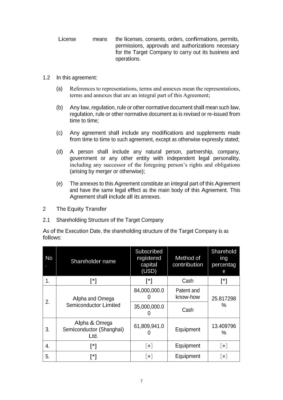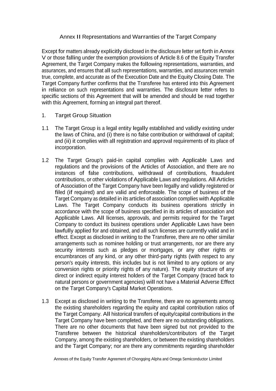 Annexes of the Equity Transfer Agreement of Chongqing Alpha and Omega Semiconductor Limited Annex II Representations and Warranties of the Target Company Except for matters already explicitly disclosed in the disclosure letter set forth in Annex V or those falling under the exemption provisions of Article 8.6 of the Equity Transfer Agreement, the Target Company makes the following representations, warranties, and assurances, and ensures that all such representations, warranties, and assurances remain true, complete, and accurate as of the Execution Date and the Equity Closing Date. The Target Company further confirms that the Transferee has entered into this Agreement in reliance on such representations and warranties. The disclosure letter refers to specific sections of this Agreement that will be amended and should be read together with this Agreement, forming an integral part thereof. 1. Target Group Situation 1.1 The Target Group is a legal entity legally established and validly existing under the laws of China, and (i) there is no false contribution or withdrawal of capital; and (ii) it complies with all registration and approval requirements of its place of incorporation. 1.2 The Target Group's paid-in capital complies with Applicable Laws and regulations and the provisions of the Articles of Association, and there are no instances of false contributions, withdrawal of contributions, fraudulent contributions, or other violations of Applicable Laws and regulations. All Articles of Association of the Target Company have been legally and validly registered or filed (if required) and are valid and enforceable. The scope of business of the Target Company as detailed in its articles of association complies with Applicable Laws. The Target Company conducts its business operations strictly in accordance with the scope of business specified in its articles of association and Applicable Laws. All licenses, approvals, and permits required for the Target Company to conduct its business operations under Applicable Laws have been lawfully applied for and obtained, and all such licenses are currently valid and in effect. Except as disclosed in writing to the Transferee, there are no other similar arrangements such as nominee holding or trust arrangements, nor are there any security interests such as pledges or mortgages, or any other rights or encumbrances of any kind, or any other third-party rights (with respect to any person's equity interests, this includes but is not limited to any options or any conversion rights or priority rights of any nature). The equity structure of any direct or indirect equity interest holders of the Target Company (traced back to natural persons or government agencies) will not have a Material Adverse Effect on the Target Company's Capital Market Operations. 1.3 Except as disclosed in writing to the Transferee, there are no agreements among the existing shareholders regarding the equity and capital contribution ratios of the Target Company. All historical transfers of equity/capital contributions in the Target Company have been completed, and there are no outstanding obligations. There are no other documents that have been signed but not provided to the Transferee between the historical shareholders/contributors of the Target Company, among the existing shareholders, or between the existing shareholders and the Target Company; nor are there any commitments regarding shareholder