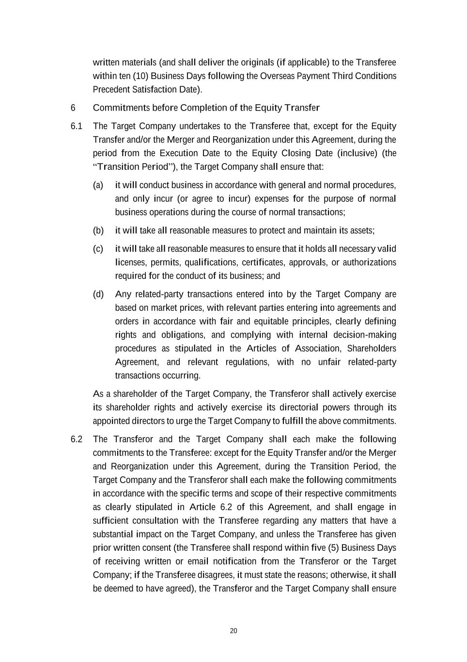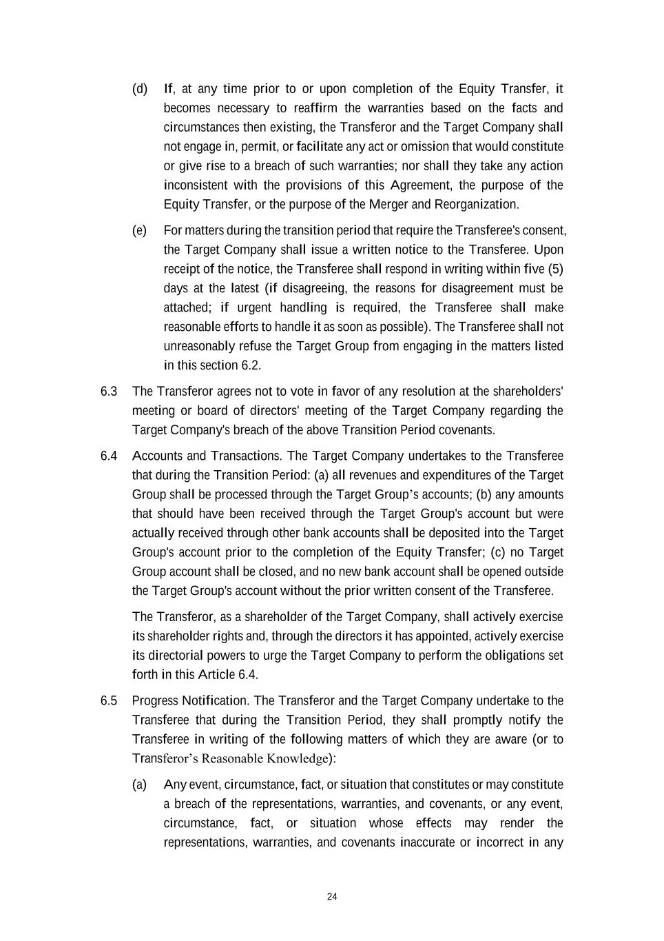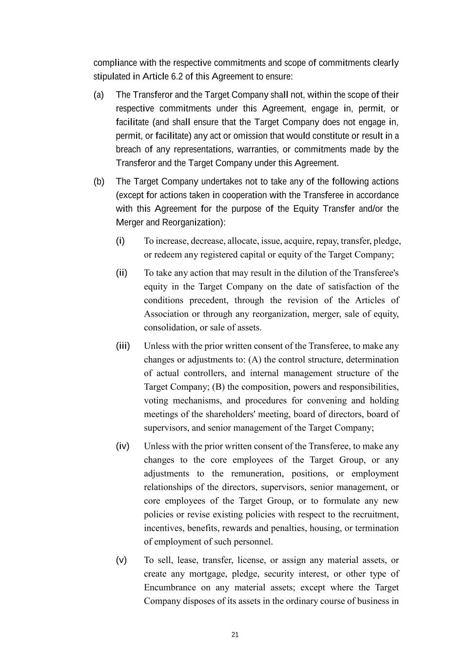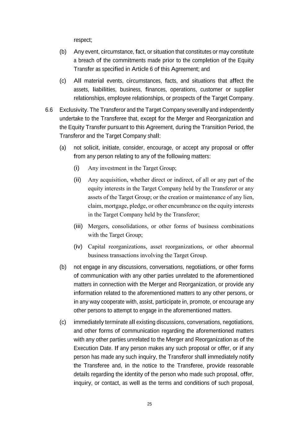 47 inconsistency, conflict, or ambiguity between this Agreement and the Registration and Filing Agreement, this Agreement shall prevail. 12.7 Assignment No Party may assign or transfer its rights or obligations under this Agreement without the prior written consent of the other Parties. Any proposed assignment in violation of this Article 12.7 shall be null and void from the outset. This Agreement shall be binding upon and inure to the benefit of each Party and its successors and permitted assigns. 12.8 Costs (a) Subject to the provisions of Article 11.3 of this Agreement, the Parties agree that, except for the withholding income tax related to the transfer of equity interests by Transferor 1 as described in Article 3.2, all taxes, fees, and charges related to the Equity Transfer described in this Agreement shall be borne by each Party in accordance with Applicable Laws, regulations, and normative documents. (b) For the purposes of the Merger and Reorganization, the Transferee and the third-party intermediaries engaged by the Transferee, including lawyers, accountants, and other intermediaries, shall conduct a comprehensive due diligence review of the Target Group in terms of business, legal, and financial matters. The costs of such due diligence shall be borne by the Transferee. 12.9 Severability If any provision of this Agreement is deemed to be wholly or partially illegal, invalid, or unenforceable, such provision or the relevant portion thereof shall be deemed not to form part of this Agreement to the extent of such illegality, invalidity, or unenforceability, but the legality, validity, and enforceability of the remaining provisions of this Agreement shall not be affected. The Parties shall use their best reasonable efforts to replace the invalid or unenforceable provision with an effective and enforceable alternative provision, the content of which shall be as close as possible to the intended meaning of the invalid or unenforceable provision. 12.10 Waiver (a) The failure or delay by either Party to exercise any right, power, or remedy under this Agreement shall not constitute a waiver of such right, power, or remedy; nor shall the exercise by either Party of any right, power, or remedy on a single or partial basis preclude the further or additional exercise of such right, power, or remedy, or the exercise of any other right, power, or