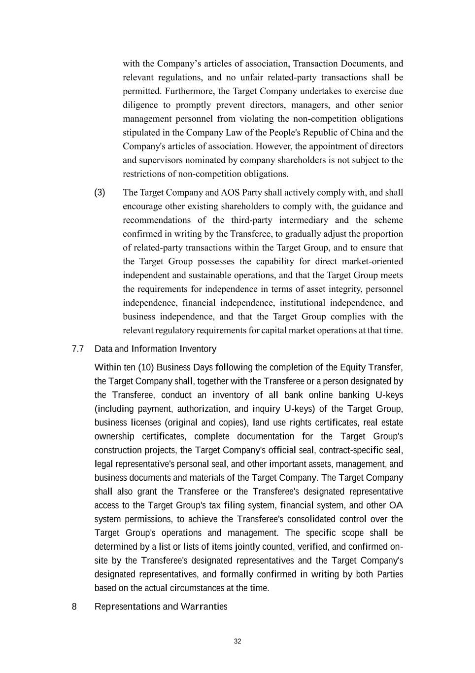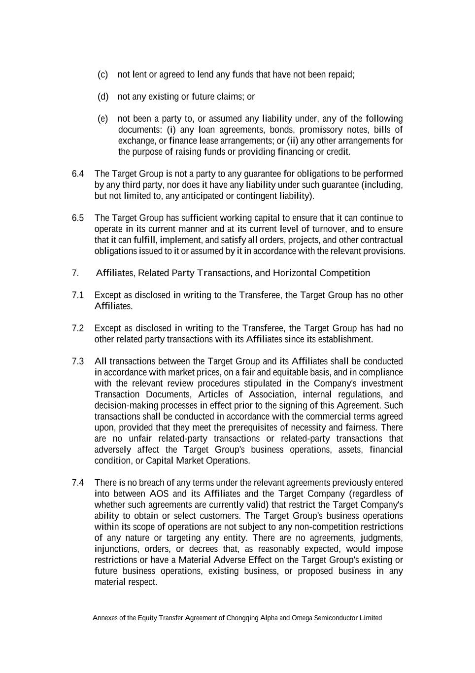 Annexes of the Equity Transfer Agreement of Chongqing Alpha and Omega Semiconductor Limited (c) not lent or agreed to lend any funds that have not been repaid; (d) not any existing or future claims; or (e) not been a party to, or assumed any liability under, any of the following documents: (i) any loan agreements, bonds, promissory notes, bills of exchange, or finance lease arrangements; or (ii) any other arrangements for the purpose of raising funds or providing financing or credit. 6.4 The Target Group is not a party to any guarantee for obligations to be performed by any third party, nor does it have any liability under such guarantee (including, but not limited to, any anticipated or contingent liability). 6.5 The Target Group has sufficient working capital to ensure that it can continue to operate in its current manner and at its current level of turnover, and to ensure that it can fulfill, implement, and satisfy all orders, projects, and other contractual obligations issued to it or assumed by it in accordance with the relevant provisions. 7. Affiliates, Related Party Transactions, and Horizontal Competition 7.1 Except as disclosed in writing to the Transferee, the Target Group has no other Affiliates. 7.2 Except as disclosed in writing to the Transferee, the Target Group has had no other related party transactions with its Affiliates since its establishment. 7.3 All transactions between the Target Group and its Affiliates shall be conducted in accordance with market prices, on a fair and equitable basis, and in compliance with the relevant review procedures stipulated in the Company's investment Transaction Documents, Articles of Association, internal regulations, and decision-making processes in effect prior to the signing of this Agreement. Such transactions shall be conducted in accordance with the commercial terms agreed upon, provided that they meet the prerequisites of necessity and fairness. There are no unfair related-party transactions or related-party transactions that adversely affect the Target Group's business operations, assets, financial condition, or Capital Market Operations. 7.4 There is no breach of any terms under the relevant agreements previously entered into between AOS and its Affiliates and the Target Company (regardless of whether such agreements are currently valid) that restrict the Target Company's ability to obtain or select customers. The Target Group's business operations within its scope of operations are not subject to any non-competition restrictions of any nature or targeting any entity. There are no agreements, judgments, injunctions, orders, or decrees that, as reasonably expected, would impose restrictions or have a Material Adverse Effect on the Target Group's existing or future business operations, existing business, or proposed business in any material respect.