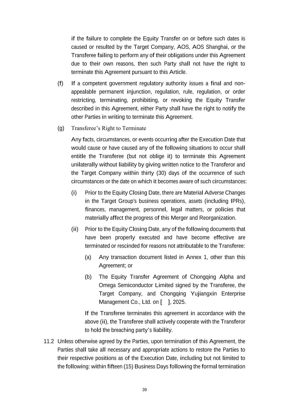 Annexes of the Equity Transfer Agreement of Chongqing Alpha and Omega Semiconductor Limited (g) Contracts, agreements, documents, commitments, and arrangements that the Target Group is currently performing or will perform that restrict or prohibit the Target Company from conducting an initial public offering of shares, listing, equity or debt financing in the domestic capital market, or prohibit the sale of the entire business or the sale of controlling interests; (h) The account co-management agreements, and fund supervision agreements the Target Group is currently performing and will perform, and other contracts, agreements, documents, commitments, and arrangements that control or supervise the Target Group's finances and assets, except as already disclosed in writing to the Transferee; (i) Contracts, agreements, documents, commitments, and arrangements that the Target Group is currently performing or will perform that permit third parties to participate in the governance of the Target Group or exercise actual control over the management and operations of the Target Group (e.g., third parties nominating directors, supervisors, or senior executives of the Target Group, or decisions made by the shareholders' meeting, board of directors, board of directors, or senior executives of the Target Company requiring prior approval from third parties); (j) Contracts, agreements, documents, commitments, and arrangements that the Target Group has already fulfilled or is currently fulfilling but which involve potential disputes, except for those already disclosed in writing to the Transferee. 12. Employees 12.1 The Target Group fully complies with all Applicable Laws, regulations, and government requirements related to labor, employment, and welfare benefits, and there are no violations of such laws, regulations, or government requirements; nor has the Target Group been subject to any penalties or actions by the competent authorities, and there are no pending investigations, audits, or other actions against the Target Group, or any disputes, litigation, arbitration, claims, or other legal proceedings related thereto. The Target Group does not have any of the following situations: (1) any pending labor disputes or disputes; (2) the Target Group's hiring or termination of current employees or its previously hired employees violates any agreements, contracts, or arrangements signed with any third party, and there are any payment obligations for compensation or indemnification fees related to the employment relationship that are due but unpaid. 12.2 The Target Group has timely and fully paid, and/or withheld and remitted on behalf of all employees, the social insurance contributions and housing provident fund contributions required by Applicable Laws, regulations, and agreements, including but not limited to old-age, medical, unemployment, work-related injury, maternity, and other relevant social insurance contributions and housing provident fund contributions. There are no existing or potential disputes regarding such social insurance contributions and housing provident fund