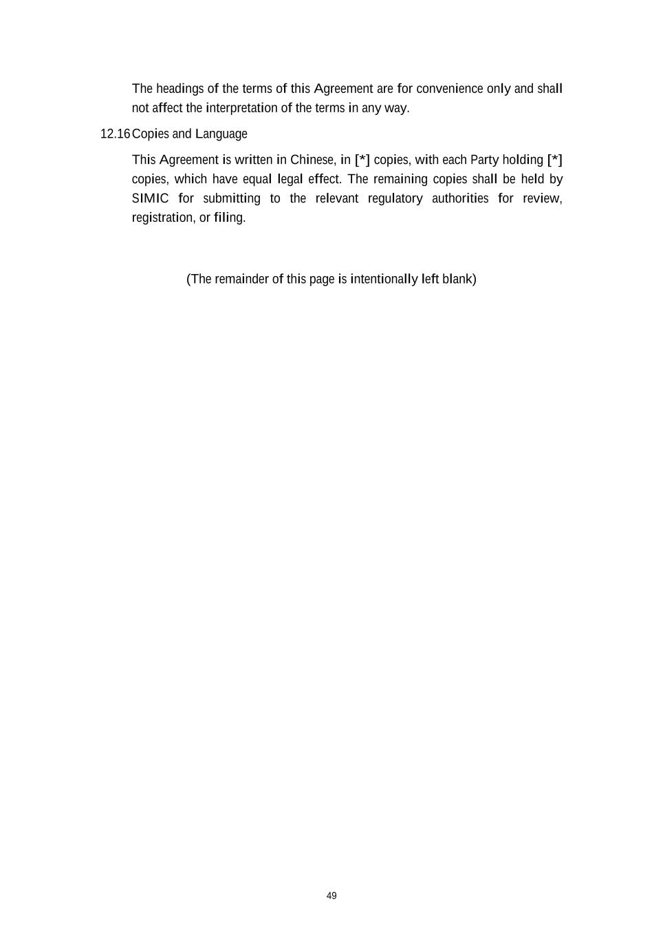 49 The headings of the terms of this Agreement are for convenience only and shall not affect the interpretation of the terms in any way. 12.16 Copies and Language This Agreement is written in Chinese, in [*] copies, with each Party holding [*] copies, which have equal legal effect. The remaining copies shall be held by SIMIC for submitting to the relevant regulatory authorities for review, registration, or filing. (The remainder of this page is intentionally left blank)