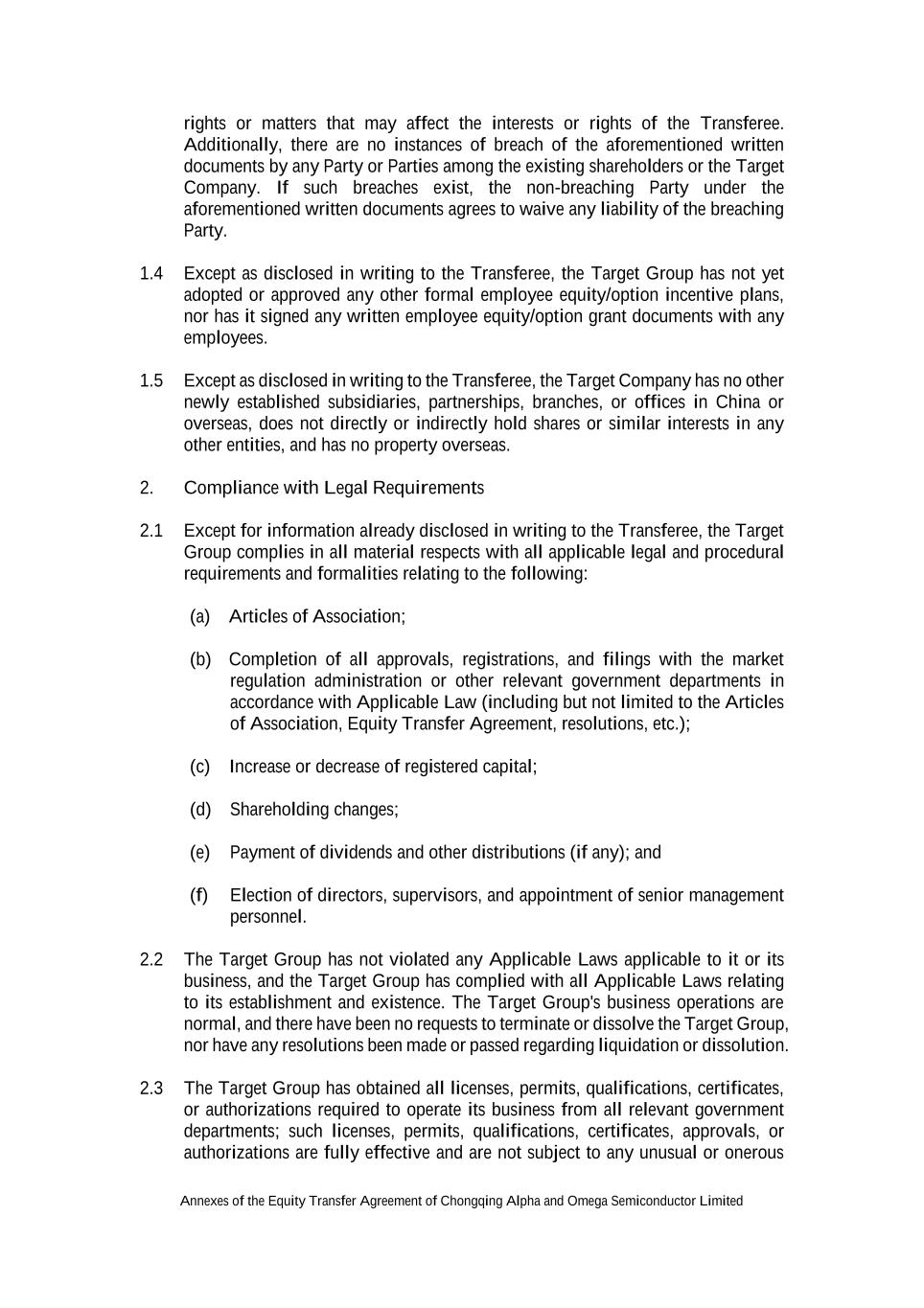 Annexes of the Equity Transfer Agreement of Chongqing Alpha and Omega Semiconductor Limited rights or matters that may affect the interests or rights of the Transferee. Additionally, there are no instances of breach of the aforementioned written documents by any Party or Parties among the existing shareholders or the Target Company. If such breaches exist, the non-breaching Party under the aforementioned written documents agrees to waive any liability of the breaching Party. 1.4 Except as disclosed in writing to the Transferee, the Target Group has not yet adopted or approved any other formal employee equity/option incentive plans, nor has it signed any written employee equity/option grant documents with any employees. 1.5 Except as disclosed in writing to the Transferee, the Target Company has no other newly established subsidiaries, partnerships, branches, or offices in China or overseas, does not directly or indirectly hold shares or similar interests in any other entities, and has no property overseas. 2. Compliance with Legal Requirements 2.1 Except for information already disclosed in writing to the Transferee, the Target Group complies in all material respects with all applicable legal and procedural requirements and formalities relating to the following: (a) Articles of Association; (b) Completion of all approvals, registrations, and filings with the market regulation administration or other relevant government departments in accordance with Applicable Law (including but not limited to the Articles of Association, Equity Transfer Agreement, resolutions, etc.); (c) Increase or decrease of registered capital; (d) Shareholding changes; (e) Payment of dividends and other distributions (if any); and (f) Election of directors, supervisors, and appointment of senior management personnel. 2.2 The Target Group has not violated any Applicable Laws applicable to it or its business, and the Target Group has complied with all Applicable Laws relating to its establishment and existence. The Target Group's business operations are normal, and there have been no requests to terminate or dissolve the Target Group, nor have any resolutions been made or passed regarding liquidation or dissolution. 2.3 The Target Group has obtained all licenses, permits, qualifications, certificates, or authorizations required to operate its business from all relevant government departments; such licenses, permits, qualifications, certificates, approvals, or authorizations are fully effective and are not subject to any unusual or onerous
