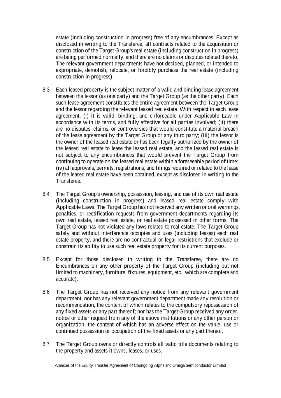Annexes of the Equity Transfer Agreement of Chongqing Alpha and Omega Semiconductor Limited estate (including construction in progress) free of any encumbrances. Except as disclosed in writing to the Transferee, all contracts related to the acquisition or construction of the Target Group's real estate (including construction in progress) are being performed normally, and there are no claims or disputes related thereto. The relevant government departments have not decided, planned, or intended to expropriate, demolish, relocate, or forcibly purchase the real estate (including construction in progress). 8.3 Each leased property is the subject matter of a valid and binding lease agreement between the lessor (as one party) and the Target Group (as the other party). Each such lease agreement constitutes the entire agreement between the Target Group and the lessor regarding the relevant leased real estate. With respect to each lease agreement, (i) it is valid, binding, and enforceable under Applicable Law in accordance with its terms, and fully effective for all parties involved; (ii) there are no disputes, claims, or controversies that would constitute a material breach of the lease agreement by the Target Group or any third party; (iii) the lessor is the owner of the leased real estate or has been legally authorized by the owner of the leased real estate to lease the leased real estate, and the leased real estate is not subject to any encumbrances that would prevent the Target Group from continuing to operate on the leased real estate within a foreseeable period of time; (iv) all approvals, permits, registrations, and filings required or related to the lease of the leased real estate have been obtained, except as disclosed in writing to the Transferee. 8.4 The Target Group's ownership, possession, leasing, and use of its own real estate (including construction in progress) and leased real estate comply with Applicable Laws. The Target Group has not received any written or oral warnings, penalties, or rectification requests from government departments regarding its own real estate, leased real estate, or real estate possessed in other forms. The Target Group has not violated any laws related to real estate. The Target Group safely and without interference occupies and uses (including leases) each real estate property, and there are no contractual or legal restrictions that exclude or constrain its ability to use such real estate property for its current purposes. 8.5 Except for those disclosed in writing to the Transferee, there are no Encumbrances on any other property of the Target Group (including but not limited to machinery, furniture, fixtures, equipment, etc., which are complete and accurate). 8.6 The Target Group has not received any notice from any relevant government department, nor has any relevant government department made any resolution or recommendation, the content of which relates to the compulsory repossession of any fixed assets or any part thereof; nor has the Target Group received any order, notice or other request from any of the above institutions or any other person or organization, the content of which has an adverse effect on the value, use or continued possession or occupation of the fixed assets or any part thereof. 8.7 The Target Group owns or directly controls all valid title documents relating to the property and assets it owns, leases, or uses.