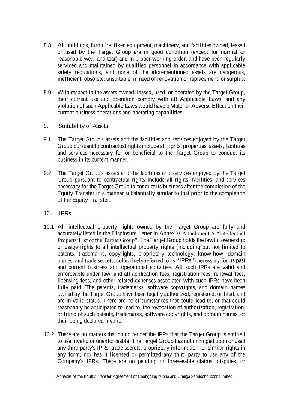 Annexes of the Equity Transfer Agreement of Chongqing Alpha and Omega Semiconductor Limited 8.8 All buildings, furniture, fixed equipment, machinery, and facilities owned, leased, or used by the Target Group are in good condition (except for normal or reasonable wear and tear) and in proper working order, and have been regularly serviced and maintained by qualified personnel in accordance with applicable safety regulations, and none of the aforementioned assets are dangerous, inefficient, obsolete, unsuitable, in need of renovation or replacement, or surplus. 8.9 With respect to the assets owned, leased, used, or operated by the Target Group, their current use and operation comply with all Applicable Laws, and any violation of such Applicable Laws would have a Material Adverse Effect on their current business operations and operating capabilities. 9. Suitability of Assets 9.1 The Target Group's assets and the facilities and services enjoyed by the Target Group pursuant to contractual rights include all rights, properties, assets, facilities, and services necessary for or beneficial to the Target Group to conduct its business in its current manner. 9.2 The Target Group's assets and the facilities and services enjoyed by the Target Group pursuant to contractual rights include all rights, facilities, and services necessary for the Target Group to conduct its business after the completion of the Equity Transfer in a manner substantially similar to that prior to the completion of the Equity Transfer. 10. IPRs 10.1 All intellectual property rights owned by the Target Group are fully and accurately listed in the Disclosure Letter in Annex V Attachment A “Intellectual Property List of the Target Group”. The Target Group holds the lawful ownership or usage rights to all intellectual property rights (including but not limited to patents, trademarks, copyrights, proprietary technology, know-how, domain names, and trade secrets, collectively referred to as “IPRs”) necessary for its past and current business and operational activities. All such IPRs are valid and enforceable under law, and all application fees, registration fees, renewal fees, licensing fees, and other related expenses associated with such IPRs have been fully paid. The patents, trademarks, software copyrights, and domain names owned by the Target Group have been legally authorized, registered, or filed, and are in valid status. There are no circumstances that could lead to, or that could reasonably be anticipated to lead to, the revocation of authorization, registration, or filing of such patents, trademarks, software copyrights, and domain names, or their being declared invalid. 10.2 There are no matters that could render the IPRs that the Target Group is entitled to use invalid or unenforceable. The Target Group has not infringed upon or used any third party's IPRs, trade secrets, proprietary information, or similar rights in any form, nor has it licensed or permitted any third party to use any of the Company's IPRs. There are no pending or foreseeable claims, disputes, or