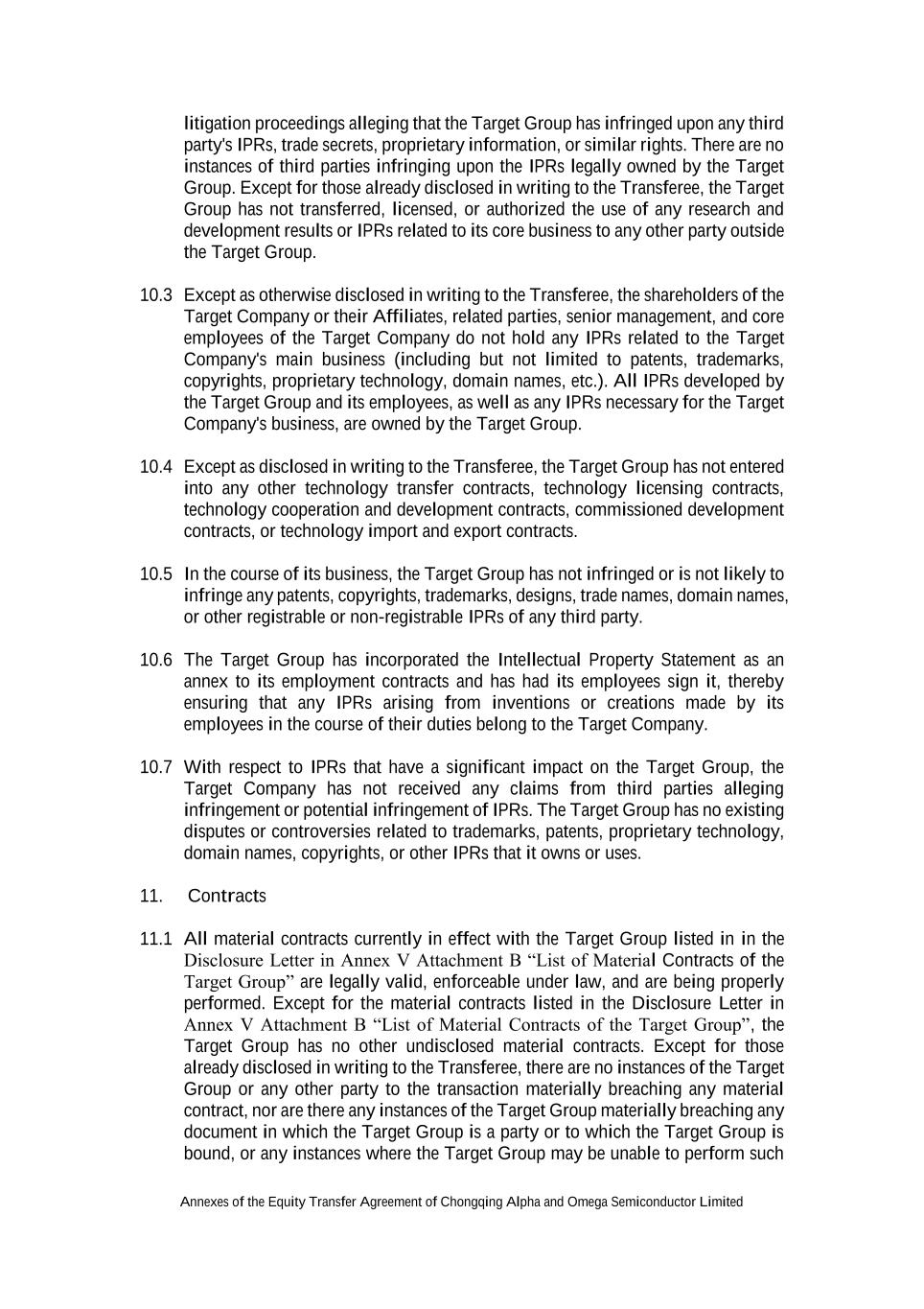 Annexes of the Equity Transfer Agreement of Chongqing Alpha and Omega Semiconductor Limited litigation proceedings alleging that the Target Group has infringed upon any third party's IPRs, trade secrets, proprietary information, or similar rights. There are no instances of third parties infringing upon the IPRs legally owned by the Target Group. Except for those already disclosed in writing to the Transferee, the Target Group has not transferred, licensed, or authorized the use of any research and development results or IPRs related to its core business to any other party outside the Target Group. 10.3 Except as otherwise disclosed in writing to the Transferee, the shareholders of the Target Company or their Affiliates, related parties, senior management, and core employees of the Target Company do not hold any IPRs related to the Target Company's main business (including but not limited to patents, trademarks, copyrights, proprietary technology, domain names, etc.). All IPRs developed by the Target Group and its employees, as well as any IPRs necessary for the Target Company's business, are owned by the Target Group. 10.4 Except as disclosed in writing to the Transferee, the Target Group has not entered into any other technology transfer contracts, technology licensing contracts, technology cooperation and development contracts, commissioned development contracts, or technology import and export contracts. 10.5 In the course of its business, the Target Group has not infringed or is not likely to infringe any patents, copyrights, trademarks, designs, trade names, domain names, or other registrable or non-registrable IPRs of any third party. 10.6 The Target Group has incorporated the Intellectual Property Statement as an annex to its employment contracts and has had its employees sign it, thereby ensuring that any IPRs arising from inventions or creations made by its employees in the course of their duties belong to the Target Company. 10.7 With respect to IPRs that have a significant impact on the Target Group, the Target Company has not received any claims from third parties alleging infringement or potential infringement of IPRs. The Target Group has no existing disputes or controversies related to trademarks, patents, proprietary technology, domain names, copyrights, or other IPRs that it owns or uses. 11. Contracts 11.1 All material contracts currently in effect with the Target Group listed in in the Disclosure Letter in Annex V Attachment B “List of Material Contracts of the Target Group” are legally valid, enforceable under law, and are being properly performed. Except for the material contracts listed in the Disclosure Letter in Annex V Attachment B “List of Material Contracts of the Target Group”, the Target Group has no other undisclosed material contracts. Except for those already disclosed in writing to the Transferee, there are no instances of the Target Group or any other party to the transaction materially breaching any material contract, nor are there any instances of the Target Group materially breaching any document in which the Target Group is a party or to which the Target Group is bound, or any instances where the Target Group may be unable to perform such