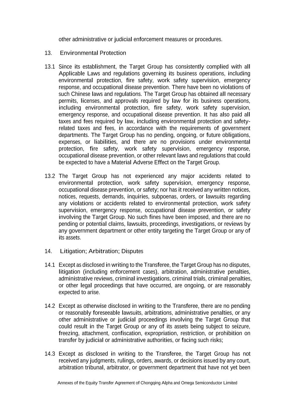 Annexes of the Equity Transfer Agreement of Chongqing Alpha and Omega Semiconductor Limited other administrative or judicial enforcement measures or procedures. 13. Environmental Protection 13.1 Since its establishment, the Target Group has consistently complied with all Applicable Laws and regulations governing its business operations, including environmental protection, fire safety, work safety supervision, emergency response, and occupational disease prevention. There have been no violations of such Chinese laws and regulations. The Target Group has obtained all necessary permits, licenses, and approvals required by law for its business operations, including environmental protection, fire safety, work safety supervision, emergency response, and occupational disease prevention. It has also paid all taxes and fees required by law, including environmental protection and safety- related taxes and fees, in accordance with the requirements of government departments. The Target Group has no pending, ongoing, or future obligations, expenses, or liabilities, and there are no provisions under environmental protection, fire safety, work safety supervision, emergency response, occupational disease prevention, or other relevant laws and regulations that could be expected to have a Material Adverse Effect on the Target Group. 13.2 The Target Group has not experienced any major accidents related to environmental protection, work safety supervision, emergency response, occupational disease prevention, or safety; nor has it received any written notices, notices, requests, demands, inquiries, subpoenas, orders, or lawsuits regarding any violations or accidents related to environmental protection, work safety supervision, emergency response, occupational disease prevention, or safety involving the Target Group. No such fines have been imposed, and there are no pending or potential claims, lawsuits, proceedings, investigations, or reviews by any government department or other entity targeting the Target Group or any of its assets. 14. Litigation; Arbitration; Disputes 14.1 Except as disclosed in writing to the Transferee, the Target Group has no disputes, litigation (including enforcement cases), arbitration, administrative penalties, administrative reviews, criminal investigations, criminal trials, criminal penalties, or other legal proceedings that have occurred, are ongoing, or are reasonably expected to arise. 14.2 Except as otherwise disclosed in writing to the Transferee, there are no pending or reasonably foreseeable lawsuits, arbitrations, administrative penalties, or any other administrative or judicial proceedings involving the Target Group that could result in the Target Group or any of its assets being subject to seizure, freezing, attachment, confiscation, expropriation, restriction, or prohibition on transfer by judicial or administrative authorities, or facing such risks; 14.3 Except as disclosed in writing to the Transferee, the Target Group has not received any judgments, rulings, orders, awards, or decisions issued by any court, arbitration tribunal, arbitrator, or government department that have not yet been