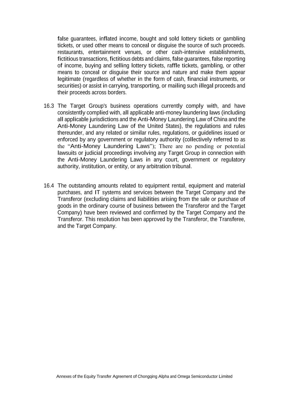 Annexes of the Equity Transfer Agreement of Chongqing Alpha and Omega Semiconductor Limited false guarantees, inflated income, bought and sold lottery tickets or gambling tickets, or used other means to conceal or disguise the source of such proceeds. restaurants, entertainment venues, or other cash-intensive establishments, fictitious transactions, fictitious debts and claims, false guarantees, false reporting of income, buying and selling lottery tickets, raffle tickets, gambling, or other means to conceal or disguise their source and nature and make them appear legitimate (regardless of whether in the form of cash, financial instruments, or securities) or assist in carrying, transporting, or mailing such illegal proceeds and their proceeds across borders. 16.3 The Target Group's business operations currently comply with, and have consistently complied with, all applicable anti-money laundering laws (including all applicable jurisdictions and the Anti-Money Laundering Law of China and the Anti-Money Laundering Law of the United States), the regulations and rules thereunder, and any related or similar rules, regulations, or guidelines issued or enforced by any government or regulatory authority (collectively referred to as the “Anti-Money Laundering Laws”); There are no pending or potential lawsuits or judicial proceedings involving any Target Group in connection with the Anti-Money Laundering Laws in any court, government or regulatory authority, institution, or entity, or any arbitration tribunal. 16.4 The outstanding amounts related to equipment rental, equipment and material purchases, and IT systems and services between the Target Company and the Transferor (excluding claims and liabilities arising from the sale or purchase of goods in the ordinary course of business between the Transferor and the Target Company) have been reviewed and confirmed by the Target Company and the Transferor. This resolution has been approved by the Transferor, the Transferee, and the Target Company.