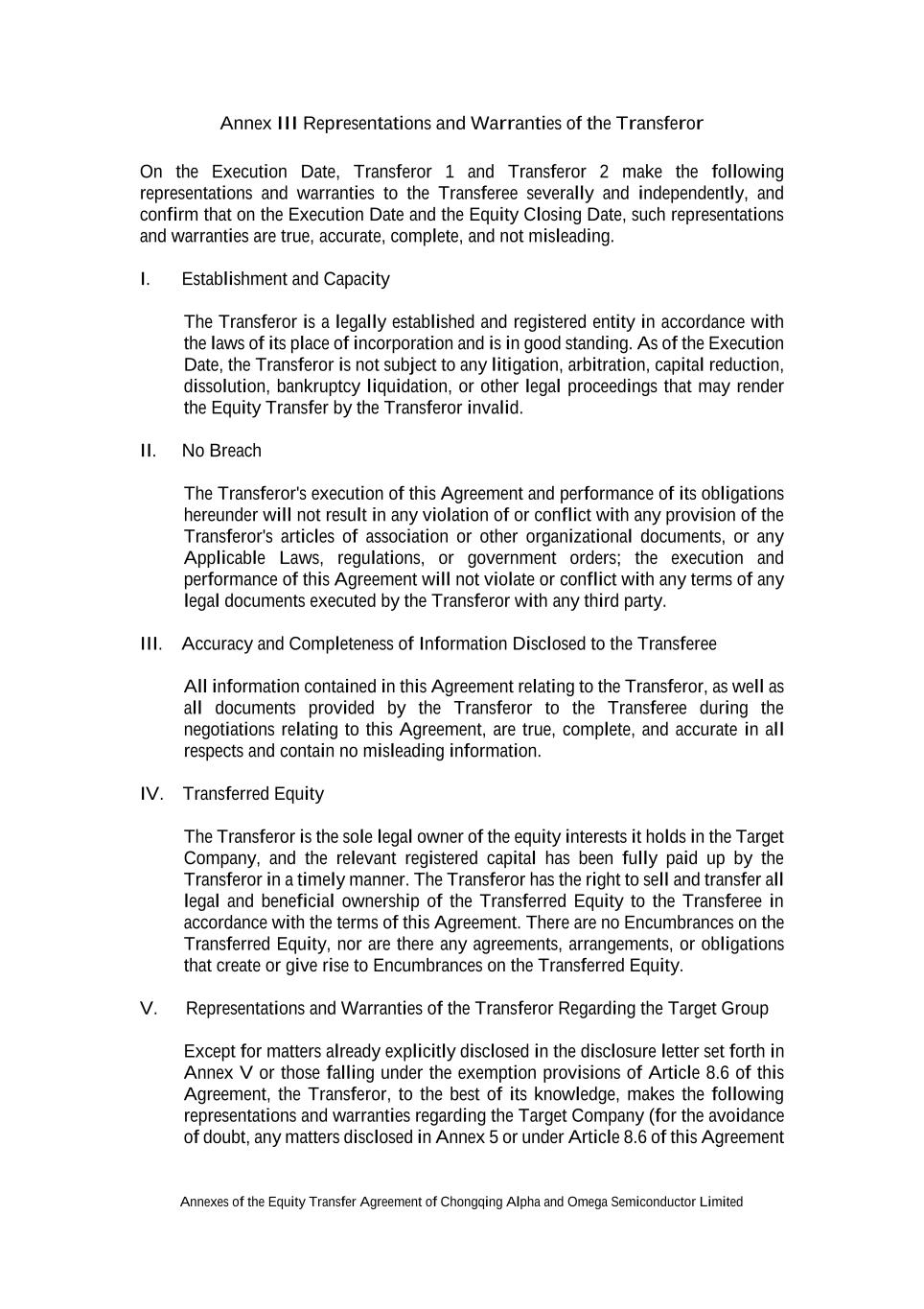 Annexes of the Equity Transfer Agreement of Chongqing Alpha and Omega Semiconductor Limited Annex III Representations and Warranties of the Transferor On the Execution Date, Transferor 1 and Transferor 2 make the following representations and warranties to the Transferee severally and independently, and confirm that on the Execution Date and the Equity Closing Date, such representations and warranties are true, accurate, complete, and not misleading. I. Establishment and Capacity The Transferor is a legally established and registered entity in accordance with the laws of its place of incorporation and is in good standing. As of the Execution Date, the Transferor is not subject to any litigation, arbitration, capital reduction, dissolution, bankruptcy liquidation, or other legal proceedings that may render the Equity Transfer by the Transferor invalid. II. No Breach The Transferor's execution of this Agreement and performance of its obligations hereunder will not result in any violation of or conflict with any provision of the Transferor's articles of association or other organizational documents, or any Applicable Laws, regulations, or government orders; the execution and performance of this Agreement will not violate or conflict with any terms of any legal documents executed by the Transferor with any third party. III. Accuracy and Completeness of Information Disclosed to the Transferee All information contained in this Agreement relating to the Transferor, as well as all documents provided by the Transferor to the Transferee during the negotiations relating to this Agreement, are true, complete, and accurate in all respects and contain no misleading information. IV. Transferred Equity The Transferor is the sole legal owner of the equity interests it holds in the Target Company, and the relevant registered capital has been fully paid up by the Transferor in a timely manner. The Transferor has the right to sell and transfer all legal and beneficial ownership of the Transferred Equity to the Transferee in accordance with the terms of this Agreement. There are no Encumbrances on the Transferred Equity, nor are there any agreements, arrangements, or obligations that create or give rise to Encumbrances on the Transferred Equity. V. Representations and Warranties of the Transferor Regarding the Target Group Except for matters already explicitly disclosed in the disclosure letter set forth in Annex V or those falling under the exemption provisions of Article 8.6 of this Agreement, the Transferor, to the best of its knowledge, makes the following representations and warranties regarding the Target Company (for the avoidance of doubt, any matters disclosed in Annex 5 or under Article 8.6 of this Agreement