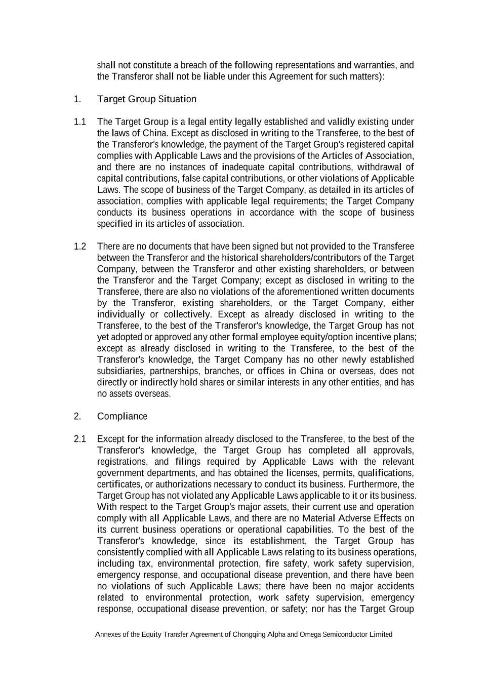 Annexes of the Equity Transfer Agreement of Chongqing Alpha and Omega Semiconductor Limited shall not constitute a breach of the following representations and warranties, and the Transferor shall not be liable under this Agreement for such matters): 1. Target Group Situation 1.1 The Target Group is a legal entity legally established and validly existing under the laws of China. Except as disclosed in writing to the Transferee, to the best of the Transferor's knowledge, the payment of the Target Group's registered capital complies with Applicable Laws and the provisions of the Articles of Association, and there are no instances of inadequate capital contributions, withdrawal of capital contributions, false capital contributions, or other violations of Applicable Laws. The scope of business of the Target Company, as detailed in its articles of association, complies with applicable legal requirements; the Target Company conducts its business operations in accordance with the scope of business specified in its articles of association. 1.2 There are no documents that have been signed but not provided to the Transferee between the Transferor and the historical shareholders/contributors of the Target Company, between the Transferor and other existing shareholders, or between the Transferor and the Target Company; except as disclosed in writing to the Transferee, there are also no violations of the aforementioned written documents by the Transferor, existing shareholders, or the Target Company, either individually or collectively. Except as already disclosed in writing to the Transferee, to the best of the Transferor's knowledge, the Target Group has not yet adopted or approved any other formal employee equity/option incentive plans; except as already disclosed in writing to the Transferee, to the best of the Transferor's knowledge, the Target Company has no other newly established subsidiaries, partnerships, branches, or offices in China or overseas, does not directly or indirectly hold shares or similar interests in any other entities, and has no assets overseas. 2. Compliance 2.1 Except for the information already disclosed to the Transferee, to the best of the Transferor's knowledge, the Target Group has completed all approvals, registrations, and filings required by Applicable Laws with the relevant government departments, and has obtained the licenses, permits, qualifications, certificates, or authorizations necessary to conduct its business. Furthermore, the Target Group has not violated any Applicable Laws applicable to it or its business. With respect to the Target Group's major assets, their current use and operation comply with all Applicable Laws, and there are no Material Adverse Effects on its current business operations or operational capabilities. To the best of the Transferor's knowledge, since its establishment, the Target Group has consistently complied with all Applicable Laws relating to its business operations, including tax, environmental protection, fire safety, work safety supervision, emergency response, and occupational disease prevention, and there have been no violations of such Applicable Laws; there have been no major accidents related to environmental protection, work safety supervision, emergency response, occupational disease prevention, or safety; nor has the Target Group