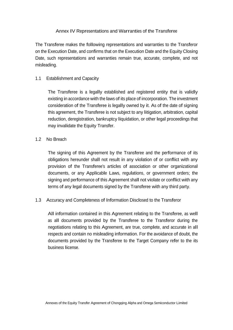 Annexes of the Equity Transfer Agreement of Chongqing Alpha and Omega Semiconductor Limited Annex IV Representations and Warranties of the Transferee The Transferee makes the following representations and warranties to the Transferor on the Execution Date, and confirms that on the Execution Date and the Equity Closing Date, such representations and warranties remain true, accurate, complete, and not misleading. 1.1 Establishment and Capacity The Transferee is a legally established and registered entity that is validly existing in accordance with the laws of its place of incorporation. The investment consideration of the Transferee is legally owned by it. As of the date of signing this agreement, the Transferee is not subject to any litigation, arbitration, capital reduction, deregistration, bankruptcy liquidation, or other legal proceedings that may invalidate the Equity Transfer. 1.2 No Breach The signing of this Agreement by the Transferee and the performance of its obligations hereunder shall not result in any violation of or conflict with any provision of the Transferee's articles of association or other organizational documents, or any Applicable Laws, regulations, or government orders; the signing and performance of this Agreement shall not violate or conflict with any terms of any legal documents signed by the Transferee with any third party. 1.3 Accuracy and Completeness of Information Disclosed to the Transferor All information contained in this Agreement relating to the Transferee, as well as all documents provided by the Transferee to the Transferor during the negotiations relating to this Agreement, are true, complete, and accurate in all respects and contain no misleading information. For the avoidance of doubt, the documents provided by the Transferee to the Target Company refer to the its business license.