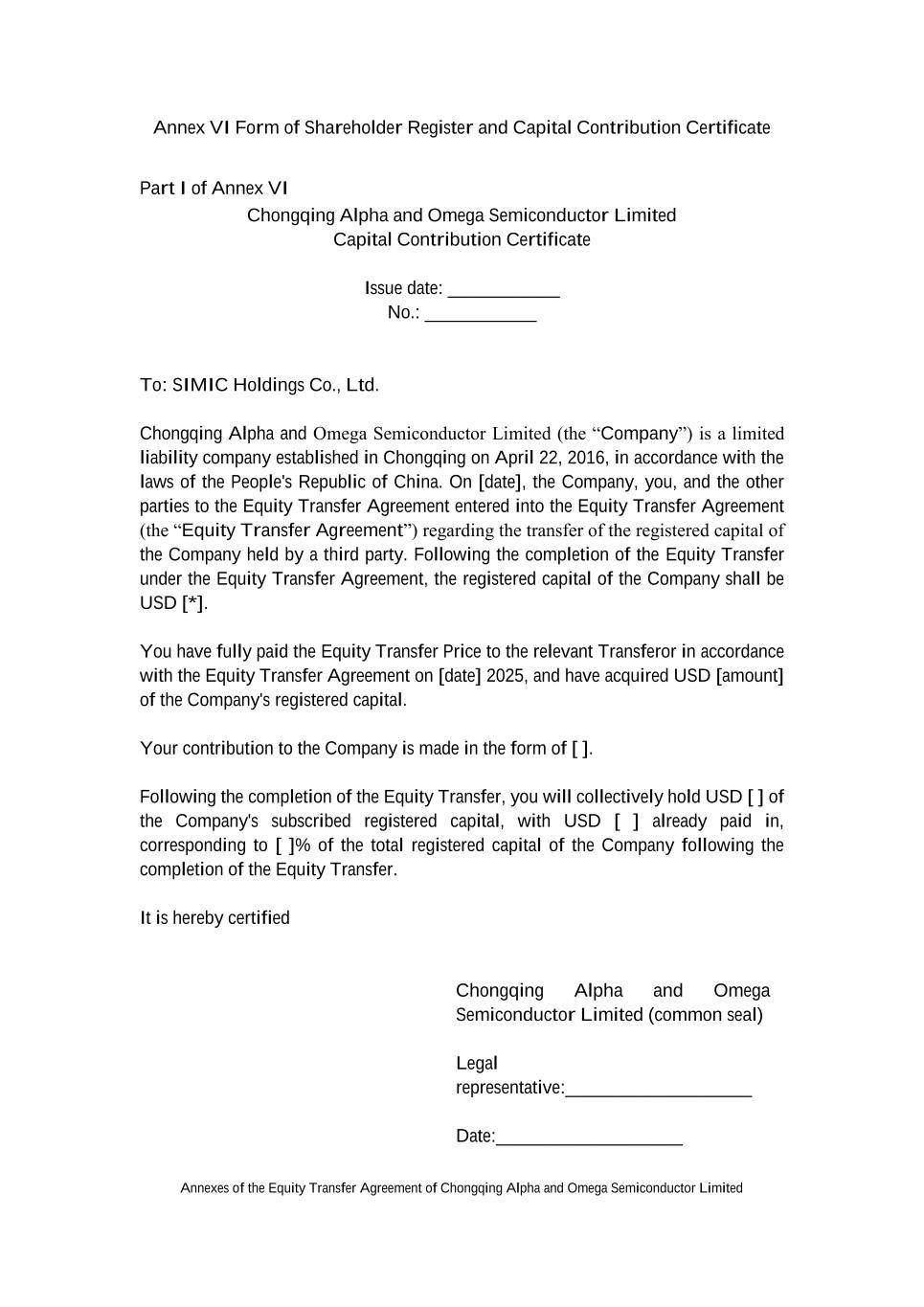 Annexes of the Equity Transfer Agreement of Chongqing Alpha and Omega Semiconductor Limited Annex VI Form of Shareholder Register and Capital Contribution Certificate Part I of Annex VI Chongqing Alpha and Omega Semiconductor Limited Capital Contribution Certificate Issue date: ____________ No.: ____________ To: SIMIC Holdings Co., Ltd. Chongqing Alpha and Omega Semiconductor Limited (the “Company”) is a limited liability company established in Chongqing on April 22, 2016, in accordance with the laws of the People's Republic of China. On [date], the Company, you, and the other parties to the Equity Transfer Agreement entered into the Equity Transfer Agreement (the “Equity Transfer Agreement”) regarding the transfer of the registered capital of the Company held by a third party. Following the completion of the Equity Transfer under the Equity Transfer Agreement, the registered capital of the Company shall be USD [*]. You have fully paid the Equity Transfer Price to the relevant Transferor in accordance with the Equity Transfer Agreement on [date] 2025, and have acquired USD [amount] of the Company's registered capital. Your contribution to the Company is made in the form of [ ]. Following the completion of the Equity Transfer, you will collectively hold USD [ ] of the Company's subscribed registered capital, with USD [ ] already paid in, corresponding to [ ]% of the total registered capital of the Company following the completion of the Equity Transfer. It is hereby certified Chongqing Alpha and Omega Semiconductor Limited (common seal) Legal representative:____________________ Date:____________________