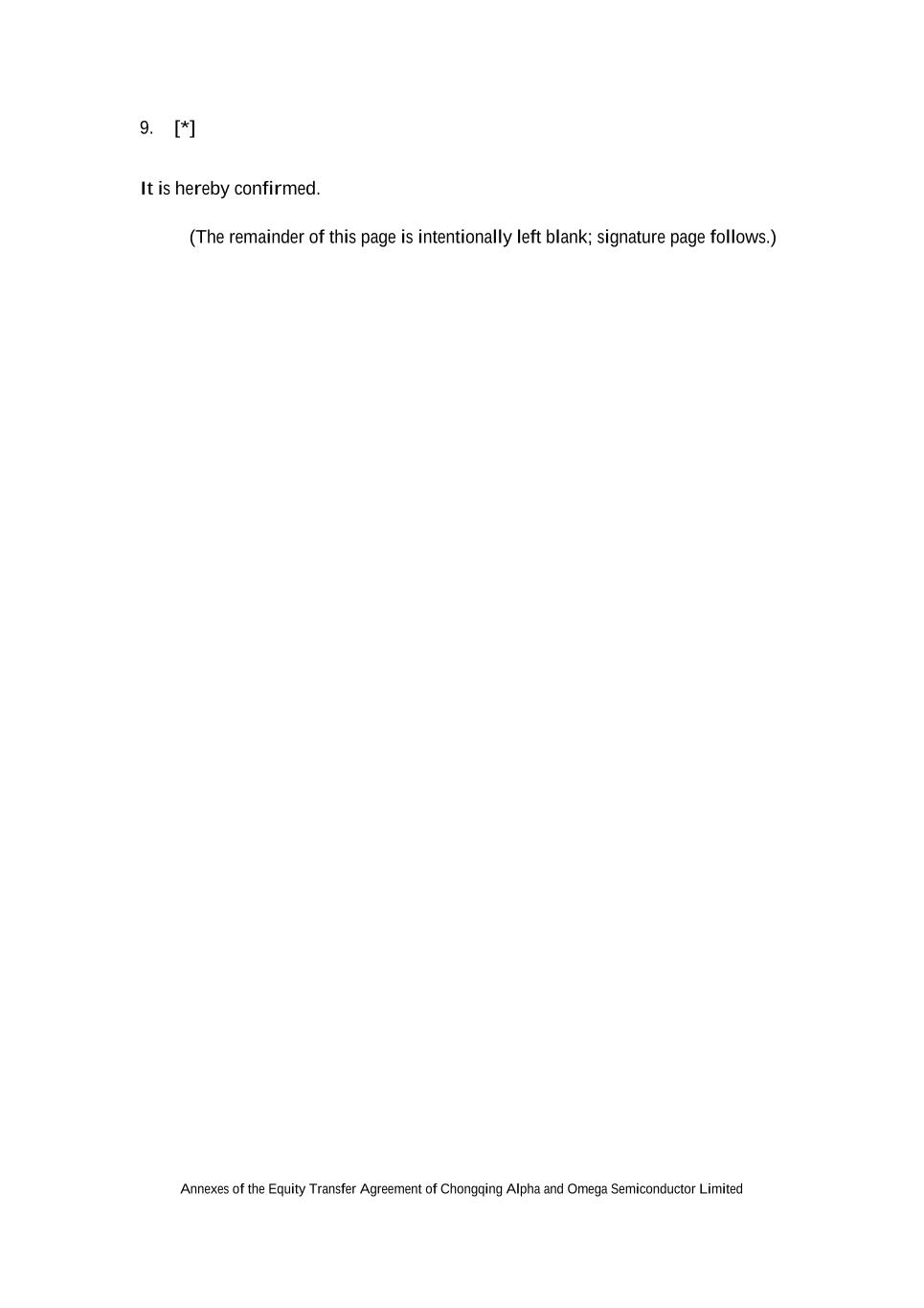 Annexes of the Equity Transfer Agreement of Chongqing Alpha and Omega Semiconductor Limited 9. [*] It is hereby confirmed. (The remainder of this page is intentionally left blank; signature page follows.)