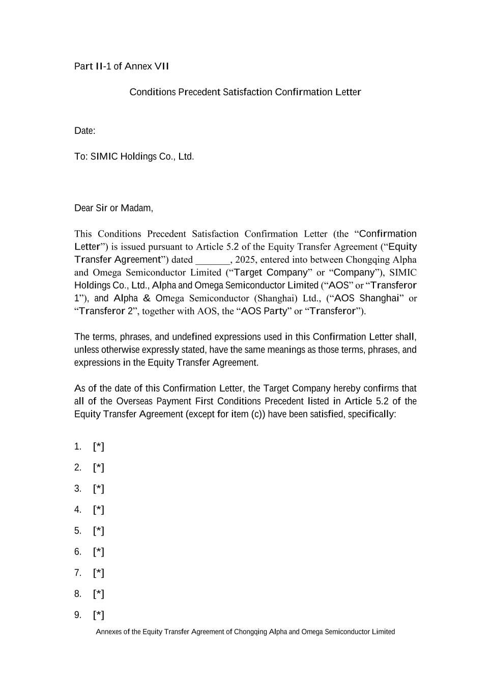 Annexes of the Equity Transfer Agreement of Chongqing Alpha and Omega Semiconductor Limited Part II-1 of Annex VII Conditions Precedent Satisfaction Confirmation Letter Date: To: SIMIC Holdings Co., Ltd. Dear Sir or Madam, This Conditions Precedent Satisfaction Confirmation Letter (the “Confirmation Letter”) is issued pursuant to Article 5.2 of the Equity Transfer Agreement (“Equity Transfer Agreement”) dated _______, 2025, entered into between Chongqing Alpha and Omega Semiconductor Limited (“Target Company” or “Company”), SIMIC Holdings Co., Ltd., Alpha and Omega Semiconductor Limited (“AOS” or “Transferor 1”), and Alpha & Omega Semiconductor (Shanghai) Ltd., (“AOS Shanghai” or “Transferor 2”, together with AOS, the “AOS Party” or “Transferor”). The terms, phrases, and undefined expressions used in this Confirmation Letter shall, unless otherwise expressly stated, have the same meanings as those terms, phrases, and expressions in the Equity Transfer Agreement. As of the date of this Confirmation Letter, the Target Company hereby confirms that all of the Overseas Payment First Conditions Precedent listed in Article 5.2 of the Equity Transfer Agreement (except for item (c)) have been satisfied, specifically: 1. [*] 2. [*] 3. [*] 4. [*] 5. [*] 6. [*] 7. [*] 8. [*] 9. [*]