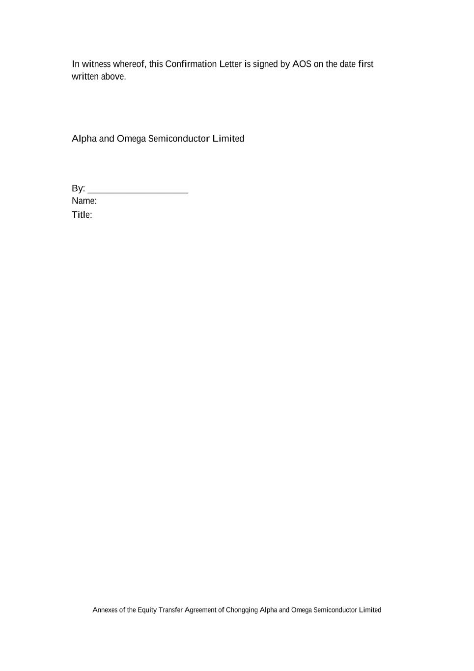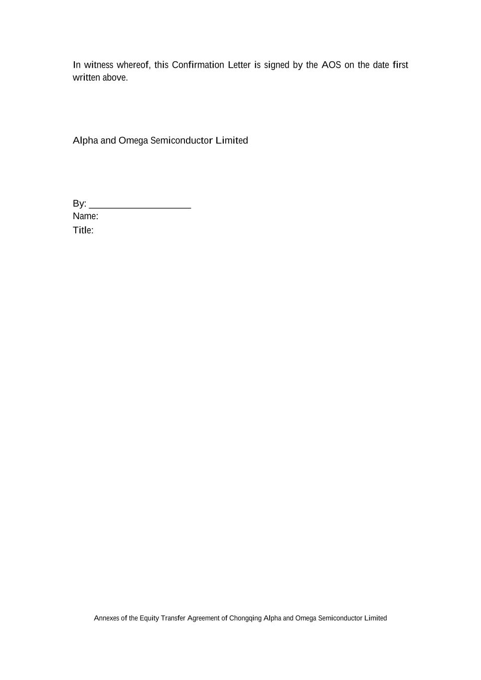 Annexes of the Equity Transfer Agreement of Chongqing Alpha and Omega Semiconductor Limited In witness whereof, this Confirmation Letter is signed by AOS on the date first written above. Alpha and Omega Semiconductor Limited By: _____________________ Name: Title: