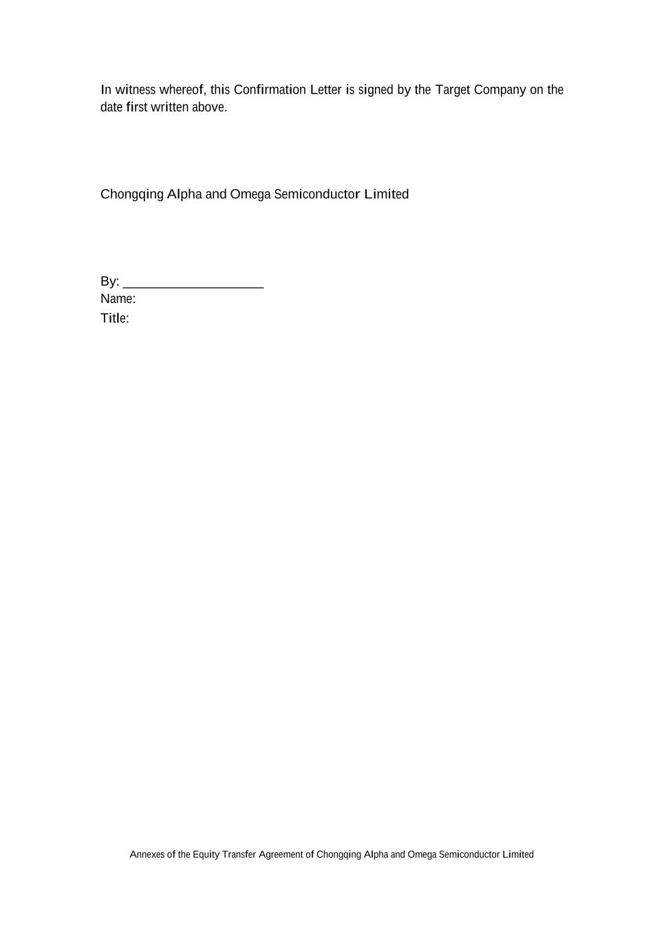 Annexes of the Equity Transfer Agreement of Chongqing Alpha and Omega Semiconductor Limited In witness whereof, this Confirmation Letter is signed by Target Company on the date first written above. Chongqing Alpha and Omega Semiconductor Limited By: _____________________ Name: Title:
