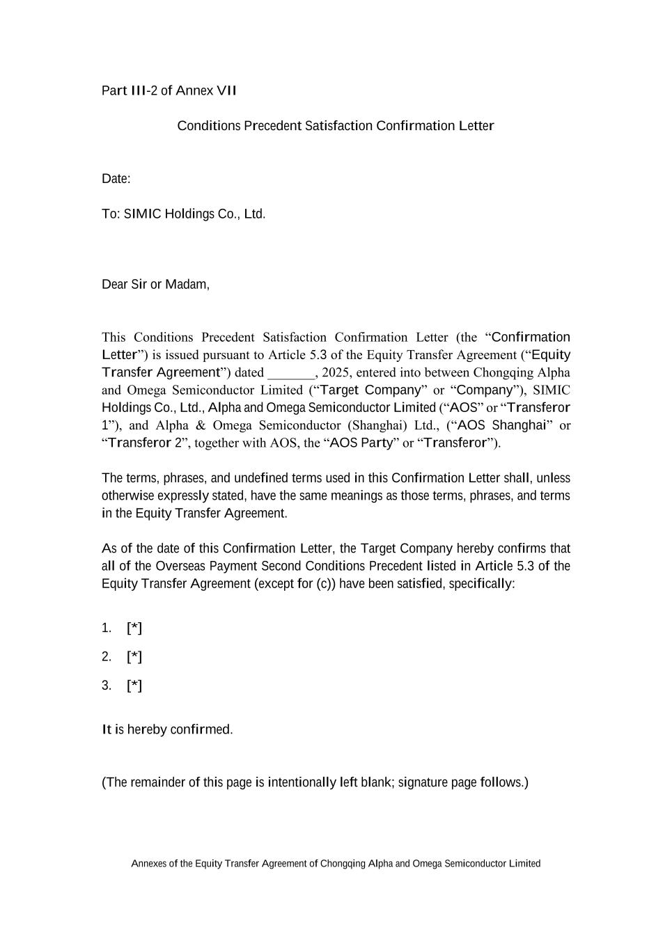 Annexes of the Equity Transfer Agreement of Chongqing Alpha and Omega Semiconductor Limited Part III-2 of Annex VII Conditions Precedent Satisfaction Confirmation Letter Date: To: SIMIC Holdings Co., Ltd. Dear Sir or Madam, This Conditions Precedent Satisfaction Confirmation Letter (the “Confirmation Letter”) is issued pursuant to Article 5.3 of the Equity Transfer Agreement (“Equity Transfer Agreement”) dated _______, 2025, entered into between Chongqing Alpha and Omega Semiconductor Limited (“Target Company” or “Company”), SIMIC Holdings Co., Ltd., Alpha and Omega Semiconductor Limited (“AOS” or “Transferor 1”), and Alpha & Omega Semiconductor (Shanghai) Ltd., (“AOS Shanghai” or “Transferor 2”, together with AOS, the “AOS Party” or “Transferor”). The terms, phrases, and undefined terms used in this Confirmation Letter shall, unless otherwise expressly stated, have the same meanings as those terms, phrases, and terms in the Equity Transfer Agreement. As of the date of this Confirmation Letter, the Target Company hereby confirms that all of the Overseas Payment Second Conditions Precedent listed in Article 5.3 of the Equity Transfer Agreement (except for (c)) have been satisfied, specifically: 1. [*] 2. [*] 3. [*] It is hereby confirmed. (The remainder of this page is intentionally left blank; signature page follows.)