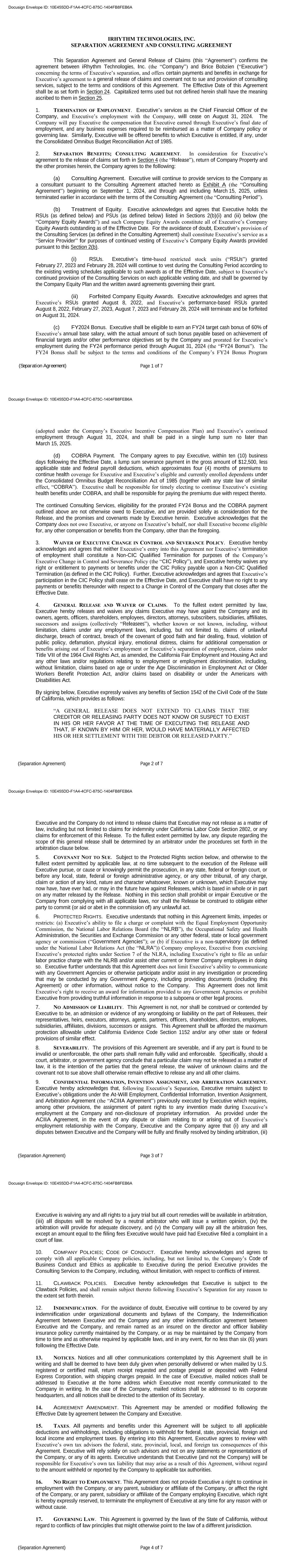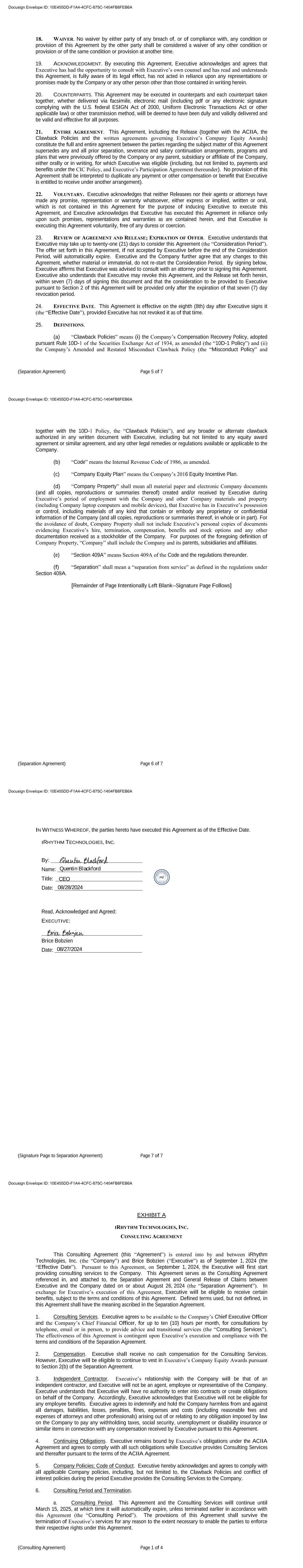 Page 1 of 7 IRHYTHM TECHNOLOGIES, INC. SEPARATION AGREEMENT AND CONSULTING AGREEMENT This Separation Agreement and General Release of Claims (this “Agreement”) confirms the agreement between iRhythm Technologies, Inc. (the “Company”) and Brice Bobzien (“Executive”) concerning the terms of Executive’s separation, and offers certain payments and benefits in exchange for Executive’s agreement to a general release of claims and covenant not to sue and provision of consulting services, subject to the terms and conditions of this Agreement. The Effective Date of this Agreement shall be as set forth in Section 24. Capitalized terms used but not defined herein shall have the meaning ascribed to them in Section 25. 1. TERMINATION OF EMPLOYMENT. Executive’s services as the Chief Financial Officer of the Company, and Executive’s employment with the Company, will cease on August 31, 2024. The Company will pay Executive the compensation that Executive earned through Executive’s final date of employment, and any business expenses required to be reimbursed as a matter of Company policy or governing law. Similarly, Executive will be offered benefits to which Executive is entitled, if any, under the Consolidated Omnibus Budget Reconciliation Act of 1985. 2. SEPARATION BENEFITS; CONSULTING AGREEMENT. In consideration for Executive’s agreement to the release of claims set forth in Section 4 (the “Release”), return of Company Property and the other promises herein, the Company agrees to the following: (a) Consulting Agreement. Executive will continue to provide services to the Company as a consultant pursuant to the Consulting Agreement attached hereto as Exhibit A (the “Consulting Agreement”) beginning on September 1, 2024, and through and including March 15, 2025, unless terminated earlier in accordance with the terms of the Consulting Agreement (the “Consulting Period”). (b) Treatment of Equity. Executive acknowledges and agrees that Executive holds the RSUs (as defined below) and PSUs (as defined below) listed in Sections 2(b)(i) and (ii) below (the “Company Equity Awards”) and such Company Equity Awards constitute all of Executive’s Company Equity Awards outstanding as of the Effective Date. For the avoidance of doubt, Executive’s provision of the Consulting Services (as defined in the Consulting Agreement) shall constitute Executive’s service as a “Service Provider” for purposes of continued vesting of Executive’s Company Equity Awards provided pursuant to this Section 2(b). (i) RSUs. Executive’s time-based restricted stock units (“RSUs”) granted February 27, 2023 and February 28, 2024 will continue to vest during the Consulting Period according to the existing vesting schedules applicable to such awards as of the Effective Date, subject to Executive’s continued provision of the Consulting Services on each applicable vesting date, and shall be governed by the Company Equity Plan and the written award agreements governing their grant. (ii) Forfeited Company Equity Awards. Executive acknowledges and agrees that Executive’s RSUs granted August 8, 2022, and Executive’s performance-based RSUs granted August 8, 2022, February 27, 2023, August 7, 2023 and February 28, 2024 will terminate and be forfeited on August 31, 2024. (c) FY2024 Bonus. Executive shall be eligible to earn an FY24 target cash bonus of 60% of Executive’s annual base salary, with the actual amount of such bonus payable based on achievement of financial targets and/or other performance objectives set by the Company and prorated for Executive’s employment during the FY24 performance period through August 31, 2024 (the “FY24 Bonus”). The FY24 Bonus shall be subject to the terms and conditions of the Company’s FY24 Bonus Program (Separation Agreement) Docusign Envelope ID: 40AB1010-80AF-47EC-BD47-2DF7E51A51A31 E455DD-F1A4-4CFC-875C-1404FB8FEB6A (Separation Agreement) Page 2 of 7 (adopted under the Company’s Executive Incentive Compensation Plan) and Executive’s continued employment through August 31, 2024, and shall be paid in a single lump sum no later than March 15, 2025. (d) COBRA Payment. The Company agrees to pay Executive, within ten (10) business days following the Effective Date, a lump sum severance payment in the gross amount of $12,500, less applicable state and federal payroll deductions, which approximates four (4) months of premiums to continue health coverage for Executive and Executive’s eligible and currently enrolled dependents under the Consolidated Omnibus Budget Reconciliation Act of 1985 (together with any state law of similar effect, “COBRA”). Executive shall be responsible for timely electing to continue Executive’s existing health benefits under COBRA, and shall be responsible for paying the premiums due with respect thereto. The continued Consulting Services, eligibility for the prorated FY24 Bonus and the COBRA payment outlined above are not otherwise owed to Executive, and are provided solely as consideration for the Release, and the promises and covenants made by Executive herein. Executive acknowledges that the Company does not owe Executive, or anyone on Executive’s behalf, nor shall Executive become eligible for, any other compensation or benefits from the Company, other than the foregoing. 3. WAIVER OF EXECUTIVE CHANGE IN CONTROL AND SEVERANCE POLICY. Executive hereby acknowledges and agrees that neither Executive’s entry into this Agreement nor Executive’s termination of employment shall constitute a Non-CIC Qualified Termination for purposes of the Company’s Executive Change in Control and Severance Policy (the “CIC Policy”), and Executive hereby waives any right or entitlement to payments or benefits under the CIC Policy payable upon a Non-CIC Qualified Termination (as defined in the CIC Policy). Further, Executive acknowledges and agrees that Executive’s participation in the CIC Policy shall cease on the Effe