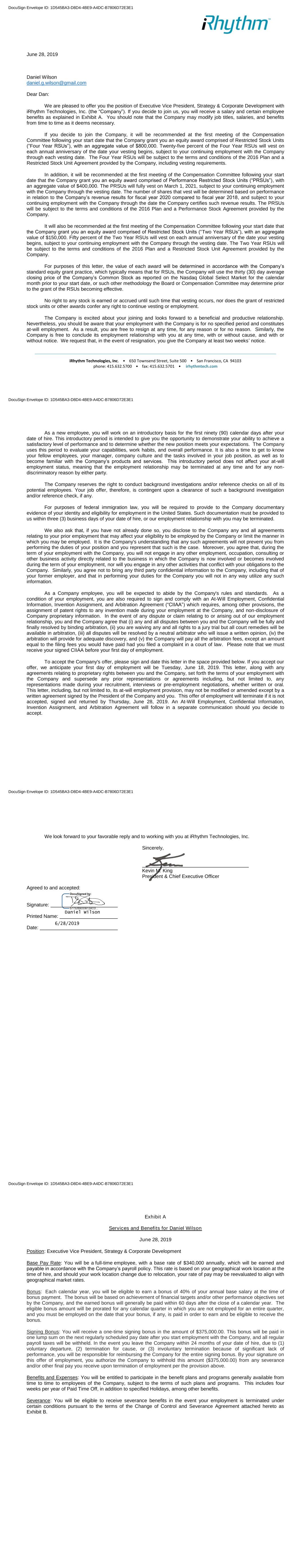 iRhythm Technologies, Inc. • 650 Townsend Street, Suite 500 • San Francisco, CA 94103 phone: 415.632.5700 • fax: 415.632.5701 • irhythmtech.com June 28, 2019 Daniel Wilson daniel.g.wilson@gmail.com Dear Dan: We are pleased to offer you the position of Executive Vice President, Strategy & Corporate Development with iRhythm Technologies, Inc. (the “Company”). If you decide to join us, you will receive a salary and certain employee benefits as explained in Exhibit A. You should note that the Company may modify job titles, salaries, and benefits from time to time as it deems necessary. If you decide to join the Company, it will be recommended at the first meeting of the Compensation Committee following your start date that the Company grant you an equity award comprised of Restricted Stock Units (“Four Year RSUs”), with an aggregate value of $800,000. Twenty-five percent of the Four Year RSUs will vest on each annual anniversary of the date your vesting begins, subject to your continuing employment with the Company through each vesting date. The Four Year RSUs will be subject to the terms and conditions of the 2016 Plan and a Restricted Stock Unit Agreement provided by the Company, including vesting requirements. In addition, it will be recommended at the first meeting of the Compensation Committee following your start date that the Company grant you an equity award comprised of Performance Restricted Stock Units (“PRSUs”), with an aggregate value of $400,000. The PRSUs will fully vest on March 1, 2021, subject to your continuing employment with the Company through the vesting date. The number of shares that vest will be determined based on performance in relation to the Company’s revenue results for fiscal year 2020 compared to fiscal year 2018, and subject to your continuing employment with the Company through the date the Company certifies such revenue results. The PRSUs will be subject to the terms and conditions of the 2016 Plan and a Performance Stock Agreement provided by the Company. It will also be recommended at the first meeting of the Compensation Committee following your start date that the Company grant you an equity award comprised of Restricted Stock Units (“Two Year RSUs”), with an aggregate value of $150,000. Fifty percent of the Two Year RSUs will vest on each annual anniversary of the date your vesting begins, subject to your continuing employment with the Company through the vesting date. The Two Year RSUs will be subject to the terms and conditions of the 2016 Plan and a Restricted Stock Unit Agreement provided by the Company. For purposes of this letter, the value of each award will be determined in accordance with the Company’s standard equity grant practice, which typically means that for RSUs, the Company will use the thirty (30) day average closing price of the Company’s Common Stock as reported on the Nasdaq Global Select Market for the calendar month prior to your start date, or such other methodology the Board or Compensation Committee may determine prior to the grant of the RSUs becoming effective. No right to any stock is earned or accrued until such time that vesting occurs, nor does the grant of restricted stock units or other awards confer any right to continue vesting or employment. The Company is excited about your joining and looks forward to a beneficial and productive relationship. Nevertheless, you should be aware that your employment with the Company is for no specified period and constitutes at-will employment. As a result, you are free to resign at any time, for any reason or for no reason. Similarly, the Company is free to conclude its employment relationship with you at any time, with or without cause, and with or without notice. We request that, in the event of resignation, you give the Company at least two weeks’ notice. DocuSign Envelope ID: 1D545BA3-D8D4-4BE9-A4DC-B7806D72E3E1 As a new employee, you will work on an introductory basis for the first ninety (90) calendar days after your date of hire. This introductory period is intended to give you the opportunity to demonstrate your ability to achieve a satisfactory level of performance and to determine whether the new position meets your expectations. The Company uses this period to evaluate your capabilities, work habits, and overall performance. It is also a time to get to know your fellow employees, your manager, company culture and the tasks involved in your job position, as well as to become familiar with the Company’s products and services. This introductory period does not affect your at-will employment status, meaning that the employment relationship may be terminated at any time and for any non- discriminatory reason by either party. The Company reserves the right to conduct background investigations and/or reference checks on all of its potential employees. Your job offer, therefore, is contingent upon a clearance of such a background investigation and/or reference check, if any. For purposes of federal immigration law, you will be required to provide to the Company documentary evidence of your identity and eligibility for employment in the United States. Such documentation must be provided to us within three (3) business days of your date of hire, or our employment relationship with you may be terminated. We also ask that, if you have not already done so, you disclose to the Company any and all agreements relating to your prior employment that may affect your eligibility to be employed by the Company or limit the manner in which you may be employed. It is the Company's understanding that any such agreements will not prevent you from performing the duties of your position and you represent that such is the case. Moreover, you agree that, during the term of your employment with the Company, you will not engage in any other employment, occupation, consulting or other business activity directly related to the business in which the Company is now involve
