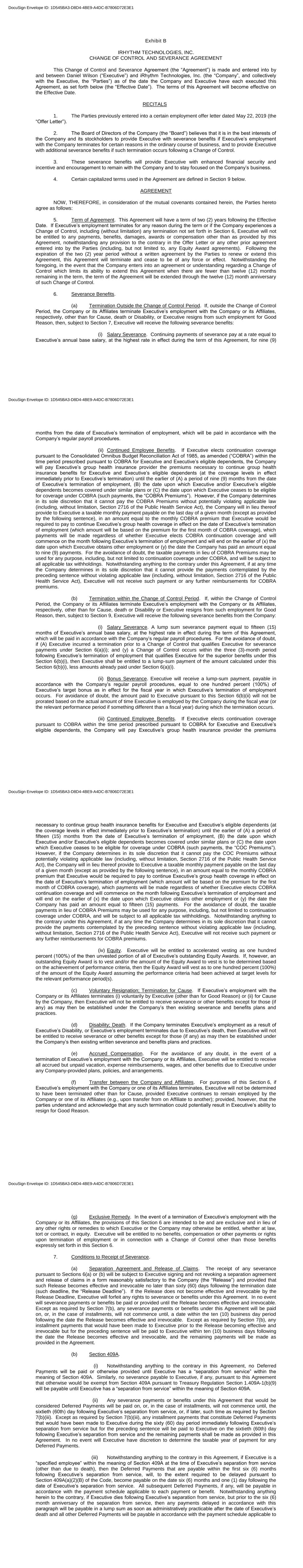 Exhibit B IRHYTHM TECHNOLOGIES, INC. CHANGE OF CONTROL AND SEVERANCE AGREEMENT This Change of Control and Severance Agreement (the “Agreement”) is made and entered into by and between Daniel Wilson (“Executive”) and iRhythm Technologies, Inc. (the “Company”, and collectively with the Executive, the “Parties”) as of the date the Company and Executive have each executed this Agreement, as set forth below (the “Effective Date”). The terms of this Agreement will become effective on the Effective Date. RECITALS 1. The Parties previously entered into a certain employment offer letter dated May 22, 2019 (the “Offer Letter”). 2. The Board of Directors of the Company (the “Board”) believes that it is in the best interests of the Company and its stockholders to provide Executive with severance benefits if Executive’s employment with the Company terminates for certain reasons in the ordinary course of business, and to provide Executive with additional severance benefits if such termination occurs following a Change of Control. 3. These severance benefits will provide Executive with enhanced financial security and incentive and encouragement to remain with the Company and to stay focused on the Company’s business. 4. Certain capitalized terms used in the Agreement are defined in Section 9 below. AGREEMENT NOW, THEREFORE, in consideration of the mutual covenants contained herein, the Parties hereto agree as follows: 5. Term of Agreement. This Agreement will have a term of two (2) years following the Effective Date. If Executive’s employment terminates for any reason during the term or if the Company experiences a Change of Control, including (without limitation) any termination not set forth in Section 6, Executive will not be entitled to any payments, benefits, damages, awards or compensation other than as provided by this Agreement, notwithstanding any provision to the contrary in the Offer Letter or any other prior agreement entered into by the Parties (including, but not limited to, any Equity Award agreements). Following the expiration of the two (2) year period without a written agreement by the Parties to renew or extend this Agreement, this Agreement will terminate and cease to be of any force or effect. Notwithstanding the foregoing, in the event that the Company enters into an agreement or understanding regarding a Change of Control which limits its ability to extend this Agreement when there are fewer than twelve (12) months remaining in the term, the term of the Agreement will be extended through the twelve (12) month anniversary of such Change of Control. 6. Severance Benefits. (a) Termination Outside the Change of Control Period. If, outside the Change of Control Period, the Company or its Affiliates terminate Executive’s employment with the Company or its Affiliates, respectively, other than for Cause, death or Disability, or Executive resigns from such employment for Good Reason, then, subject to Section 7, Executive will receive the following severance benefits: (i) Salary Severance. Continuing payments of severance pay at a rate equal to Executive’s annual base salary, at the highest rate in effect during the term of this Agreement, for nine (9) DocuSign Envelope ID: 1D545BA3-D8D4-4BE9-A4DC-B7806D72E3E1 months from the date of Executive’s termination of employment, which will be paid in accordance with the Company’s regular payroll procedures. (ii) Continued Employee Benefits. If Executive elects continuation coverage pursuant to the Consolidated Omnibus Budget Reconciliation Act of 1985, as amended (“COBRA”) within the time period prescribed pursuant to COBRA for Executive and Executive’s eligible dependents, the Company will pay Executive’s group health insurance provider the premiums necessary to continue group health insurance benefits for Executive and Executive’s eligible dependents (at the coverage levels in effect immediately prior to Executive’s termination) until the earlier of (A) a period of nine (9) months from the date of Executive’s termination of employment, (B) the date upon which Executive and/or Executive’s eligible dependents becomes covered under similar plans or (C) the date upon which Executive ceases to be eligible for coverage under COBRA (such payments, the “COBRA Premiums”). However, if the Company determines in its sole discretion that it cannot pay the COBRA Premiums without potentially violating applicable law (including, without limitation, Section 2716 of the Public Health Service Act), the Company will in lieu thereof provide to Executive a taxable monthly payment payable on the last day of a given month (except as provided by the following sentence), in an amount equal to the monthly COBRA premium that Executive would be required to pay to continue Executive’s group health coverage in effect on the date of Executive’s termination of employment (which amount will be based on the premium for the first month of COBRA coverage), which payments will be made regardless of whether Executive elects COBRA continuation coverage and will commence on the month following Executive’s termination of employment and will end on the earlier of (x) the date upon which Executive obtains other employment or (y) the date the Company has paid an amount equal to nine (9) payments. For the avoidance of doubt, the taxable payments in lieu of COBRA Premiums may be used for any purpose, including, but not limited to continuation coverage under COBRA, and will be subject to all applicable tax withholdings. Notwithstanding anything to the contrary under this Agreement, if at any time the Company determines in its sole discretion that it cannot provide the payments contemplated by the preceding sentence without violating applicable law (including, without limitation, Section 2716 of the Public Health Service Act), Executive will not receive such payment or any further reimbursements for COBRA premiums. (b) Termin