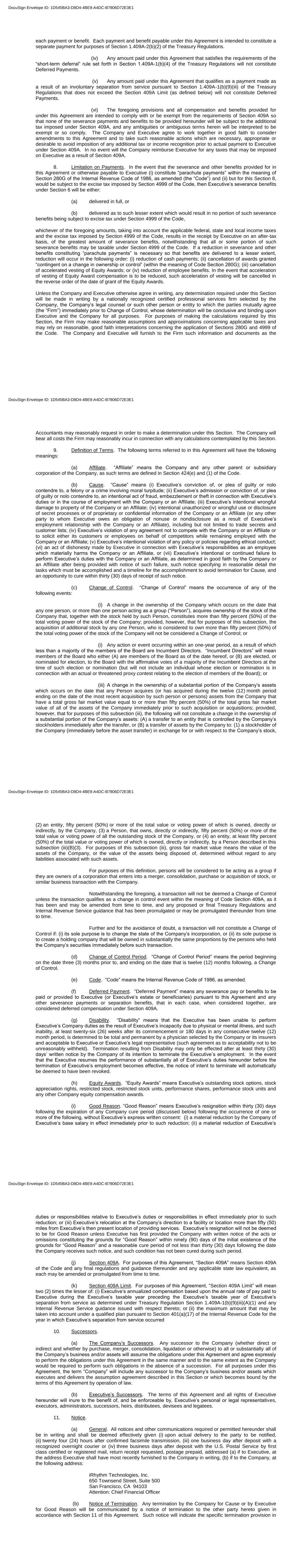 each payment or benefit. Each payment and benefit payable under this Agreement is intended to constitute a separate payment for purposes of Section 1.409A-2(b)(2) of the Treasury Regulations. (iv) Any amount paid under this Agreement that satisfies the requirements of the “short-term deferral” rule set forth in Section 1.409A-1(b)(4) of the Treasury Regulations will not constitute Deferred Payments. (v) Any amount paid under this Agreement that qualifies as a payment made as a result of an involuntary separation from service pursuant to Section 1.409A-1(b)(9)(iii) of the Treasury Regulations that does not exceed the Section 409A Limit (as defined below) will not constitute Deferred Payments. (vi) The foregoing provisions and all compensation and benefits provided for under this Agreement are intended to comply with or be exempt from the requirements of Section 409A so that none of the severance payments and benefits to be provided hereunder will be subject to the additional tax imposed under Section 409A, and any ambiguities or ambiguous terms herein will be interpreted to be exempt or so comply. The Company and Executive agree to work together in good faith to consider amendments to this Agreement and to take such reasonable actions which are necessary, appropriate or desirable to avoid imposition of any additional tax or income recognition prior to actual payment to Executive under Section 409A. In no event will the Company reimburse Executive for any taxes that may be imposed on Executive as a result of Section 409A. 8. Limitation on Payments. In the event that the severance and other benefits provided for in this Agreement or otherwise payable to Executive (i) constitute “parachute payments” within the meaning of Section 280G of the Internal Revenue Code of 1986, as amended (the “Code”) and (ii) but for this Section 8, would be subject to the excise tax imposed by Section 4999 of the Code, then Executive’s severance benefits under Section 6 will be either: (a) delivered in full, or (b) delivered as to such lesser extent which would result in no portion of such severance benefits being subject to excise tax under Section 4999 of the Code, whichever of the foregoing amounts, taking into account the applicable federal, state and local income taxes and the excise tax imposed by Section 4999 of the Code, results in the receipt by Executive on an after-tax basis, of the greatest amount of severance benefits, notwithstanding that all or some portion of such severance benefits may be taxable under Section 4999 of the Code. If a reduction in severance and other benefits constituting “parachute payments” is necessary so that benefits are delivered to a lesser extent, reduction will occur in the following order: (i) reduction of cash payments; (ii) cancellation of awards granted “contingent on a change in ownership or control” (within the meaning of Code Section 280G); (iii) cancellation of accelerated vesting of Equity Awards; or (iv) reduction of employee benefits. In the event that acceleration of vesting of Equity Award compensation is to be reduced, such acceleration of vesting will be cancelled in the reverse order of the date of grant of the Equity Awards. Unless the Company and Executive otherwise agree in writing, any determination required under this Section will be made in writing by a nationally recognized certified professional services firm selected by the Company, the Company’s legal counsel or such other person or entity to which the parties mutually agree (the “Firm”) immediately prior to Change of Control, whose determination will be conclusive and binding upon Executive and the Company for all purposes. For purposes of making the calculations required by this Section, the Firm may make reasonable assumptions and approximations concerning applicable taxes and may rely on reasonable, good faith interpretations concerning the application of Sections 280G and 4999 of the Code. The Company and Executive will furnish to the Firm such information and documents as the DocuSign Envelope ID: 1D545BA3-D8D4-4BE9-A4DC-B7806D72E3E1 Accountants may reasonably request in order to make a determination under this Section. The Company will bear all costs the Firm may reasonably incur in connection with any calculations contemplated by this Section. 9. Definition of Terms. The following terms referred to in this Agreement will have the following meanings: (a) Affiliate. “Affiliate” means the Company and any other parent or subsidiary corporation of the Company, as such terms are defined in Section 424(e) and (1) of the Code. (b) Cause. “Cause” means (i) Executive’s conviction of, or plea of guilty or nolo contendre to, a felony or a crime involving moral turpitude; (ii) Executive’s admission or conviction of, or plea of guilty or nolo contendre to, an intentional act of fraud, embezzlement or theft in connection with Executive’s duties or in the course of employment with the Company or an Affiliate; (iii) Executive’s intentional wrongful damage to property of the Company or an Affiliate; (iv) intentional unauthorized or wrongful use or disclosure of secret processes or of proprietary or confidential information of the Company or an Affiliate (or any other party to whom Executive owes an obligation of nonuse or nondisclosure as a result of Executive’s employment relationship with the Company or an Affiliate), including but not limited to trade secrets and customer lists; (iv) Executive’s violation of any agreement not to compete with the Company or an Affiliate or to solicit either its customers or employees on behalf of competitors while remaining employed with the Company or an Affiliate; (v) Executive’s intentional violation of any policy or policies regarding ethical conduct; (vi) an act of dishonesty made by Executive in connection with Executive’s responsibilities as an employee which materially harms the Company or an Affiliate, or (vii) 