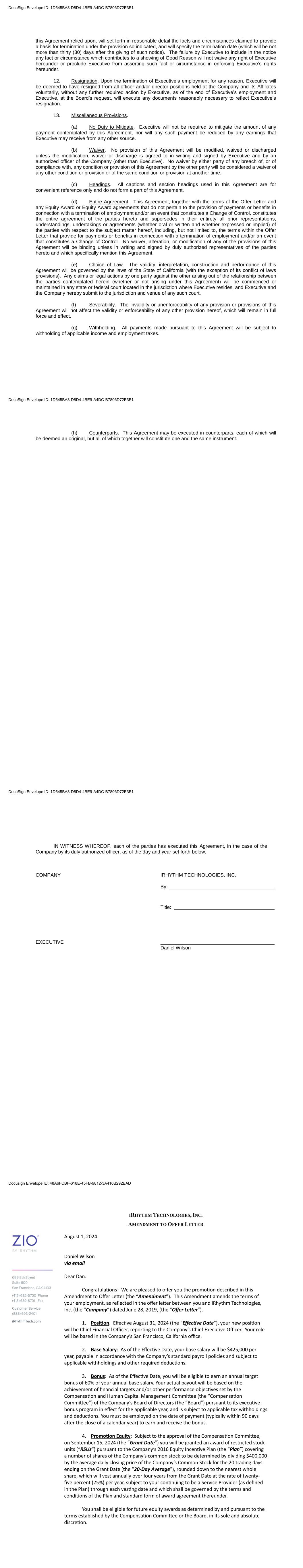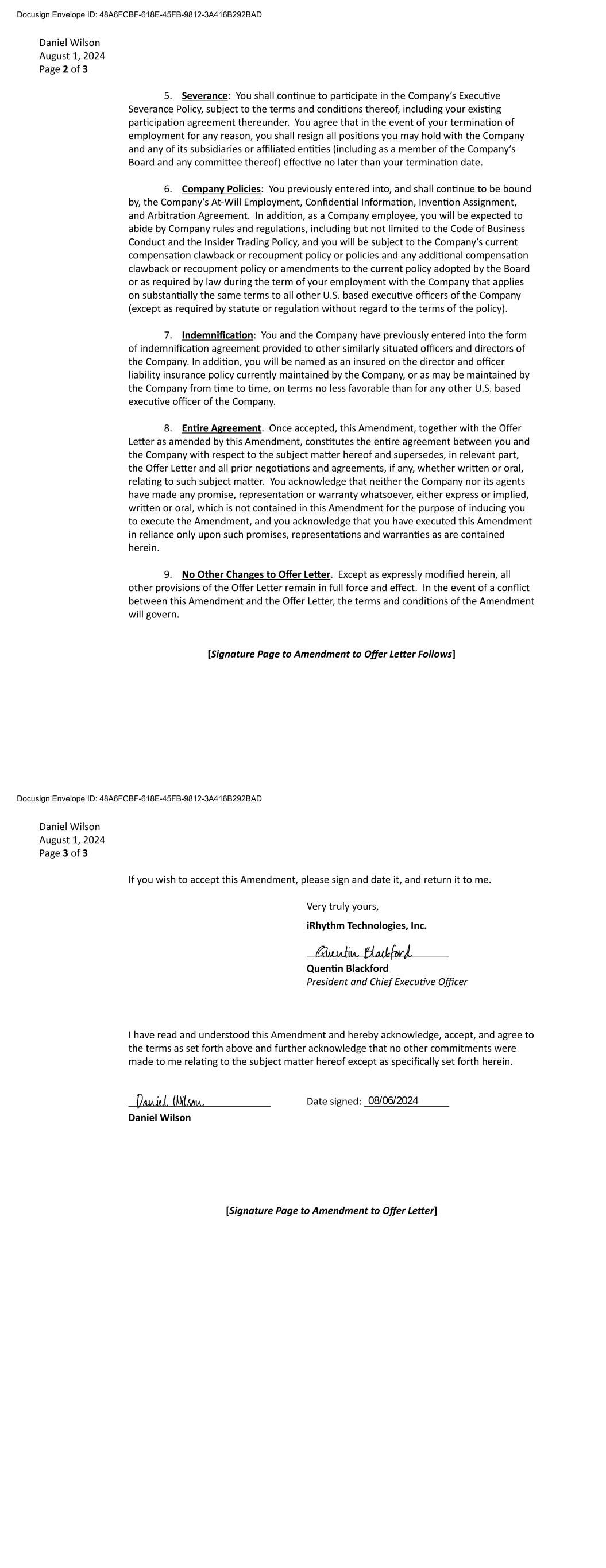 Daniel Wilson August 1, 2024 Page 2 of 3 5. Severance: You shall continue to participate in the Company’s Executive Severance Policy, subject to the terms and conditions thereof, including your existing participation agreement thereunder. You agree that in the event of your termination of employment for any reason, you shall resign all positions you may hold with the Company and any of its subsidiaries or affiliated entities (including as a member of the Company’s Board and any committee thereof) effective no later than your termination date. 6. Company Policies: You previously entered into, and shall continue to be bound by, the Company’s At-Will Employment, Confidential Information, Invention Assignment, and Arbitration Agreement. In addition, as a Company employee, you will be expected to abide by Company rules and regulations, including but not limited to the Code of Business Conduct and the Insider Trading Policy, and you will be subject to the Company’s current compensation clawback or recoupment policy or policies and any additional compensation clawback or recoupment policy or amendments to the current policy adopted by the Board or as required by law during the term of your employment with the Company that applies on substantially the same terms to all other U.S. based executive officers of the Company (except as required by statute or regulation without regard to the terms of the policy). 7. Indemnification: You and the Company have previously entered into the form of indemnification agreement provided to other similarly situated officers and directors of the Company. In addition, you will be named as an insured on the director and officer liability insurance policy currently maintained by the Company, or as may be maintained by the Company from time to time, on terms no less favorable than for any other U.S. based executive officer of the Company. 8. Entire Agreement. Once accepted, this Amendment, together with the Offer Letter as amended by this Amendment, constitutes the entire agreement between you and the Company with respect to the subject matter hereof and supersedes, in relevant part, the Offer Letter and all prior negotiations and agreements, if any, whether written or oral, relating to such subject matter. You acknowledge that neither the Company nor its agents have made any promise, representation or warranty whatsoever, either express or implied, written or oral, which is not contained in this Amendment for the purpose of inducing you to execute the Amendment, and you acknowledge that you have executed this Amendment in reliance only upon such promises, representations and warranties as are contained herein. 9. No Other Changes to Offer Letter. Except as expressly modified herein, all other provisions of the Offer Letter remain in full force and effect. In the event of a conflict between this Amendment and the Offer Letter, the terms and conditions of the Amendment will govern. [Signature Page to Amendment to Offer Letter Follows] Docusign Envelope ID: 48A6FCBF-618E-45FB-9812-3A416B292BAD Daniel Wilson August 1, 2024 Page 3 of 3 If you wish to accept this Amendment, please sign and date it, and return it to me. Very truly yours, iRhythm Technologies, Inc. Quentin Blackford President and Chief Executive Officer I have read and understood this Amendment and hereby acknowledge, accept, and agree to the terms as set forth above and further acknowledge that no other commitments were made to me relating to the subject matter hereof except as specifically set forth herein. Date signed: Daniel Wilson [Signature Page to Amendment to Offer Letter] Docusign Envelope ID: 48A6FCBF-618E-45FB-9812-3A416B292BAD 08/06/2024