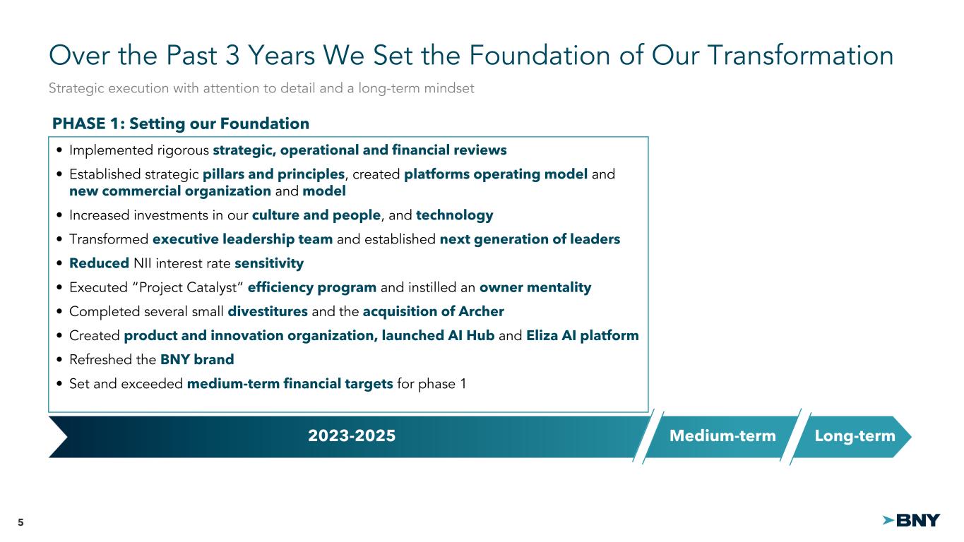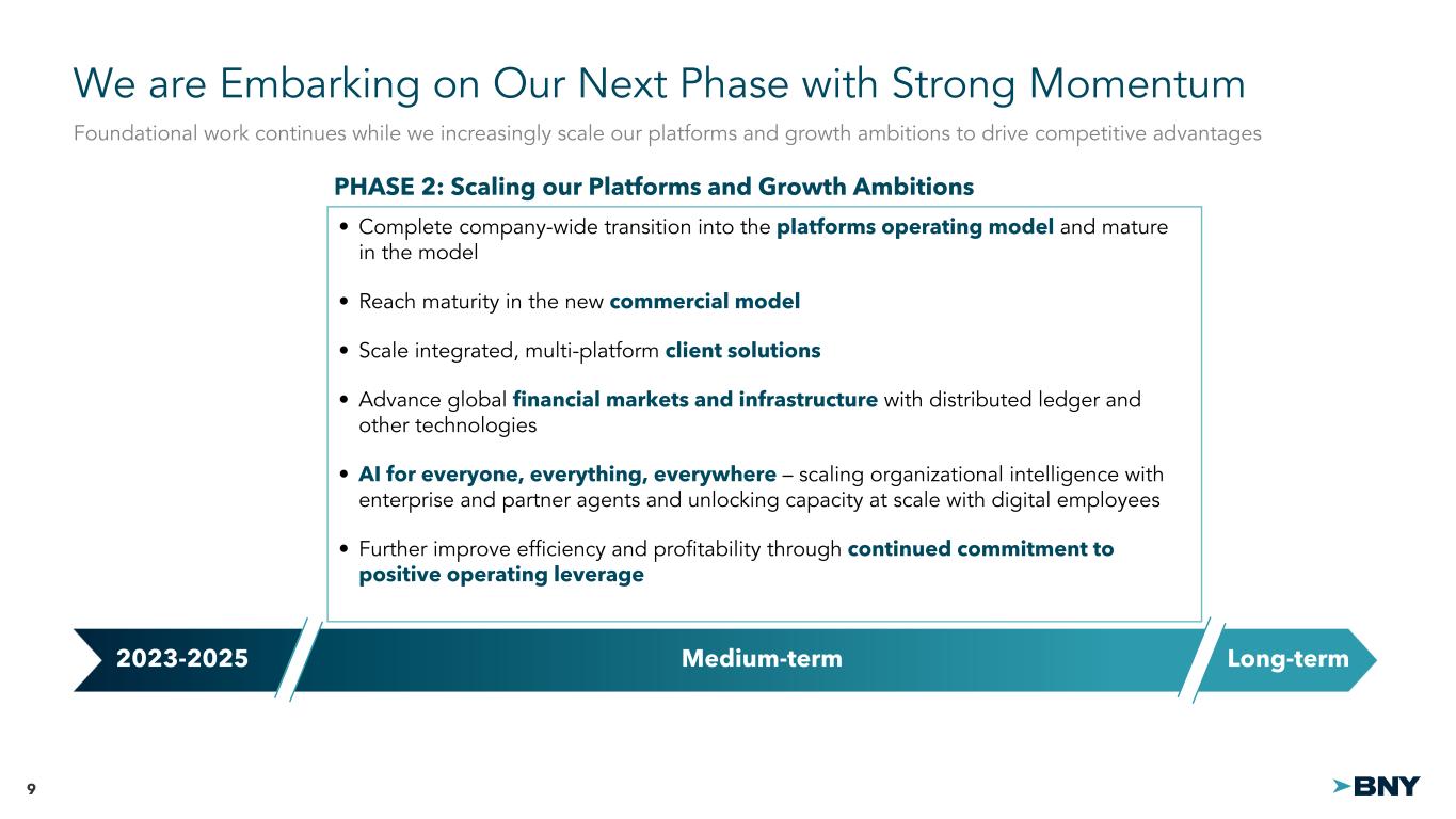 | 3年前、我々はBNYの複数年にわたる変革に着手した。2年前、我々はその取り組みの第一段階、基盤構築期と位置付けた戦略ロードマップと中期財務目標を公表した。これまでの進捗のペースと成果は、この戦略が機能していることを示している。 |