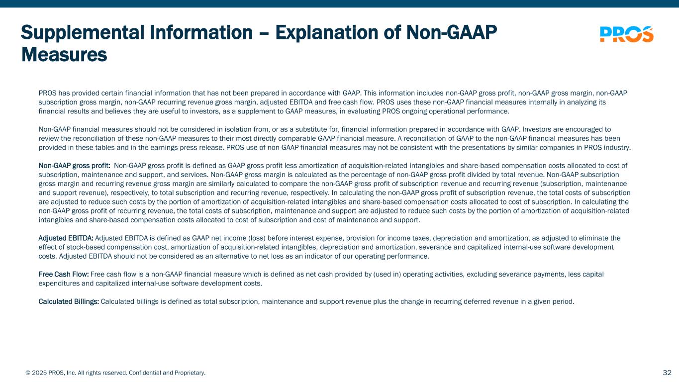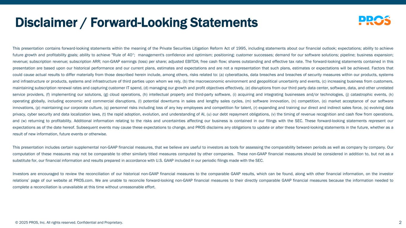 この発表に伴い、プロスホールディングスは2025年7月31日(木)午後4時45分(米国東部時間)より、当社の決算および業績見通しに関する電話会議を開催いたします。この電話会議に参加するには、1-877-407-9039(フリーダイヤル)または1-201-689-8470にお電話ください。このコールのライブおよびアーカイブのウェブキャストは、当社ウェブサイトの「投資家向け情報」セクション(www.pros.com)からアクセスできます。