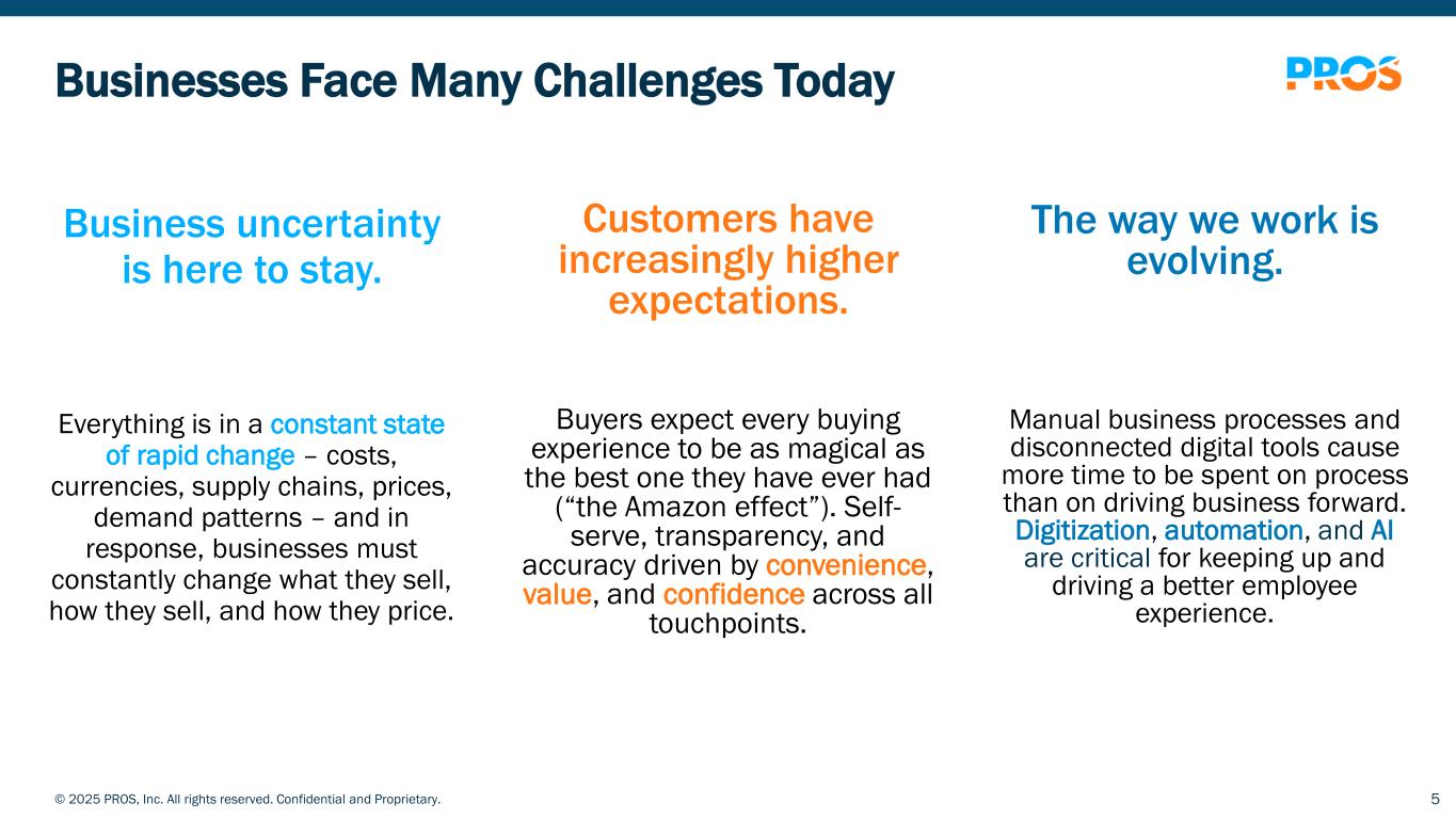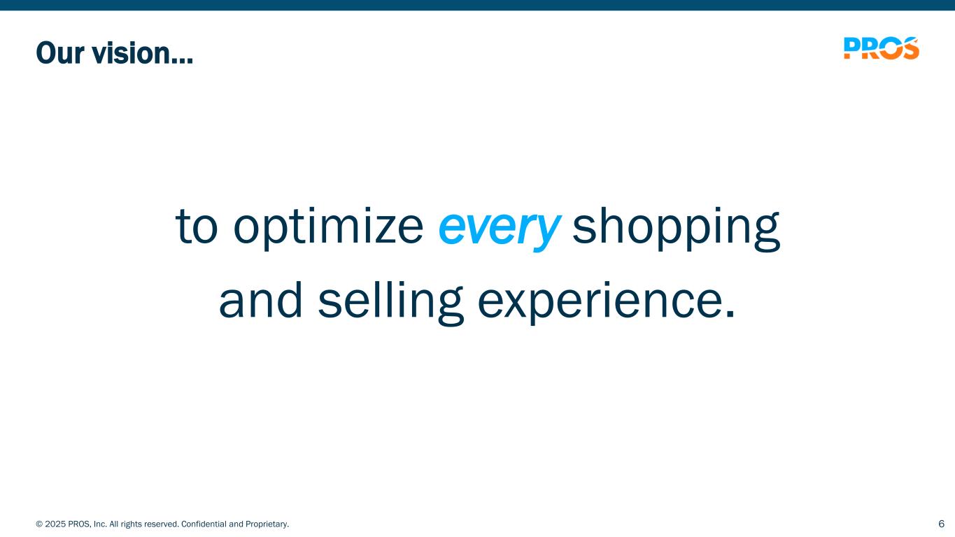 PROS Holdings, Inc. (NYSE: PRO) は、オムニチャネルのショッピングと販売体験を最適化し、インテリジェント・コマースを実現するSaaSソリューションのリーディング・プロバイダです。収益と価格科学のリーダーシップを活用し、予測AI、リアルタイム分析、強力な自動化を組み合わせたPROSプラットフォームは、オファーとバイヤー、価格と商品を動的にマッチングさせます。PROSによって、企業はより多くの利益を得ることができます。詳しくはpros.comをご覧ください。