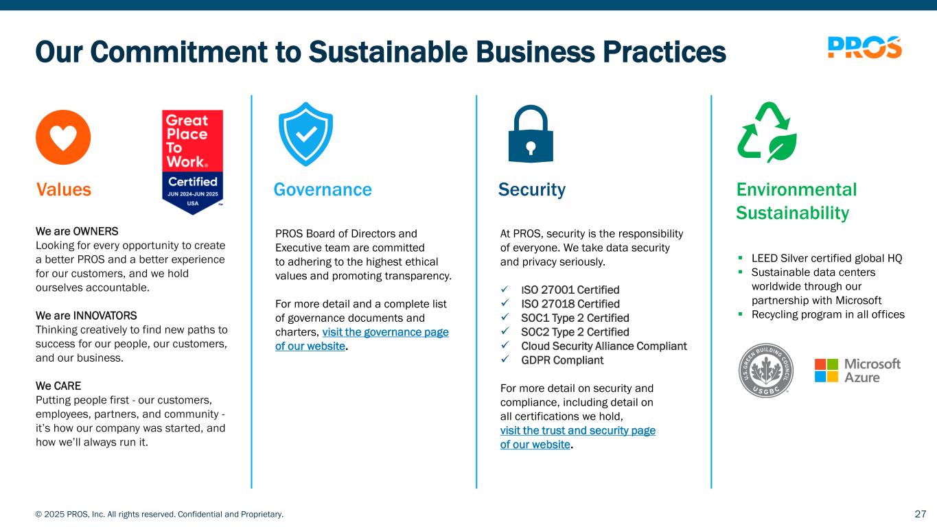 -これは、継続的なイノベーション、厳格なガバナンス、業界をリードする実践を通じて、データの完全性、可用性、機密性を保護する PROS の深いコミットメントを評価したものです。