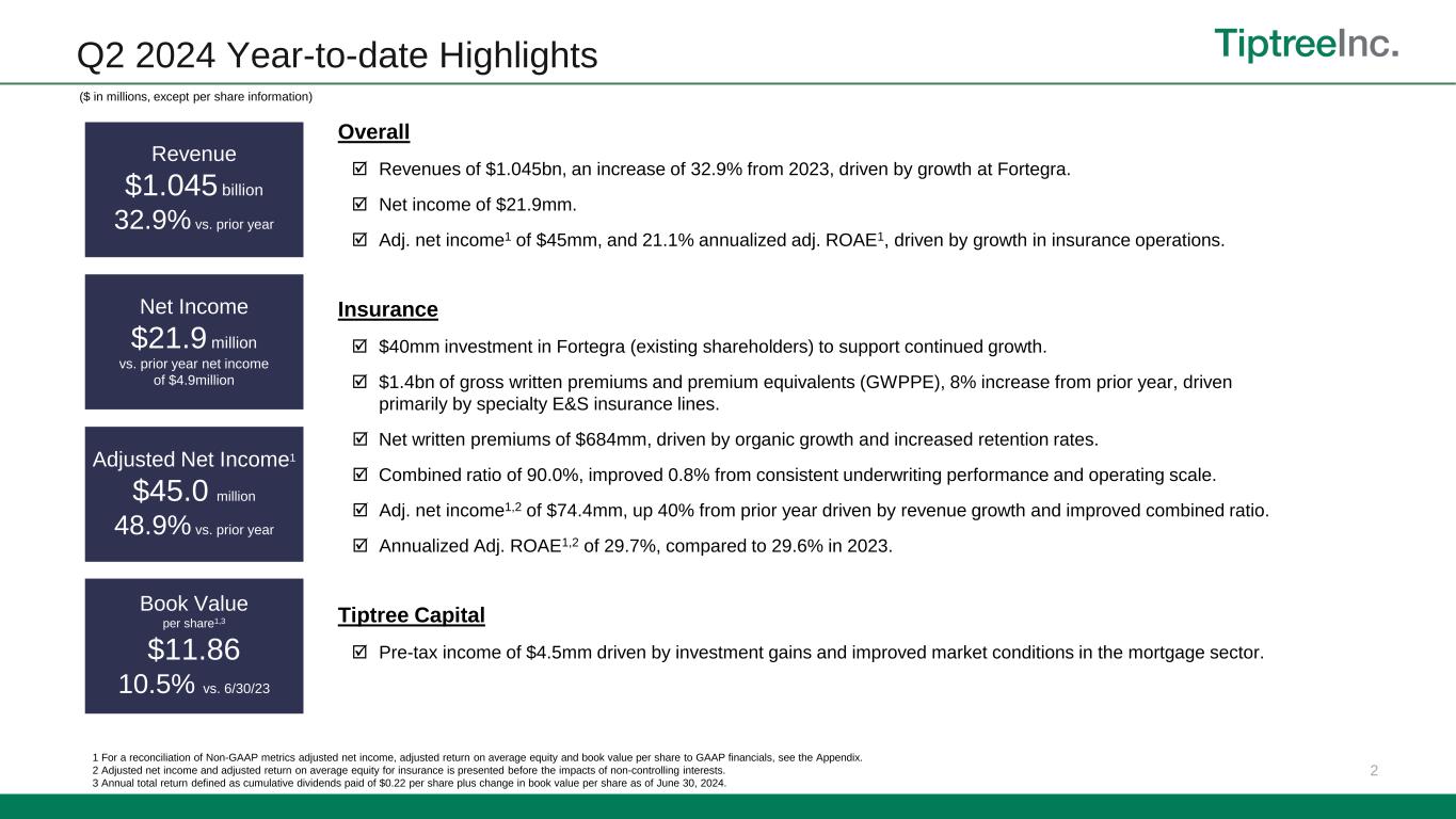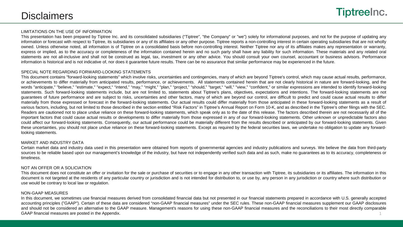 1 Disclaimers LIMITATIONS ON THE USE OF INFORMATION This presentation has been prepared by Tiptree Inc. and its consolidated subsidiaries (“Tiptree", "the Company" or "we”) solely for informational purposes, and not for the purpose of updating any information or forecast with respect to Tiptree, its subsidiaries or any of its affiliates or any other purpose. Tiptree reports a non-controlling interest in certain operating subsidiaries that are not wholly owned. Unless otherwise noted, all information is of Tiptree on a consolidated basis before non-controlling interest. Neither Tiptree nor any of its affiliates makes any representation or warranty, express or implied, as to the accuracy or completeness of the information contained herein and no such party shall have any liability for such information. These materials and any related oral statements are not all-inclusive and shall not be construed as legal, tax, investment or any other advice. You should consult your own counsel, accountant or business advisors. Performance information is historical and is not indicative of, nor does it guarantee future results. There can be no assurance that similar performance may be experienced in the future. SPECIAL NOTE REGARDING FORWARD-LOOKING STATEMENTS This document contains "forward-looking statements" which involve risks, uncertainties and contingencies, many of which are beyond Tiptree's control, which may cause actual results, performance, or achievements to differ materially from anticipated results, performance, or achievements. All statements contained herein that are not clearly historical in nature are forward-looking, and the words "anticipate," "believe," "estimate," "expect,“ “intend,” “may,” “might,” "plan," “project,” “should,” "target,“ “will,” "view," “confident,” or similar expressions are intended to identify forward-looking statements. Such forward-looking statements include, but are not limited to, statements about Tiptree's plans, objectives, expectations and intentions. The forward-looking statements are not guarantees of future performance and are subject to risks, uncertainties and other factors, many of which are beyond our control, are difficult to predict and could cause actual results to differ materially from those expressed or forecast in the forward-looking statements. Our actual results could differ materially from those anticipated in these forward-looking statements as a result of various factors, including, but not limited to those described in the section entitled “Risk Factors” in Tiptree’s Annual Report on Form 10-K, and as described in the Tiptree’s other filings with the SEC. Readers are cautioned not to place undue reliance on these forward-looking statements, which speak only as to the date of this release. The factors described therein are not necessarily all of the important factors that could cause actual results or developments to differ materially from those expressed in any of our forward-looking statements. Other unknown or unpredictable factors also could affect our forward-looking statements. Consequently, our actual performance could be materially different from the results described or anticipated by our forward-looking statements. Given these uncertainties, you should not place undue reliance on these forward-looking statements. Except as required by the federal securities laws, we undertake no obligation to update any forward- looking statements. MARKET AND INDUSTRY DATA Certain market data and industry data used in this presentation were obtained from reports of governmental agencies and industry publications and surveys. We believe the data from third-party sources to be reliable based upon our management’s knowledge of the industry, but have not independently verified such data and as such, make no guarantees as to its accuracy, completeness or timeliness. NOT AN OFFER OR A SOLICIATION This document does not constitute an offer or invitation for the sale or purchase of securities or to engage in any other transaction with Tiptree, its subsidiaries or its affiliates. The information in this document is not targeted at the residents of any particular country or jurisdiction and is not intended for distribution to, or use by, any person in any jurisdiction or country where such distribution or use would be contrary to local law or regulation. NON-GAAP MEASURES In this document, we sometimes use financial measures derived from consolidated financial data but not presented in our financial statements prepared in accordance with U.S. generally accepted accounting principles ("GAAP"). Certain of these data are considered “non-GAAP financial measures” under the SEC rules. These non-GAAP financial measures supplement our GAAP disclosures and should not be considered an alternative to the GAAP measure. Management's reasons for using these non-GAAP financial measures and the reconciliations to their most directly comparable GAAP financial measures are posted in the Appendix.